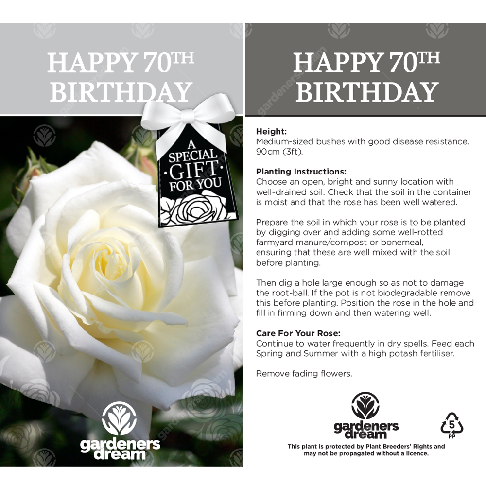 All of our gift roses are potted and presented with a large, attractive colour label with a picture and care instructions. We’ll also include a small personalised gift card on which you can write any special message you wish to include with your rose. If you would like us to write this out for you prior to dispatch, please contact us immediately after purchase with your message.