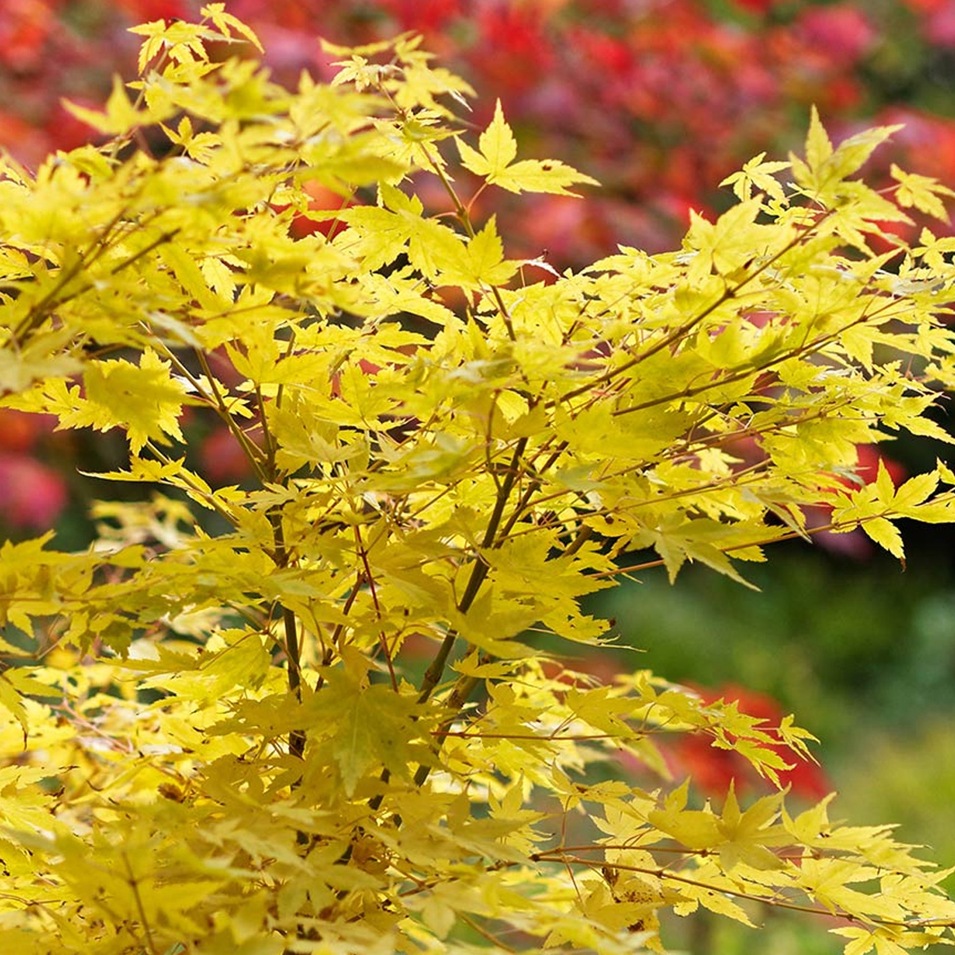 Acer palmatum 'Bi Hō' is a deciduous shrub with leaves that vary in colour throughout the year. Its lobed foliage appears yellow-green shade in Spring, right through to Autumn when yellow and orange takes over. After this, the foliage drops off to show beautiful golden-yellow and orange stems throughout Winter. The plant can be grown as a small tree and will reach an ultimate height and spread of 1.5 - 2.5m.