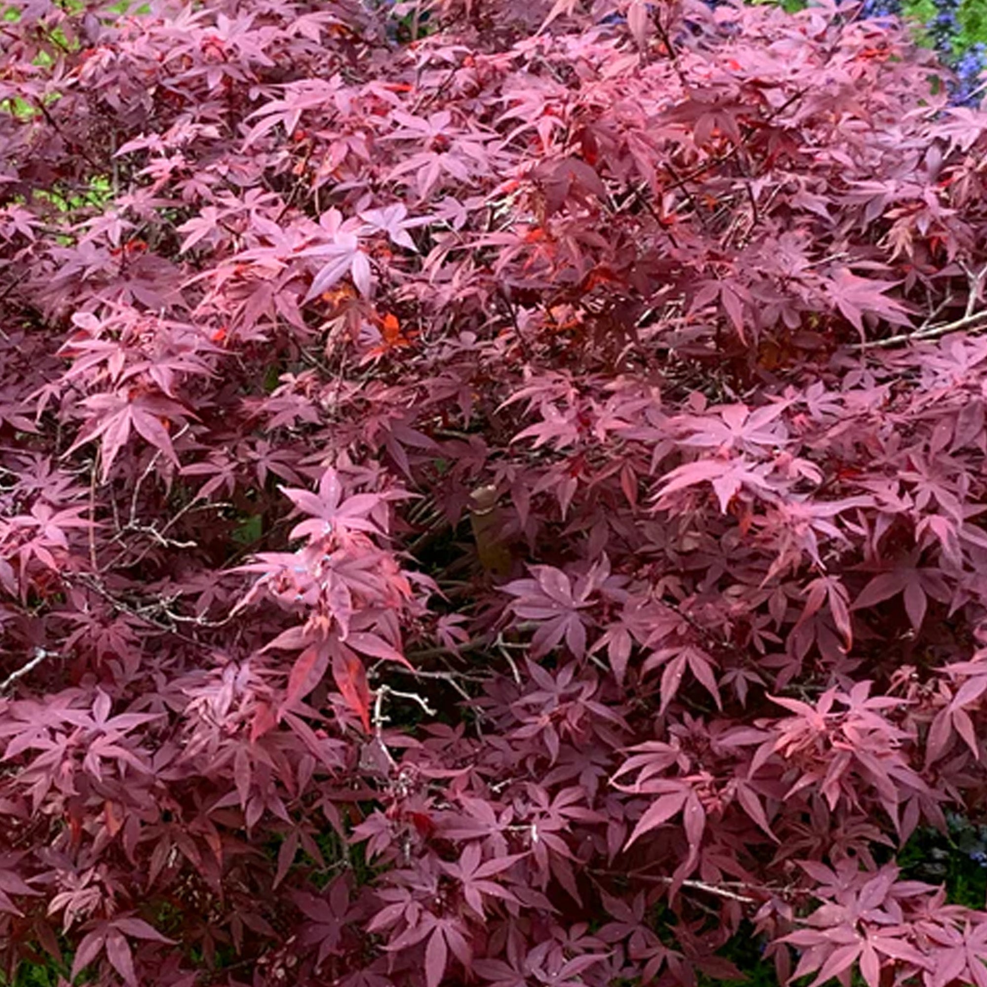 This Acer palmatum Hime-Shojo is a gorgeous dwarf variety of Japanese Maple with a rounded mound of foliage that changes colour from Spring through to Autumn. The deciduous shrub morphs from bright red with a touch of pink in Spring through purple-red and settles on a fiery orange-red hue before the leaves fall for Winter. Small red insignificant flowers often appear on mature plants in Spring and are followed by winged seed pods.