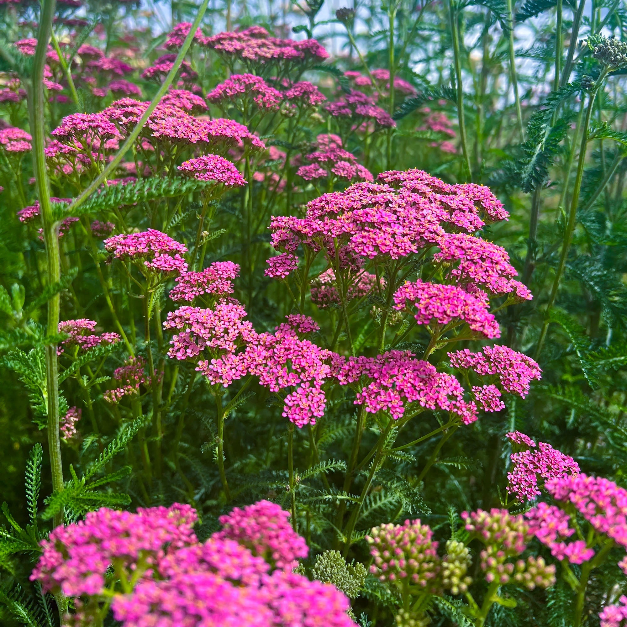 Add a burst of rich pink colour to your garden with the Achillea ‘Cerise Queen’. This striking Yarrow variety produces flat-topped clusters of vivid cerise blooms above soft, feathery green foliage. Flowering from early summer through to the first frosts, it creates a long-lasting display that complements both contemporary and traditional planting schemes.
