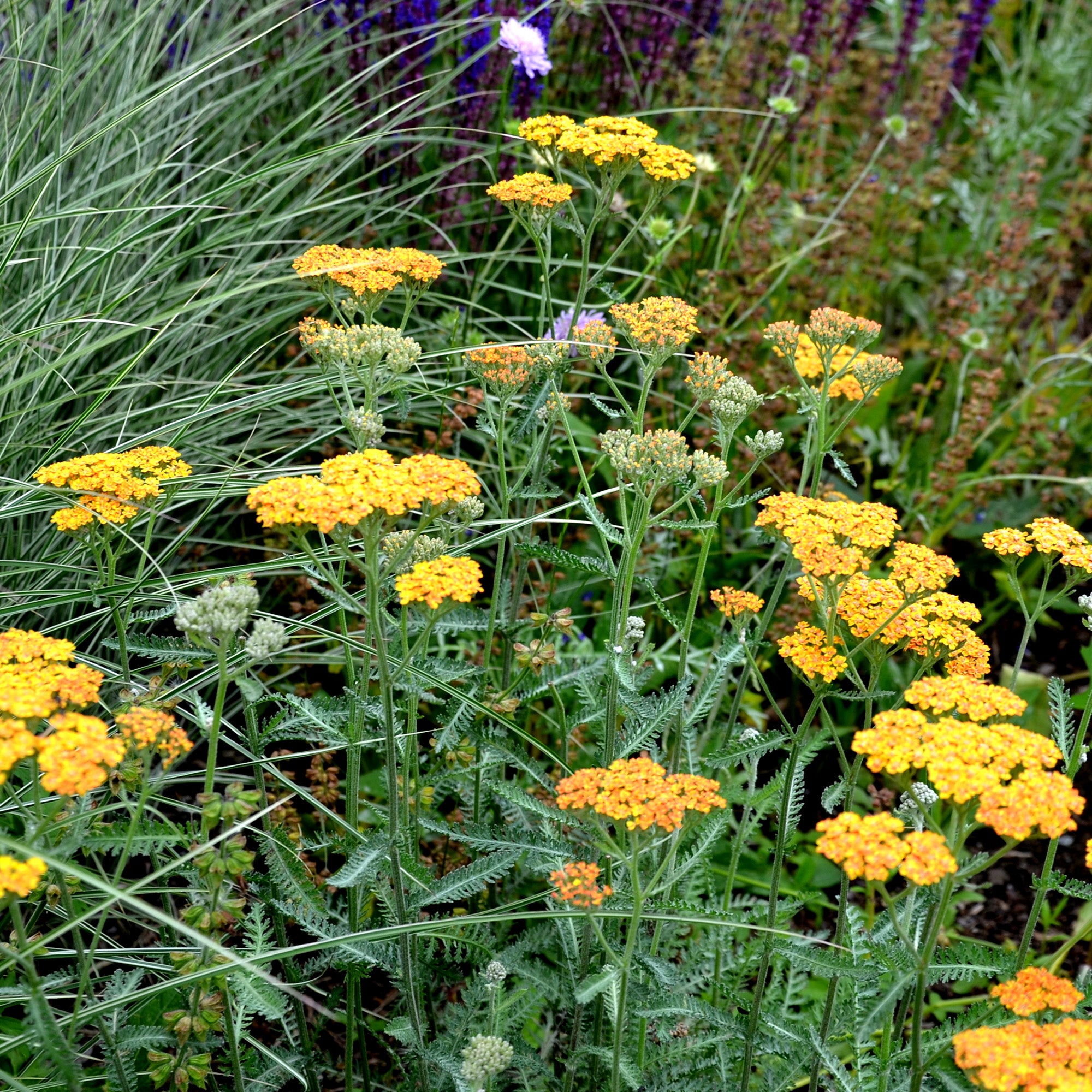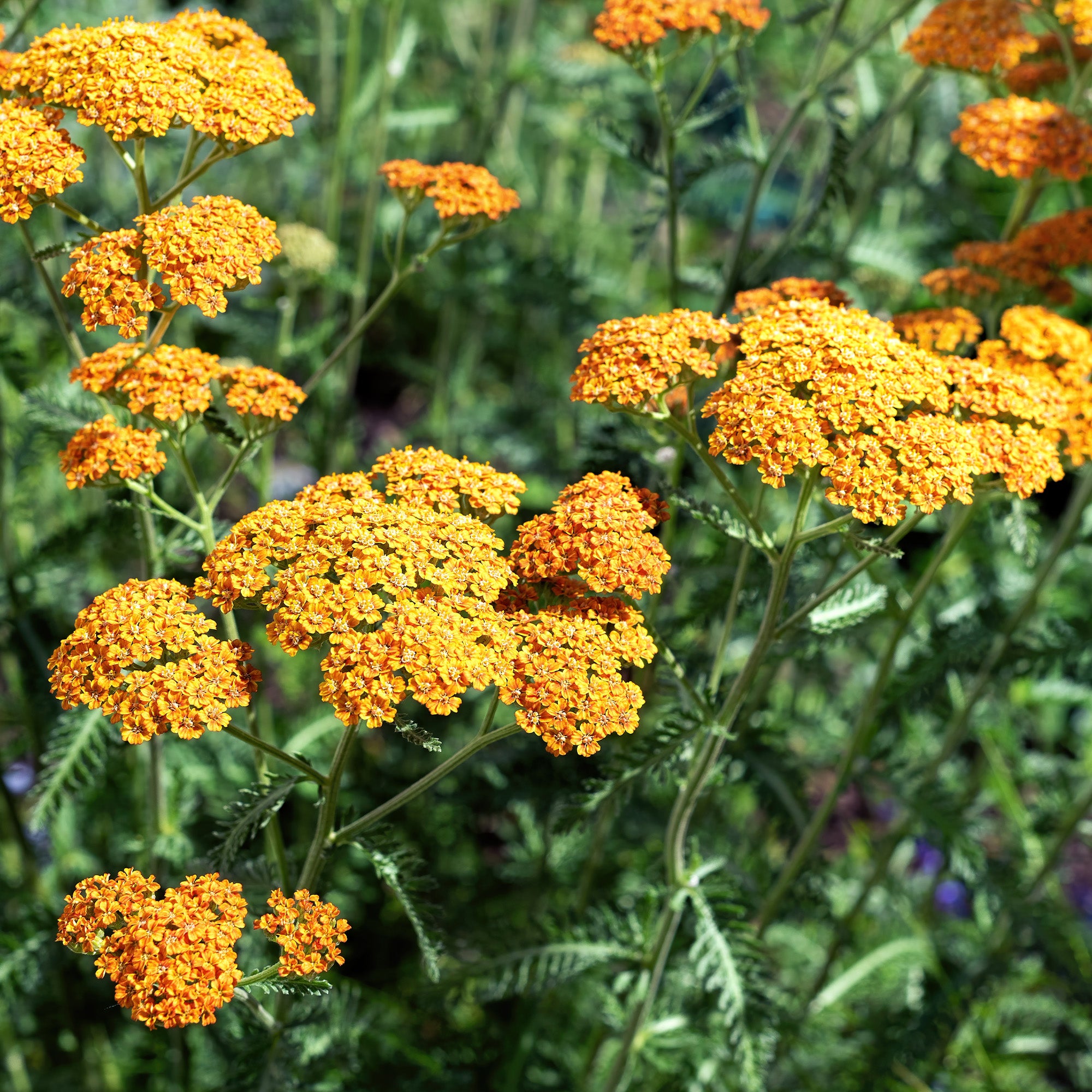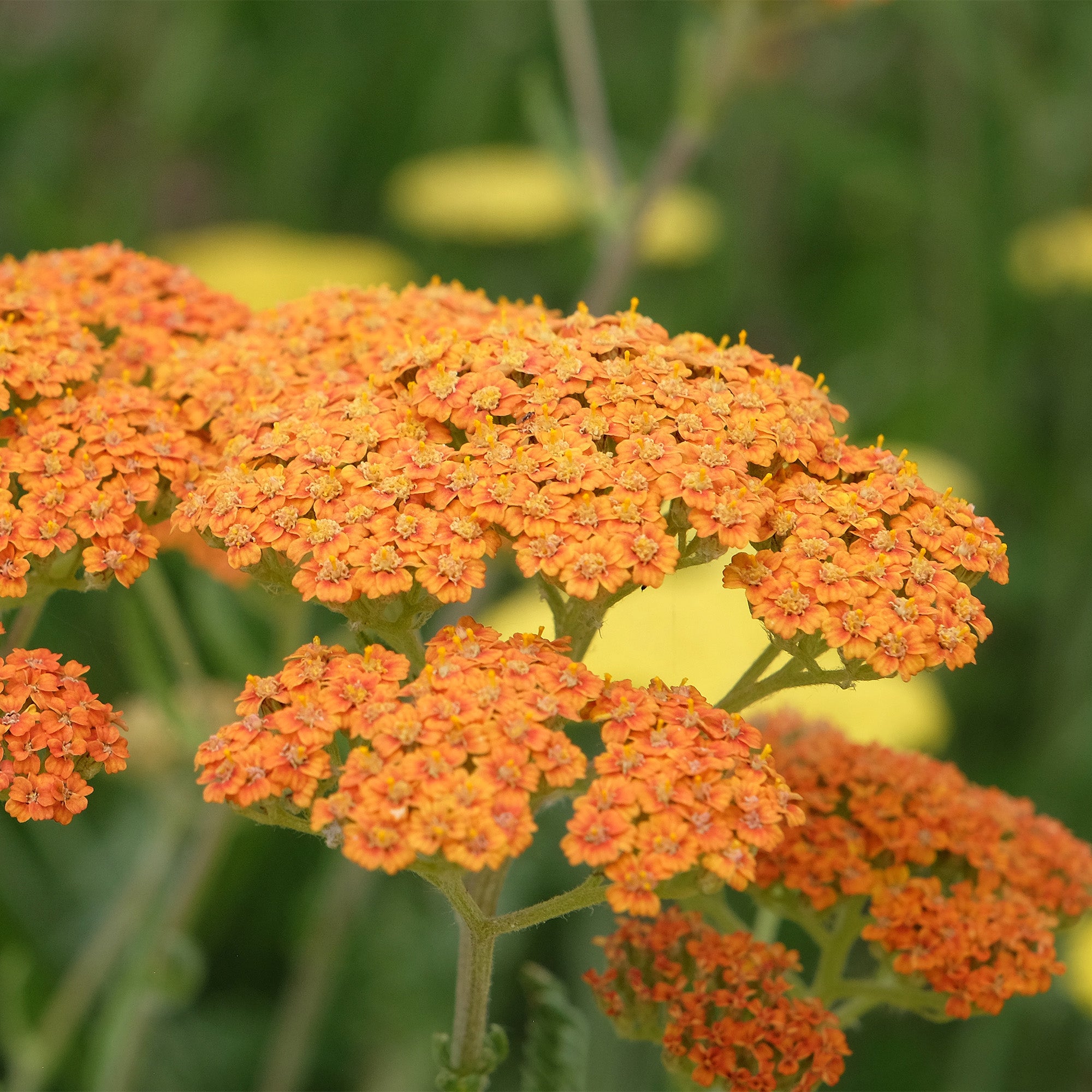 Add warm, earthy tones to your garden with Achillea ‘Terracotta’. This distinctive variety produces clusters of burnt orange and deep yellow blooms that subtly fade to softer shades of cream as the season progresses. The flat-topped flower heads rise above feathery silver-green foliage, creating a striking contrast and a natural, informal look that blends beautifully with other summer flowers.