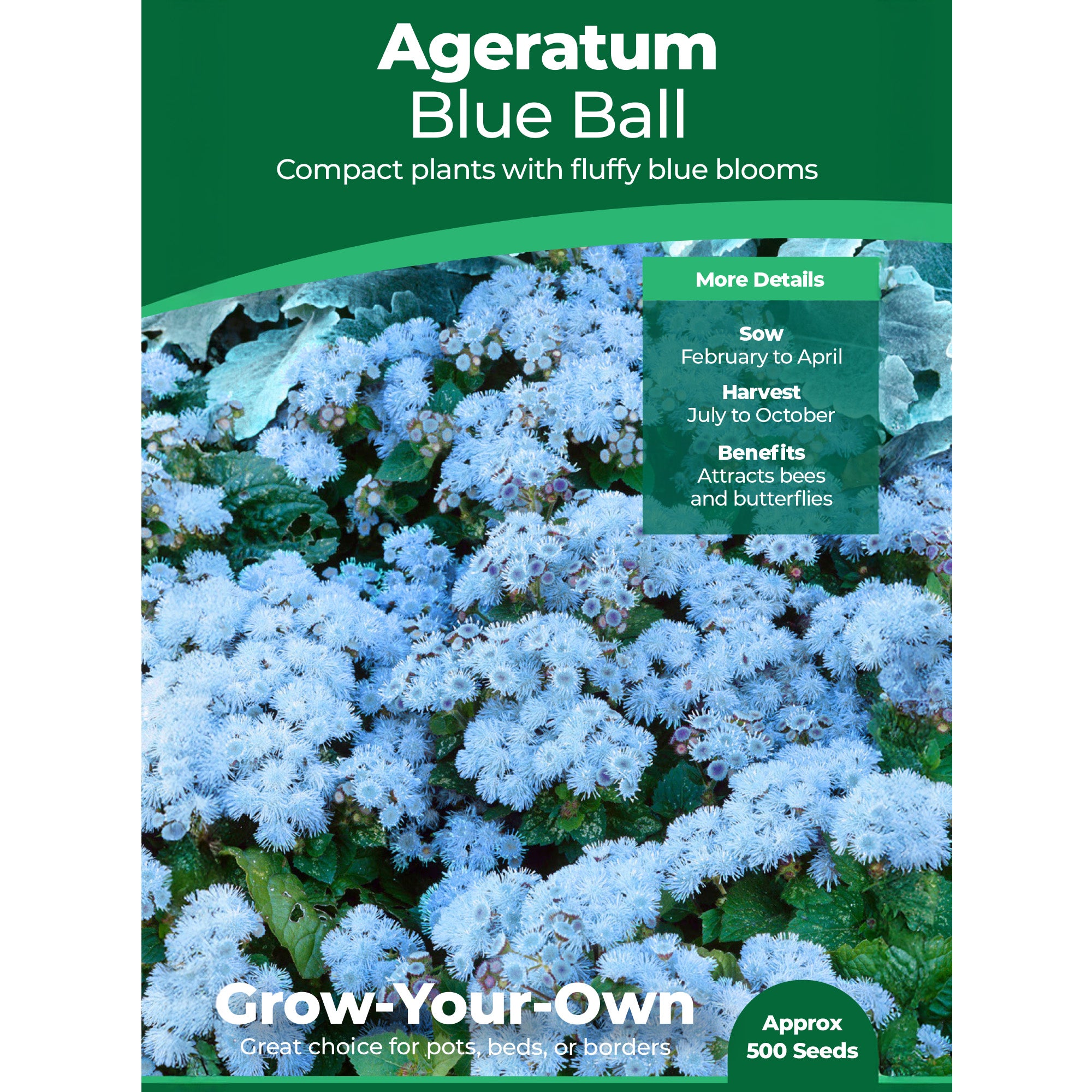 Ageratum Blue Ball is an eye-catching addition to any flower bed or border but is also well-suited to container gardening and looks stunning brightening up patio pots. This compact annual grows to around 25cm and is covered with rounded clusters of small fluffy flowers throughout summer and well into autumn. These blooms are a magnet for bees and butterflies, attracting welcome pollinators into the garden.