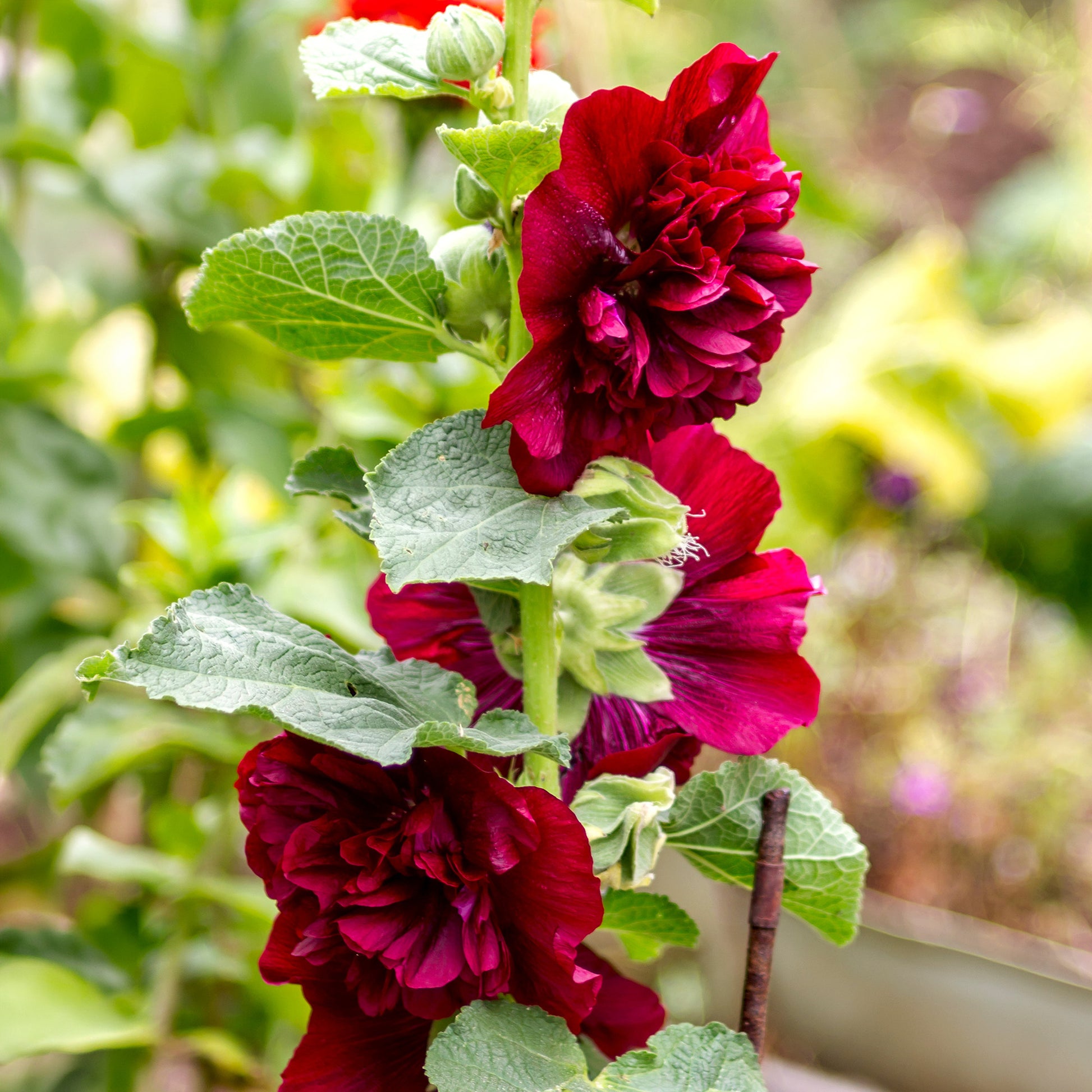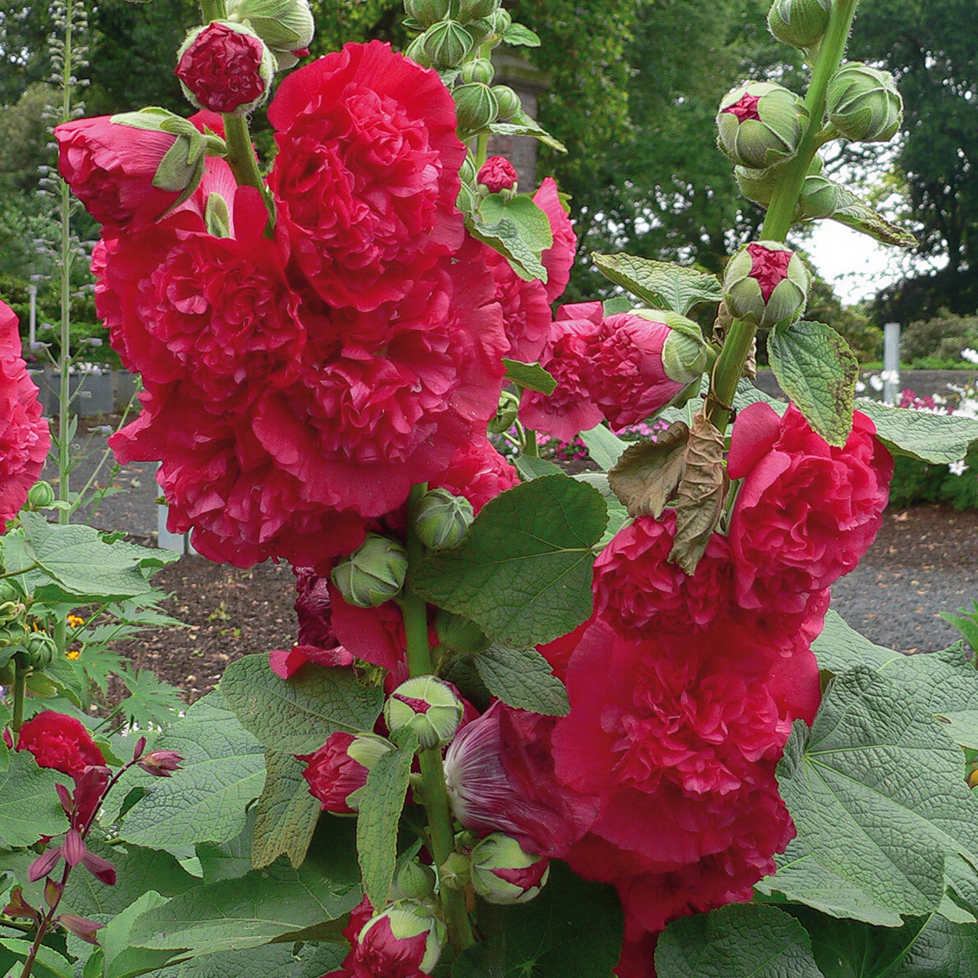 Plant Hollyhock in a sunny, well drained spot and water regularly while it settles in, allowing the soil to dry slightly between waterings once established. A sheltered position helps the tall stems stay upright, and removing faded blooms will encourage further flowering and keep the plant looking its best throughout the season. With just a little attention, Alcea Double Scarlet rewards you with a graceful summer display and a timeless presence in the garden.