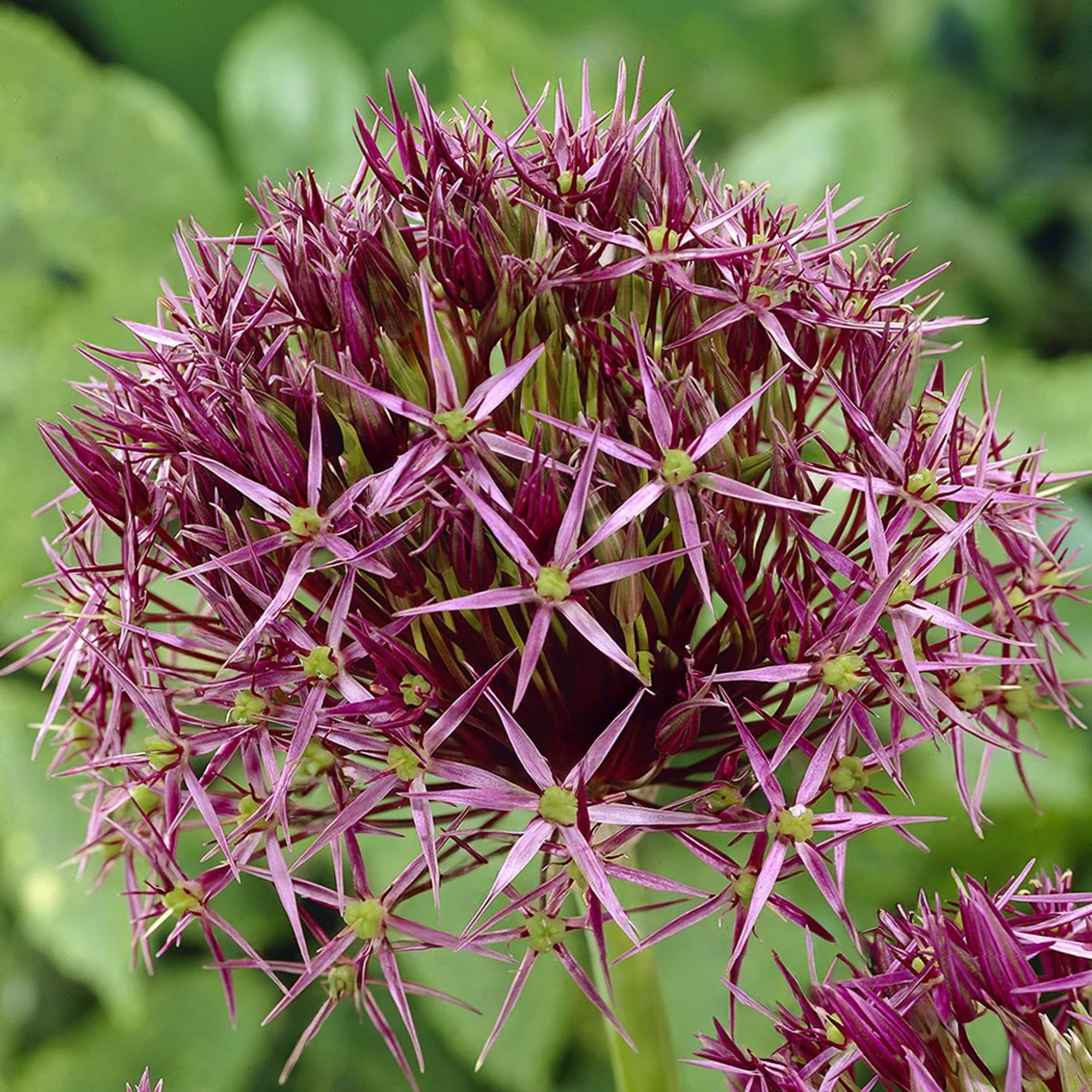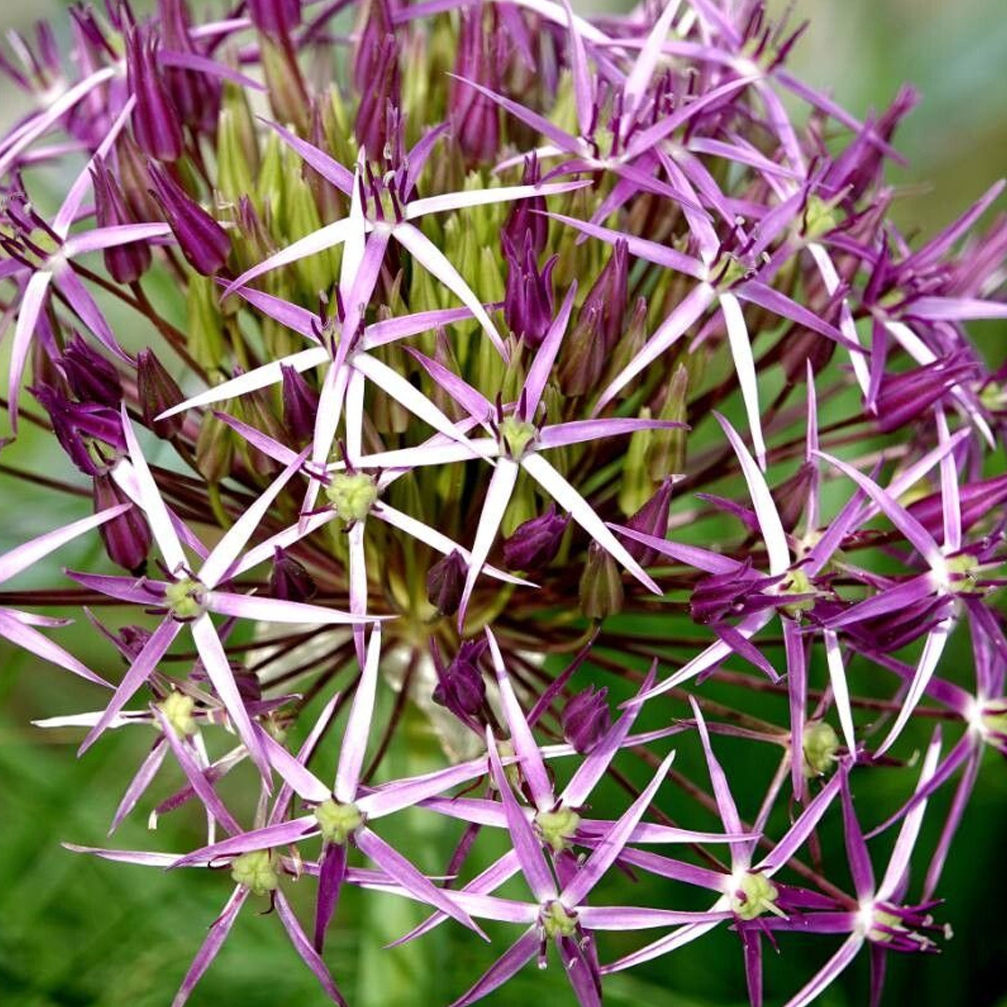 Allium Christophii is an ornamental onion with a few narrow, dark-green leaves towards the base, on the top of the main stem forms a spherical umbel densely packed with star-shaped flowers with very narrow petals and a green eye or ovary. Flowerhead or umbel is approximately 25-30cm in diameter of exquisite purples with silvery touches.