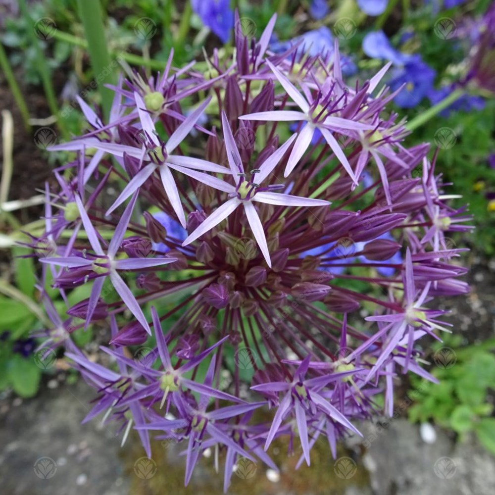 Allium Christophii is an ornamental onion with a few narrow, dark-green leaves towards the base, on the top of the main stem forms a spherical umbel densely packed with star-shaped flowers with very narrow petals and a green eye or ovary. Flowerhead or umbel is approximately 25-30cm in diameter of exquisite purples with silvery touches.