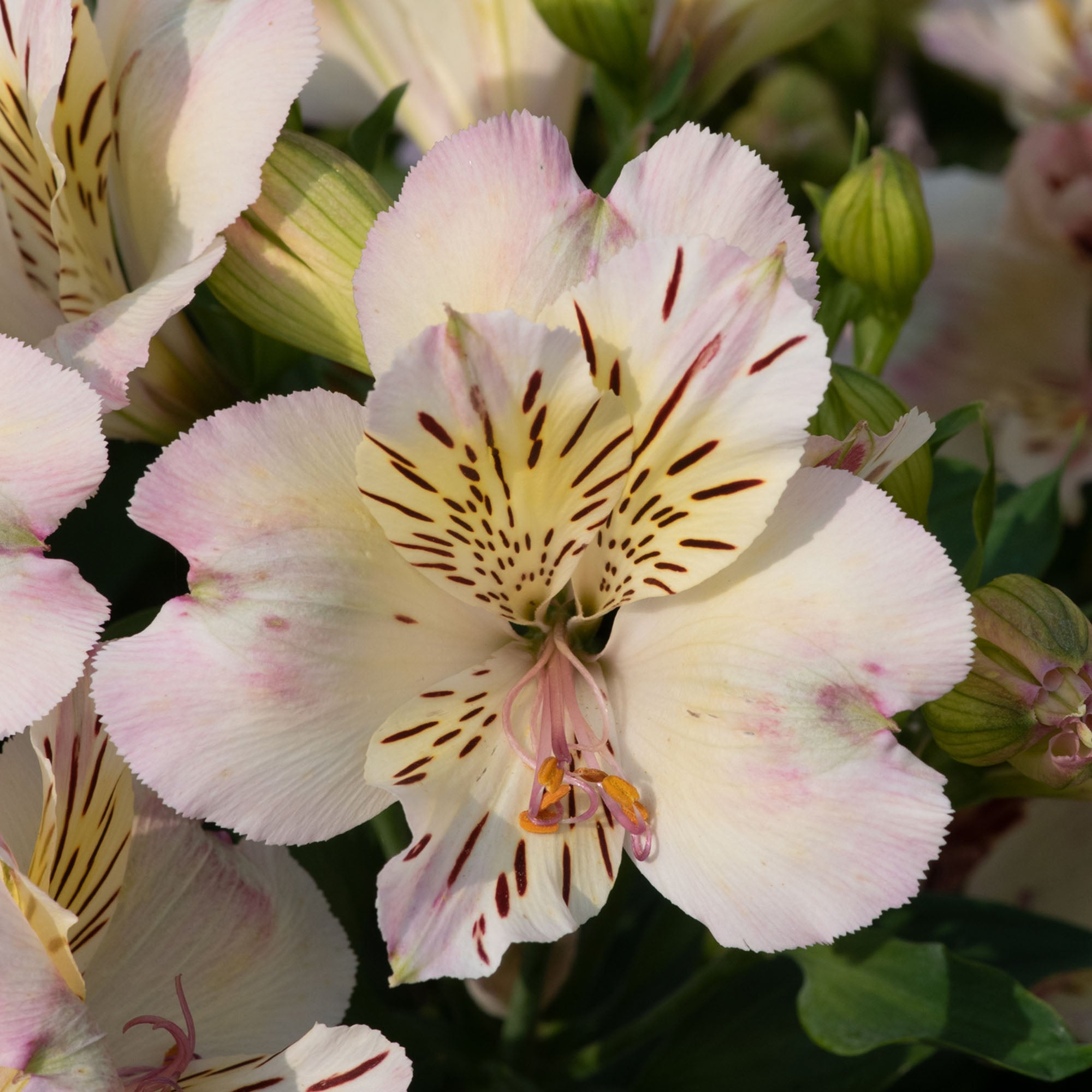 Times Valley is a charming Alstroemeria cultivar with lush green foliage and masses of long-lasting creamy-white summer blooms. These eye-catching flowers are speckled brown and accented with subtle pink with pale yellow in the centre, creating an elegant effect. They are also irresistible to bees, butterflies, and other pollinators, turning your garden into a buzzing hive of activity.
