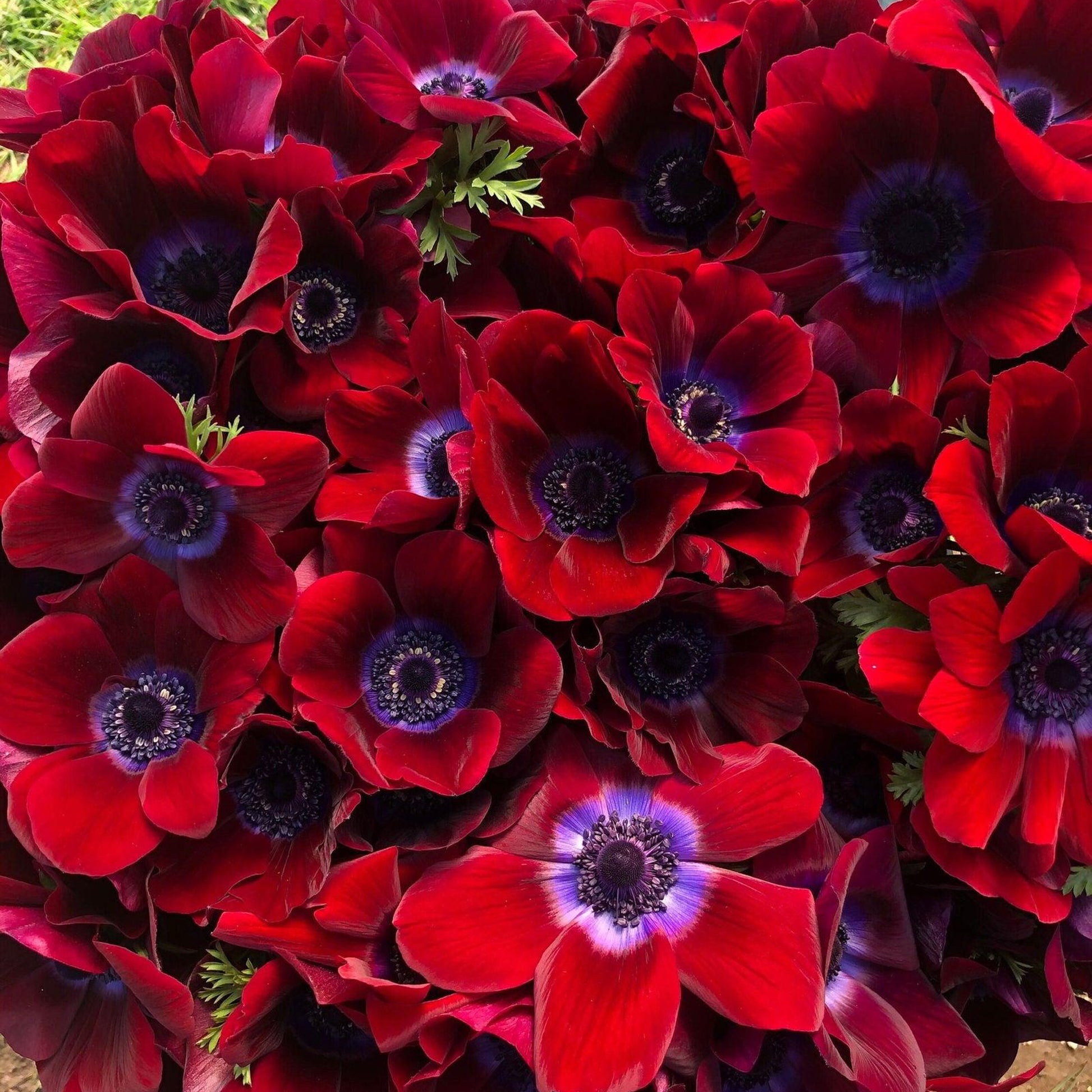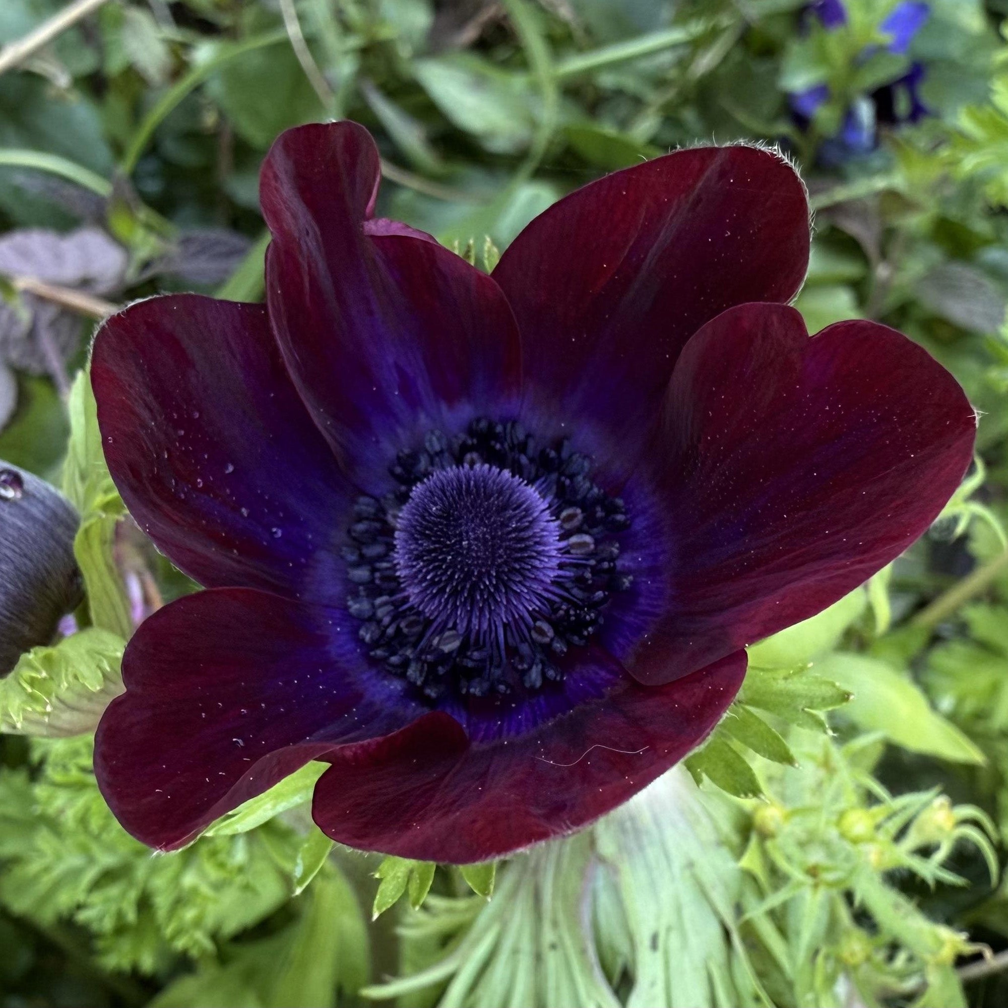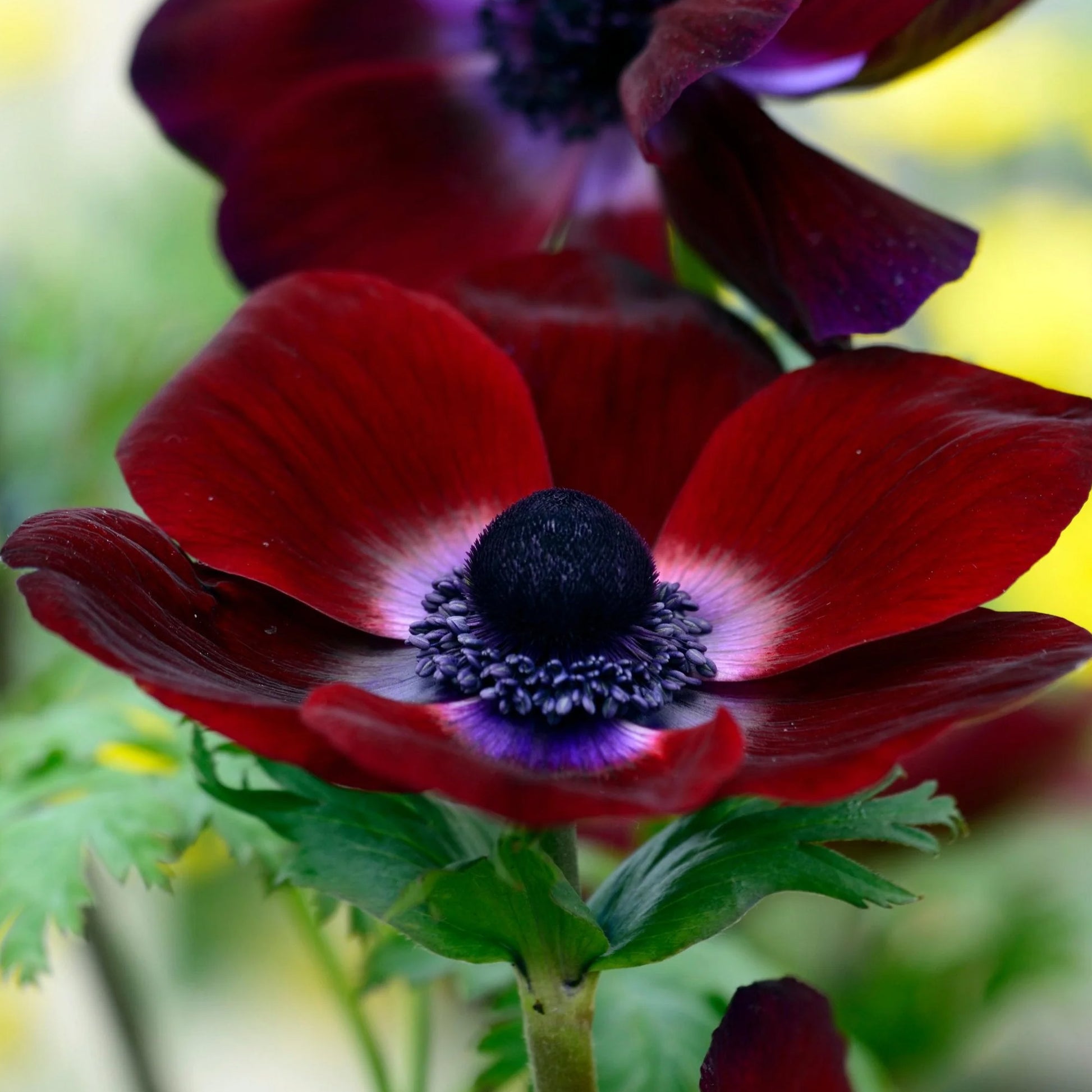 Anemone Bordeaux has deep burgundy shades on its velvety petals with deep purple eyes or centres. Intricately serrated green foliage, reminiscent of broad leaf parsley, complements the beautiful blooms.
