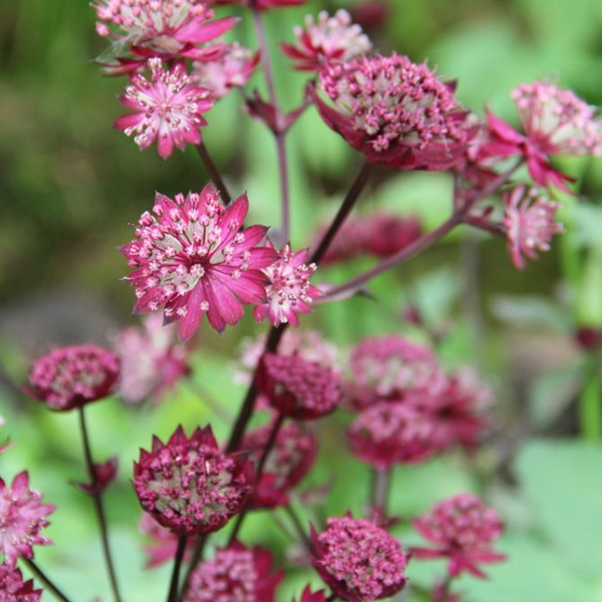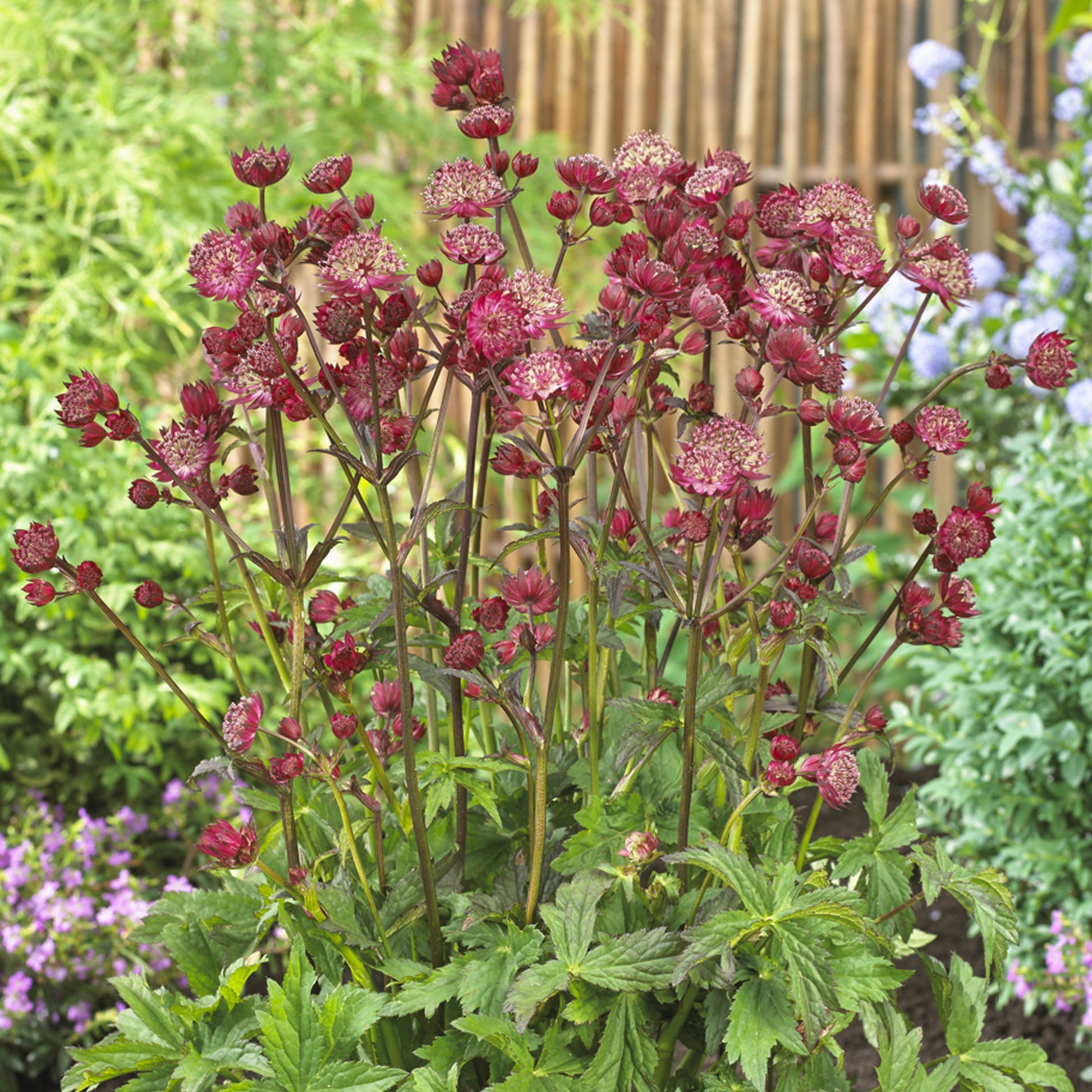 Also known as Masterwort, Astrantia Star of Love is a clump forming deciduous perennial that makes an attractive addition to any garden as well as being perfect for drying and flower arranging. Its striking burgundy flowers bloom from June to September while the green foliage gives way to striking purple stems, providing additional colour interest.