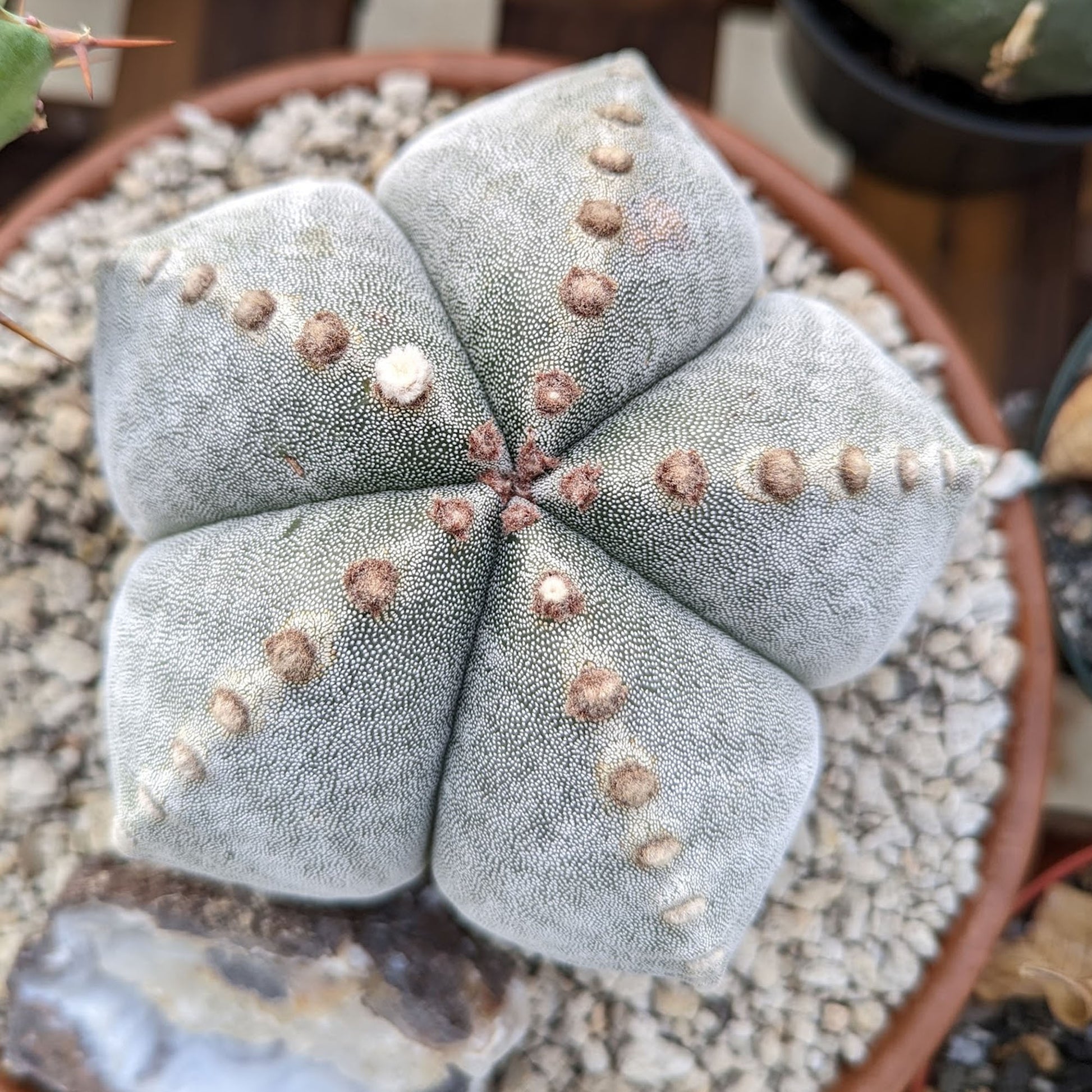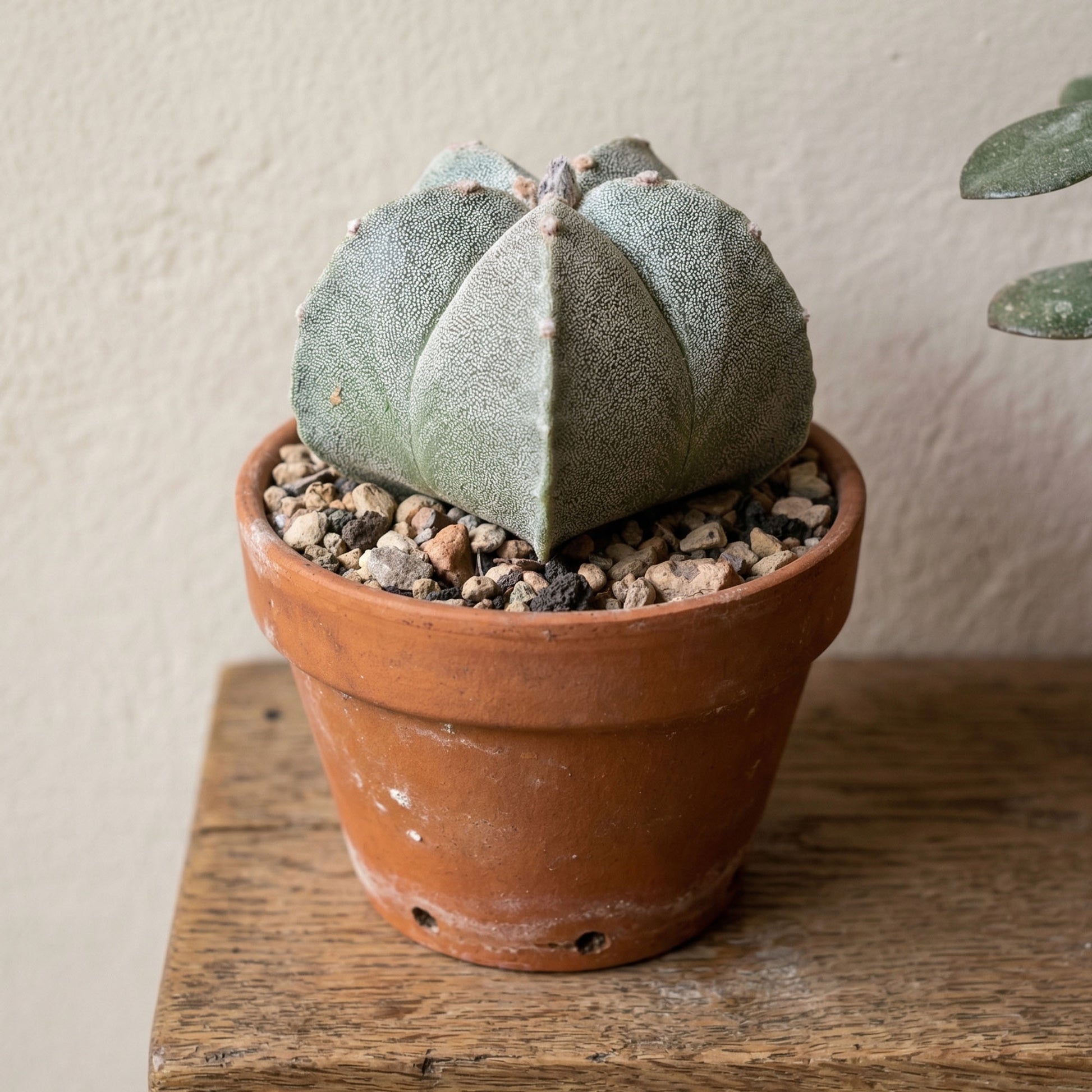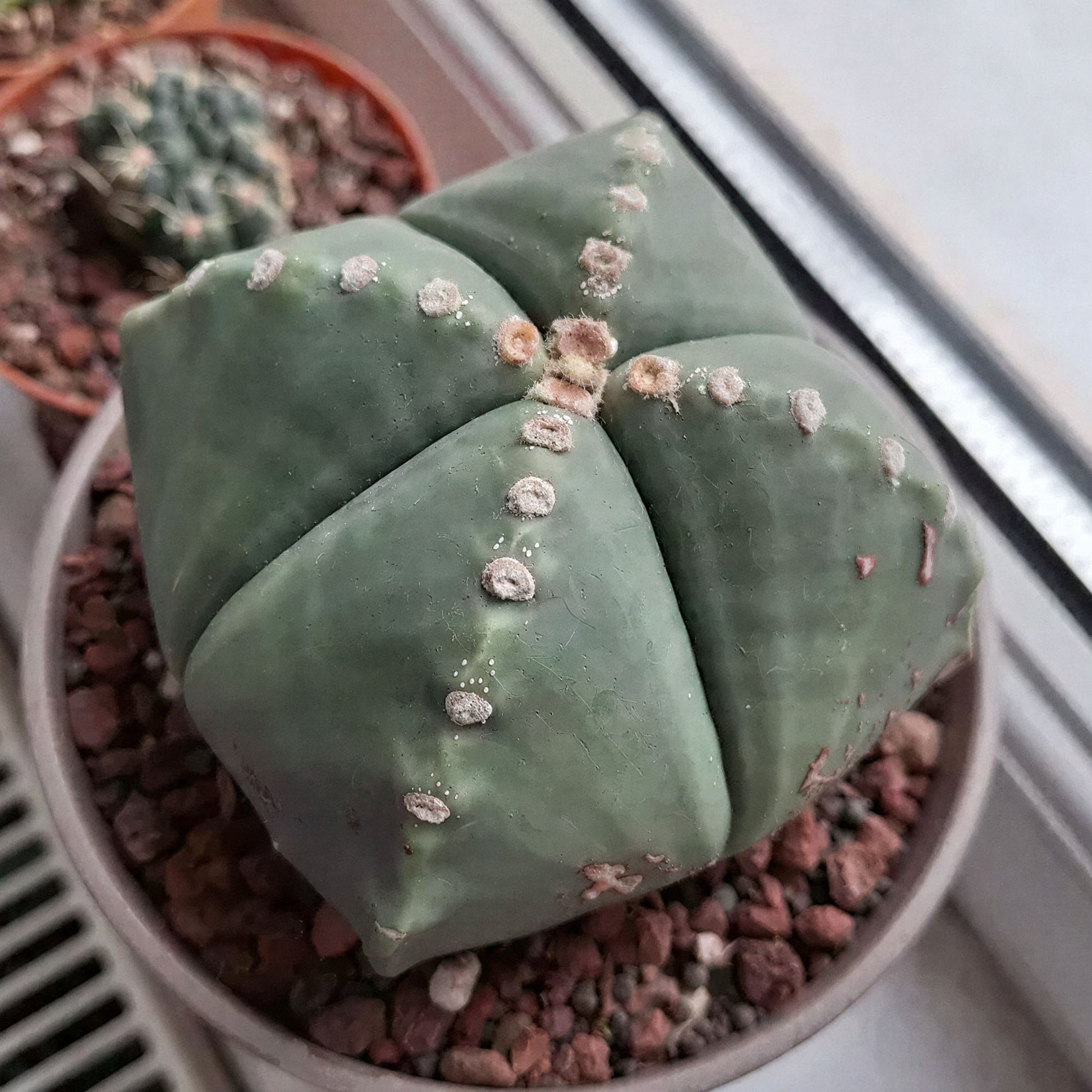 Rotate your pot by a quarter turn every time you water. Astrophytum myriostigma naturally lean towards the strongest light source, which can cause them to grow crooked. Regular rotation ensures the plant receives even light exposure on all sides. This helps it maintain a straight, symmetrical shape as it matures.
