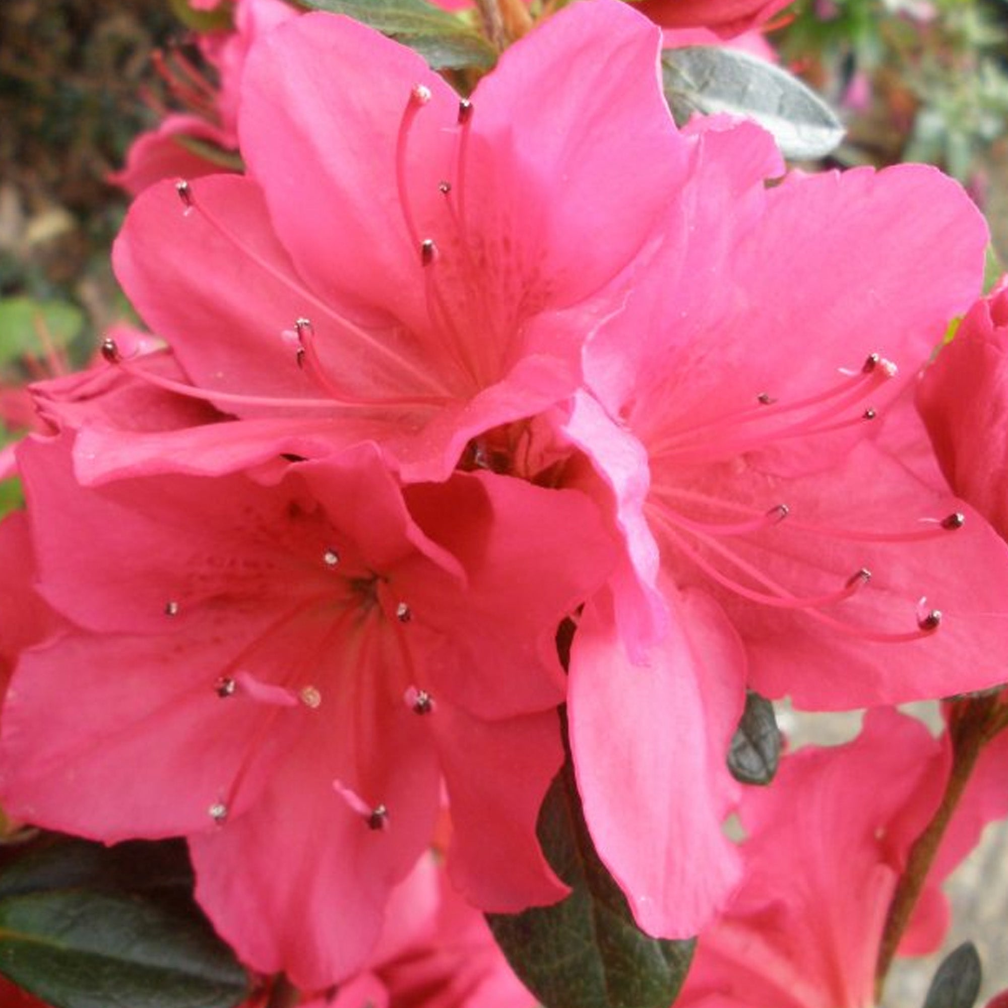 Azalea Arabesk is an evergreen shrub boasting beautifully bright clusters of flowers in spring. Glossy, dark green leaves are present year-round, whilst reddish-pink, large, funnel-shaped flowers bloom, covering the foliage with eye-catching colour.