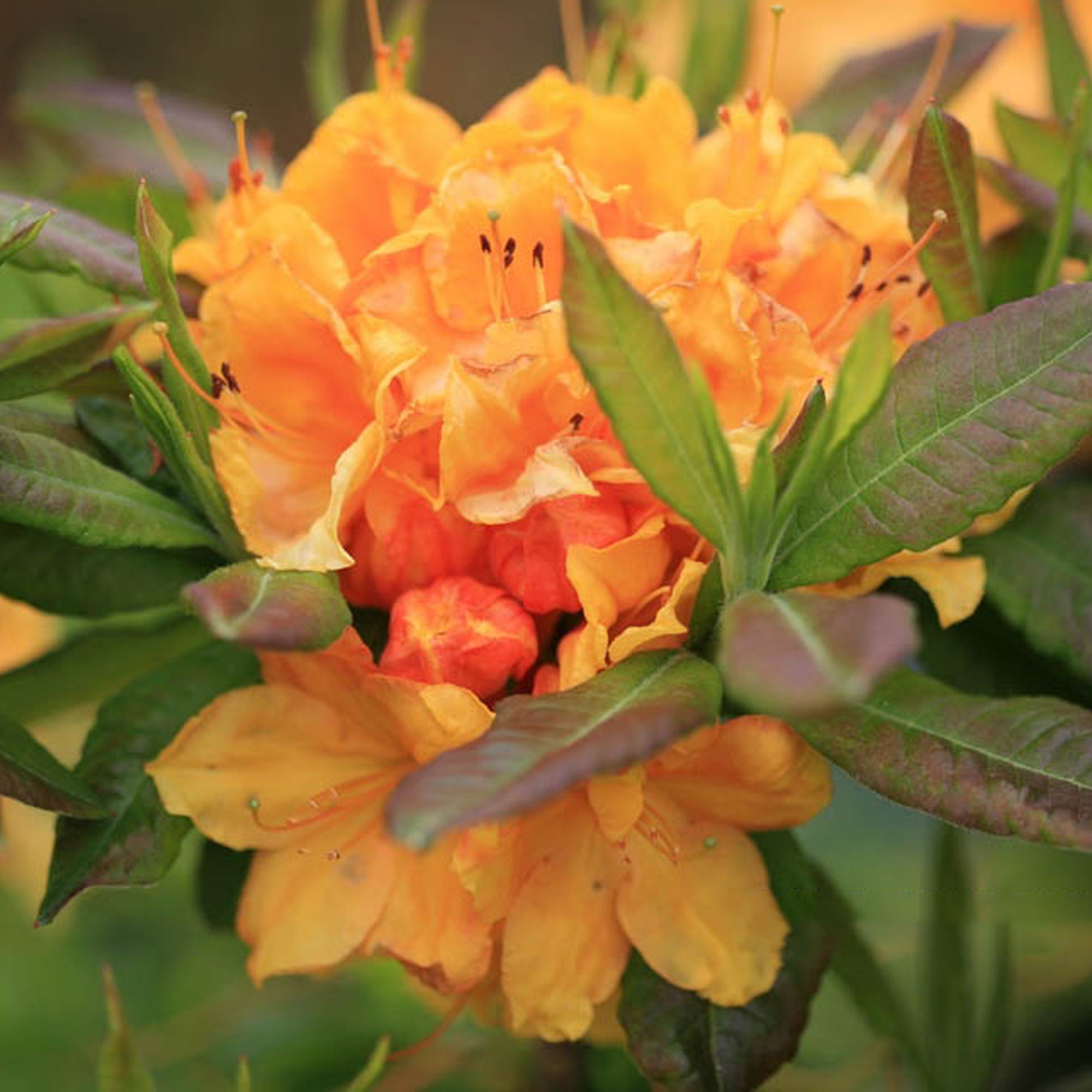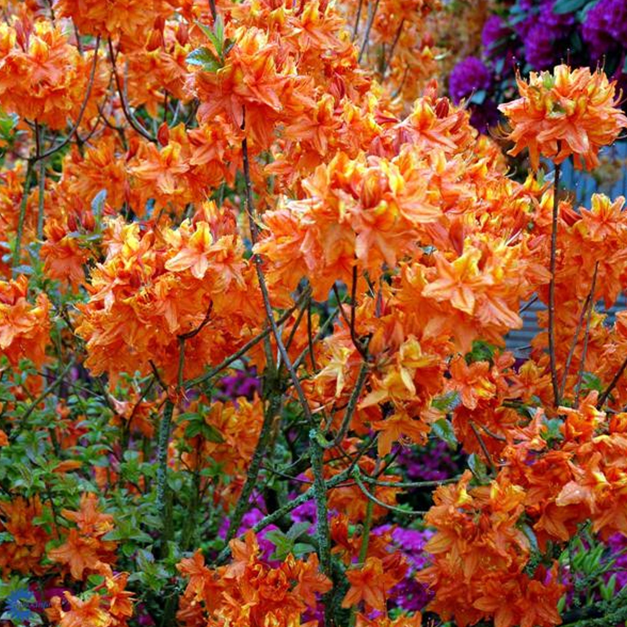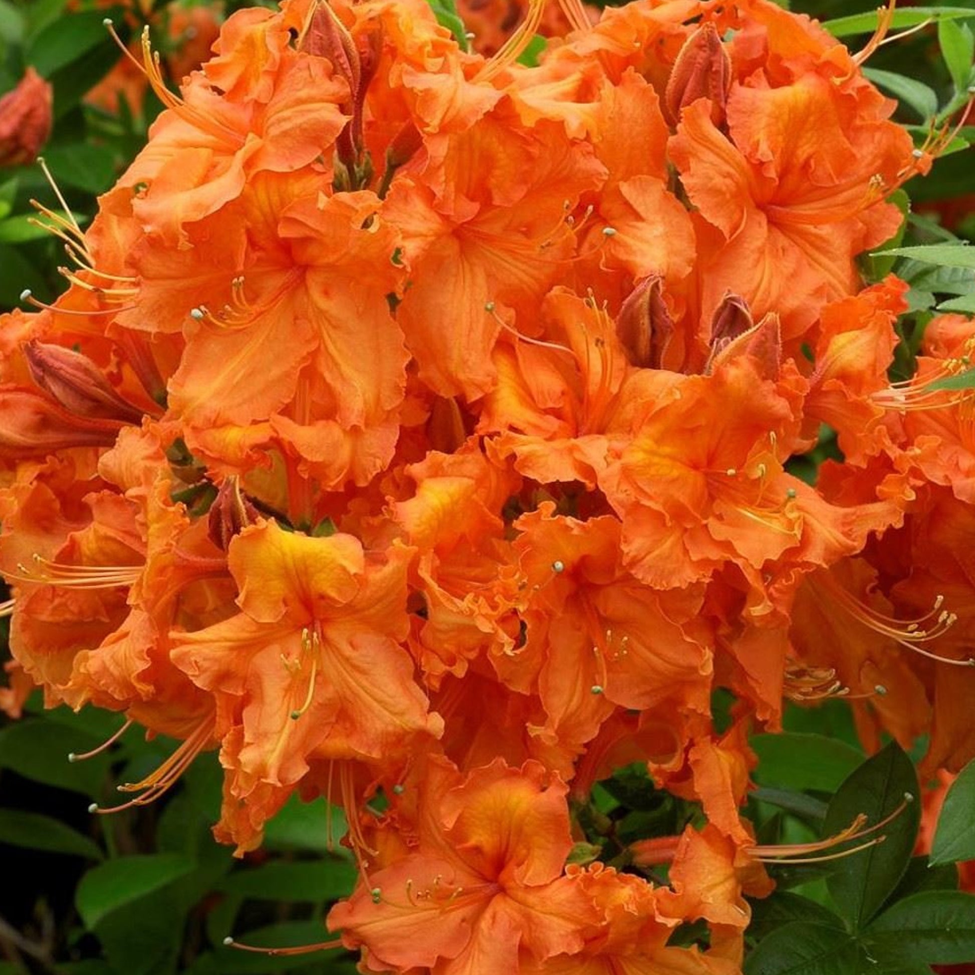 A beautiful species of the Knap Hill Azaleas, these rhododendron plants bright and provide intense colour to the garden throughout their active period, ranging from mid-Spring right through to the Autumn months. Mid-green leaves appear in Spring followed by clusters of large, blazing orange-red flowers into the Summer. The leaves take on a bronze-red tinge as they mature. This cultivar is perfect for edging or as part of a bright flowerbed, or next to water features.