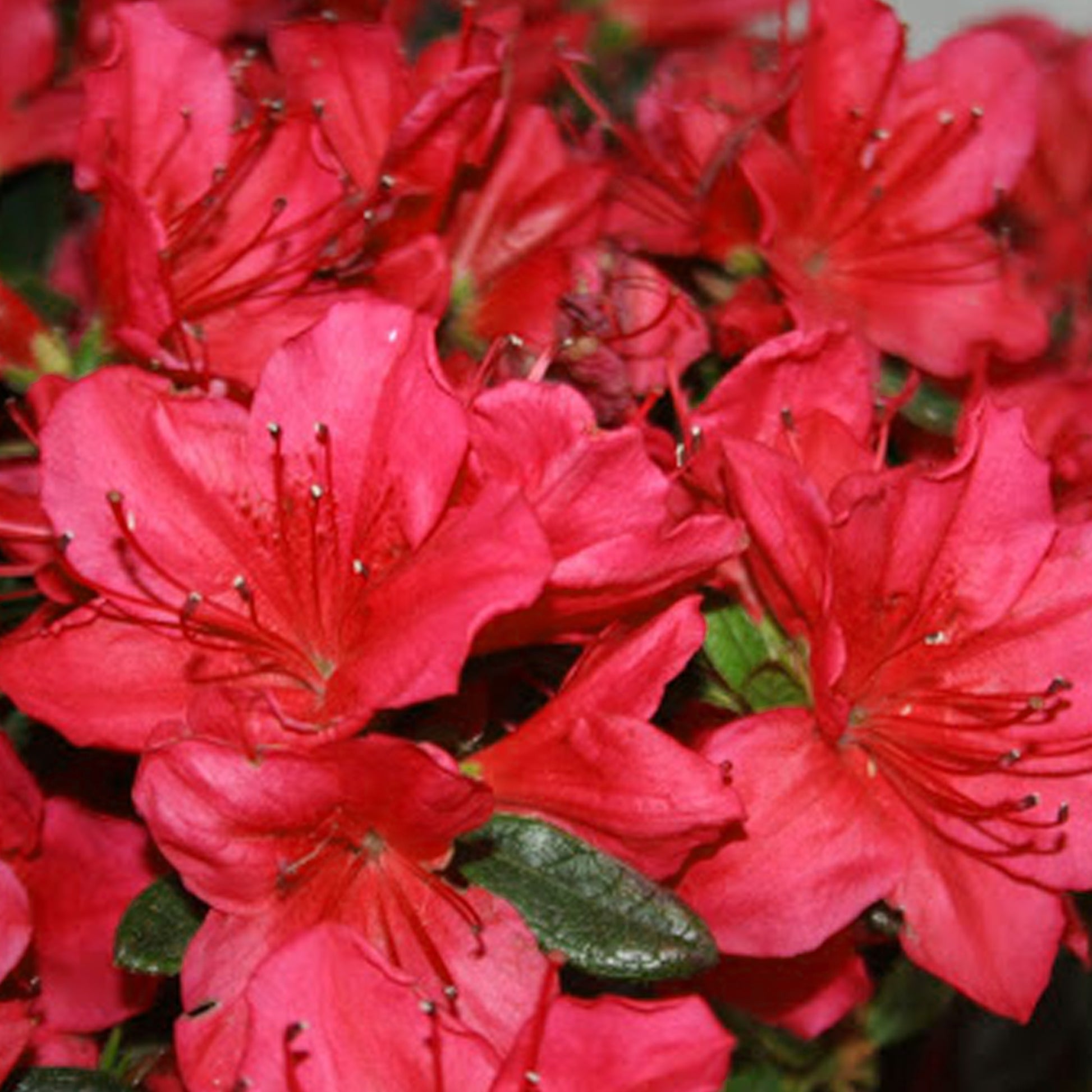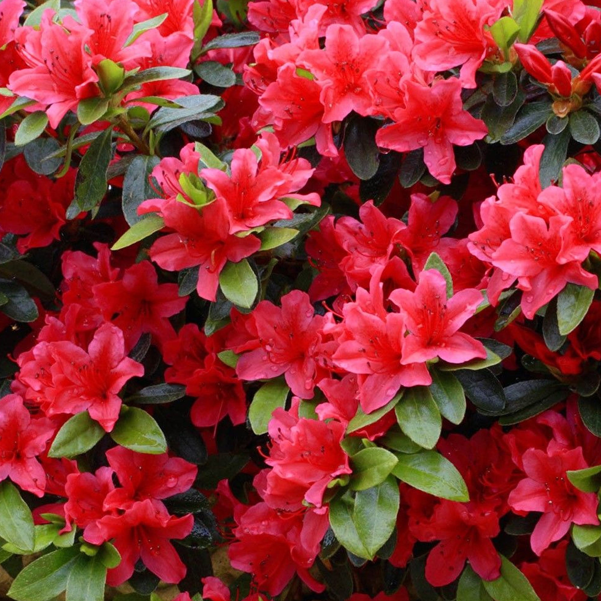Azalea japonica are well-known and vibrant outdoor evergreen shrubs. These short-growing plants carry beautiful masses of lush colourful, bright red flowers above variegated leaves - the perfect fit for gardens, containers or rockeries.
