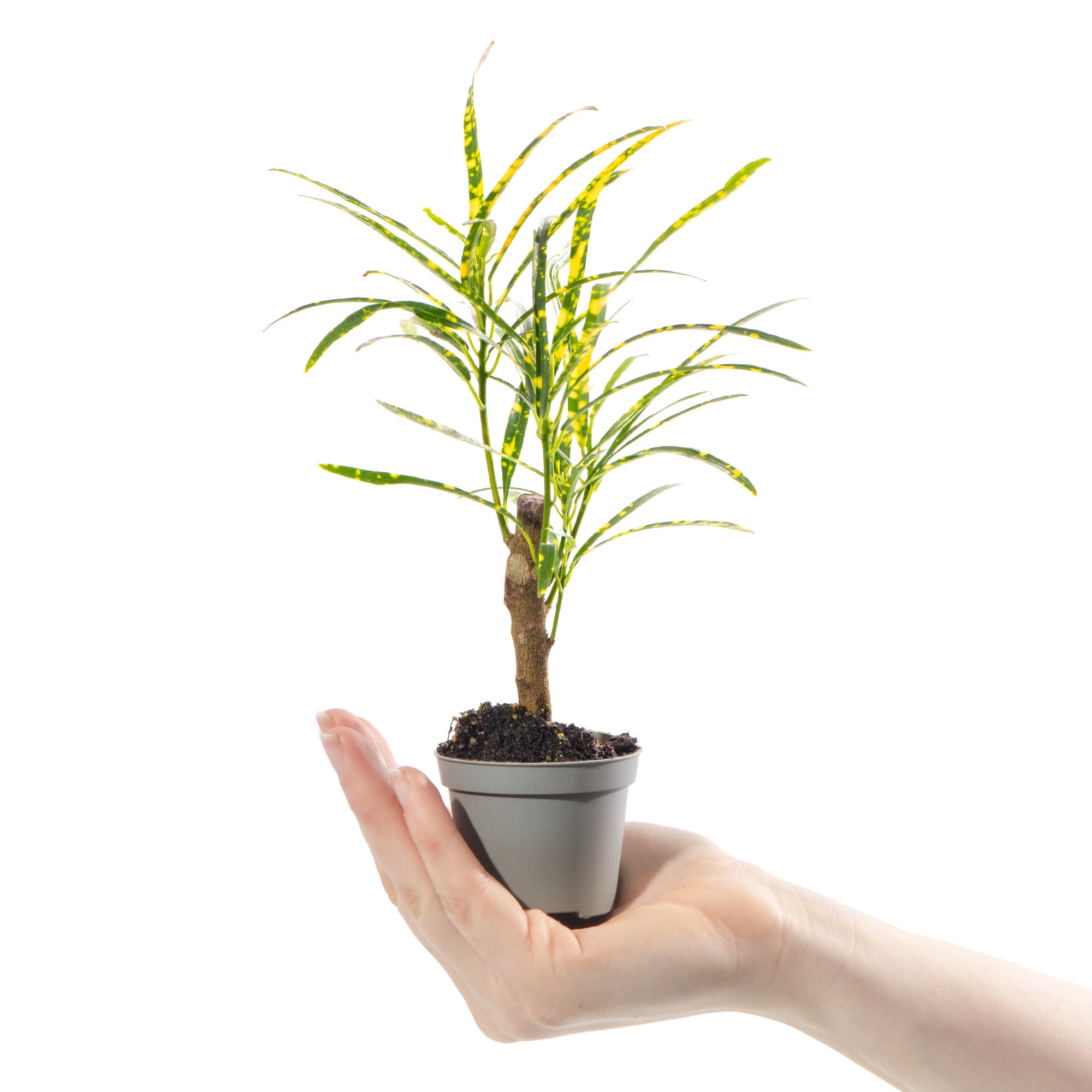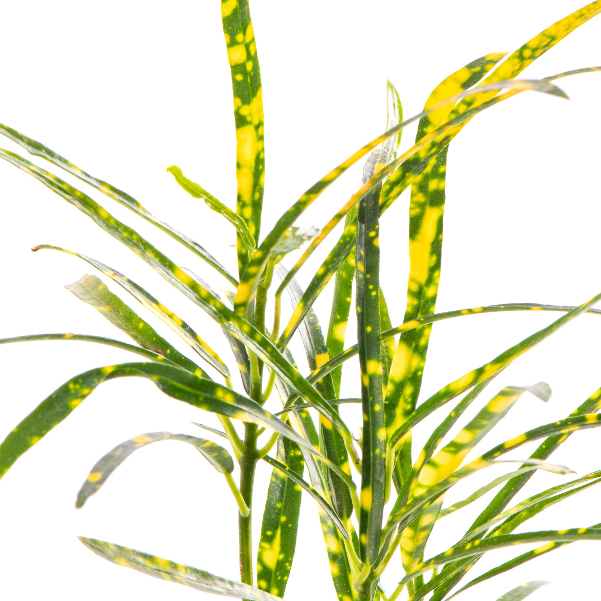 Codiaeum is often referred to as ‘Joseph’s Coat’ because of the array of rich, vibrant colours it comes in. This variety features striking yellow veins, which contrast beautifully with the rich green of the foliage. As the plant matures, flushes of red will begin to appear over the leaves.