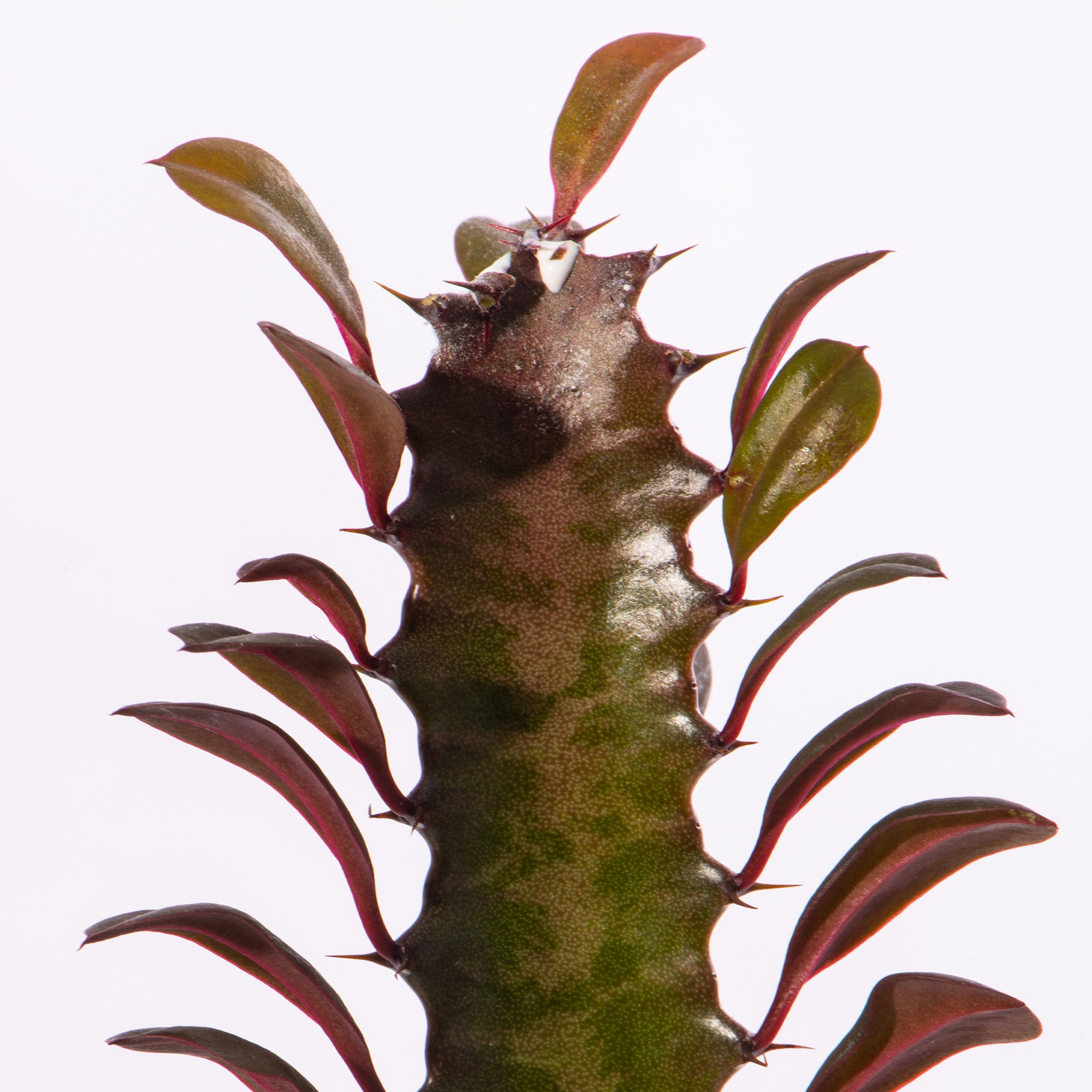 Euphorbia Trigona, otherwise known as the African Milk Tree, is a small plant which lies somewhere in-between the cactus and succulent families. Upright stems grow in triangular shaped columns, with small leaves growing on the ridges.