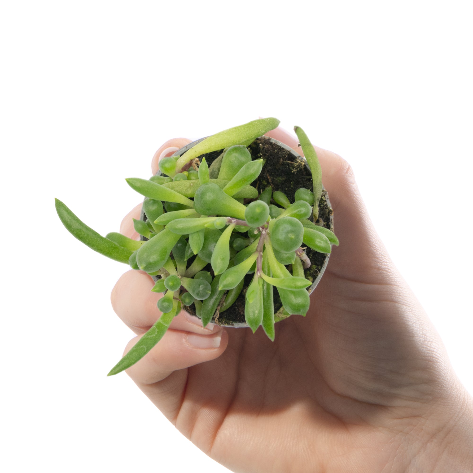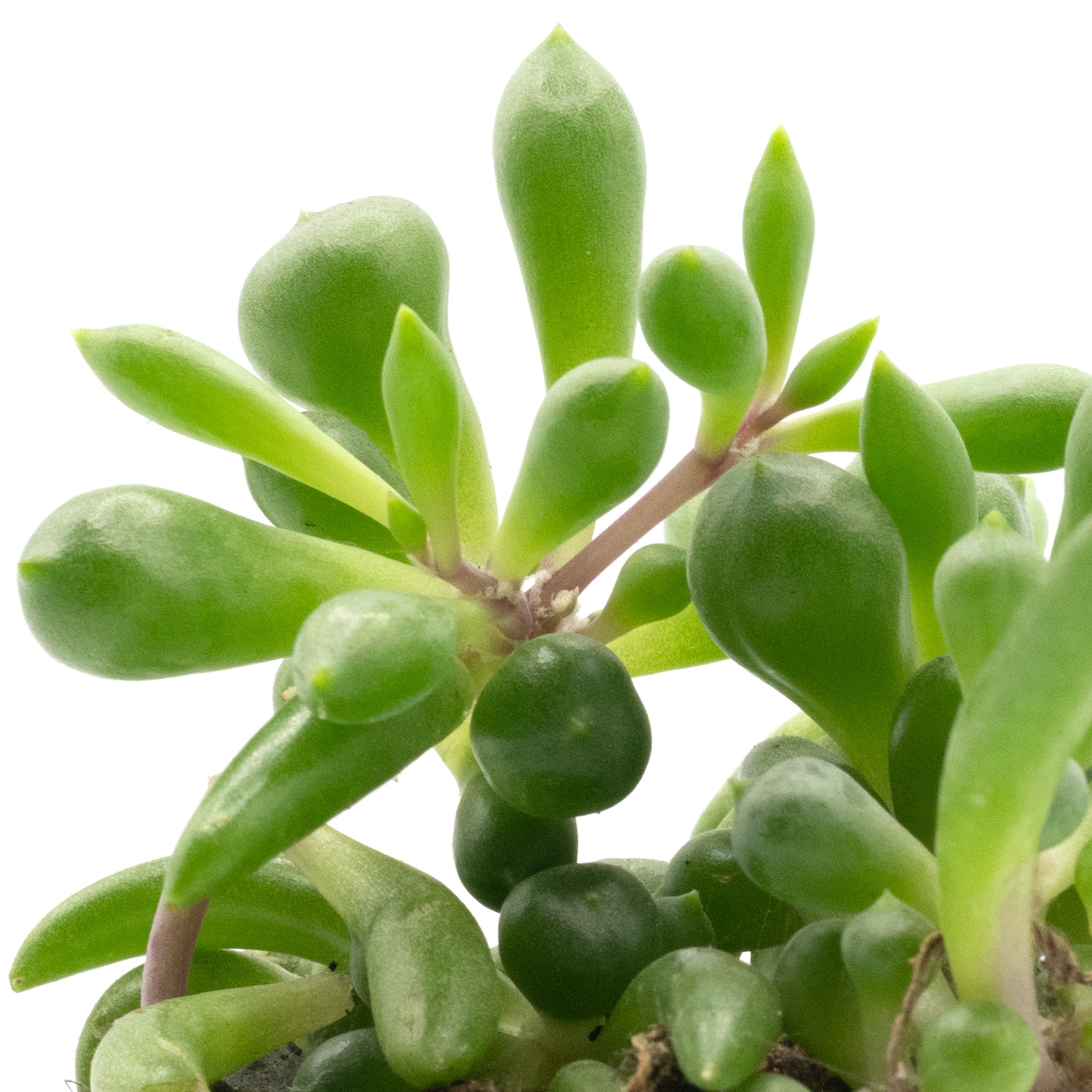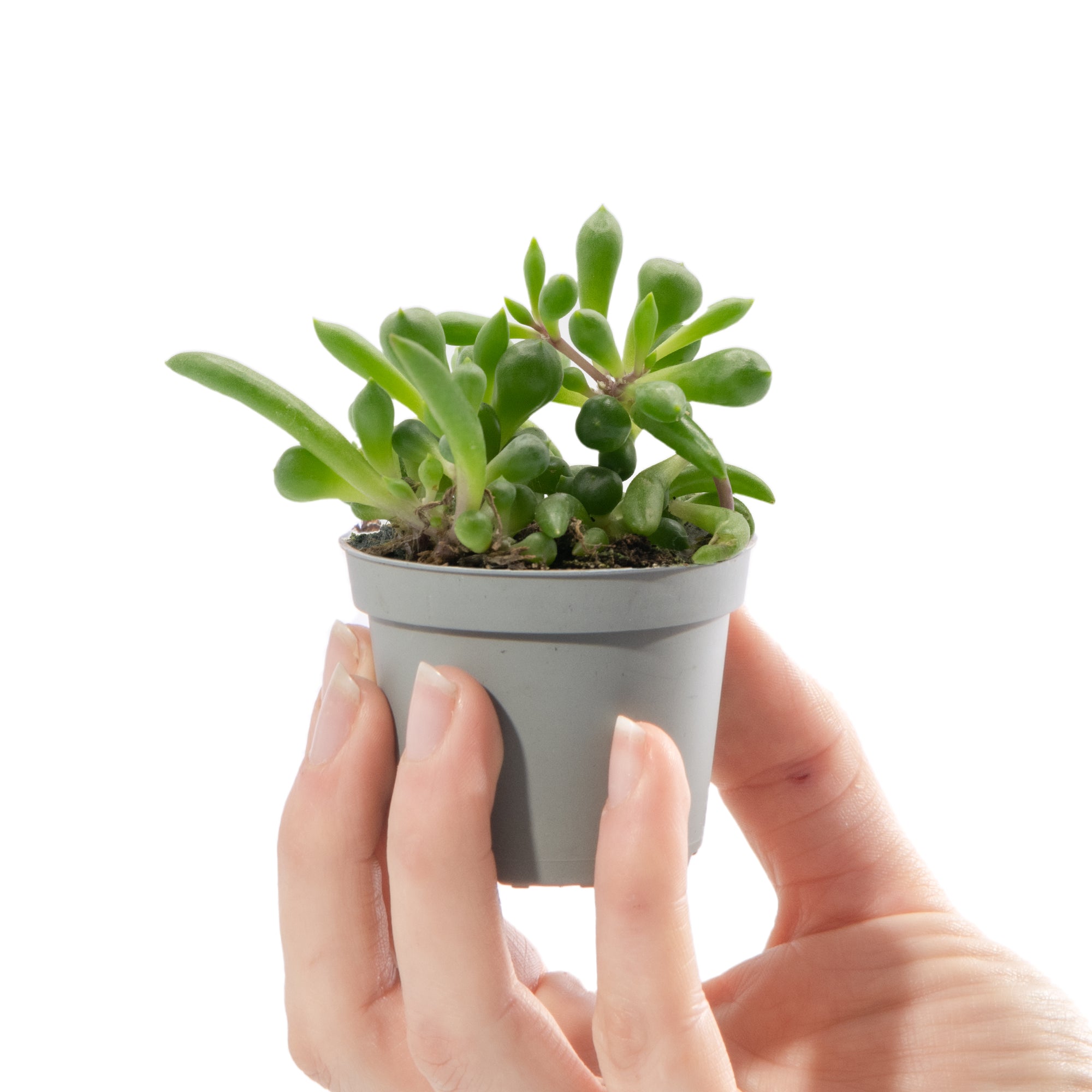 Baby Senecio Herreianus Purple Flush, also known as String of Bananas, is a small succulent plant, with uniquely shaped, plump green leaves which grow along purple, trailing stems which cascade over the edges of the pot creating a beautiful waterfall effect.