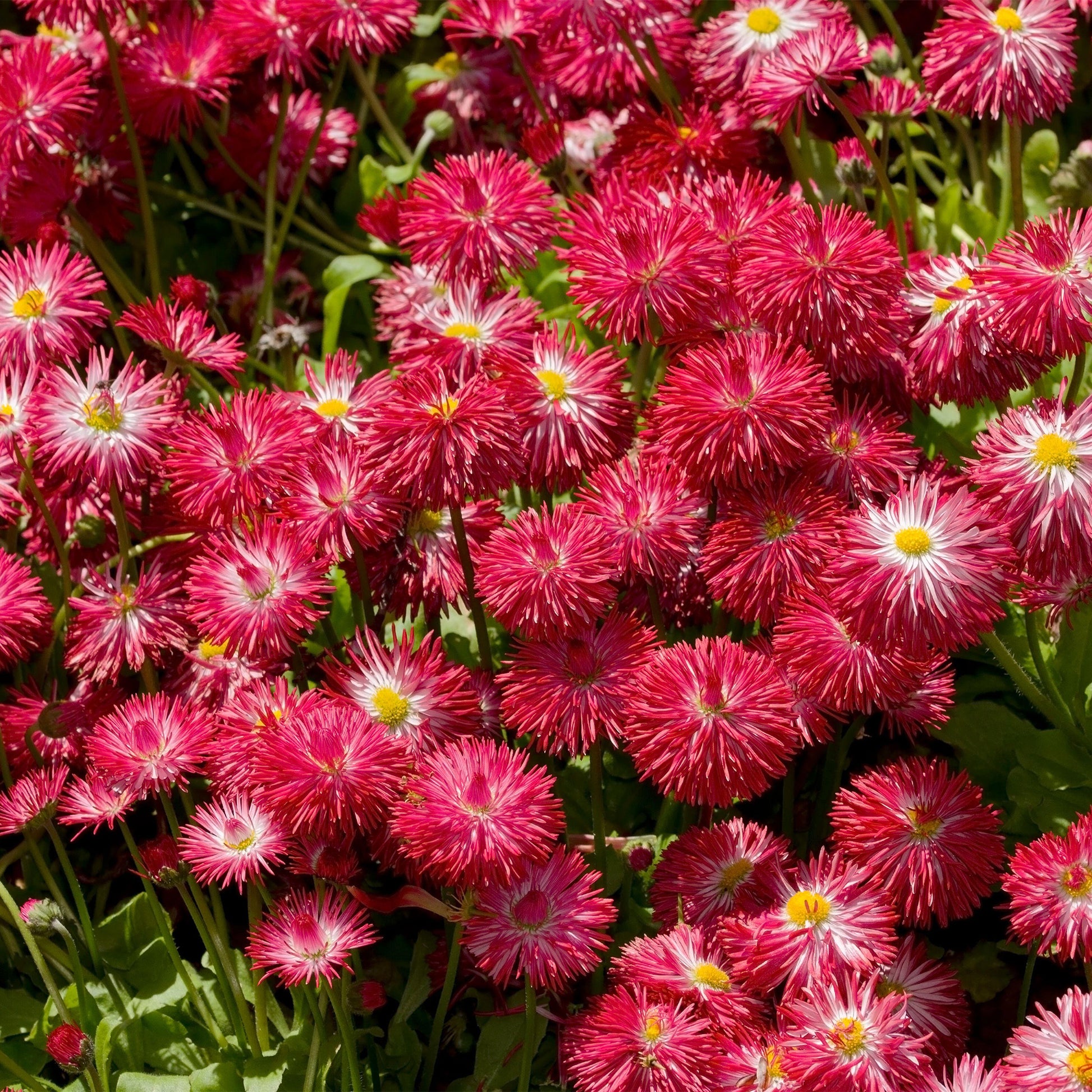 This six-pack of Bellis bam bam bedding plants brings a splash of rich, vibrant colour to the garden. Each plant produces masses of beautiful, tightly-quilled, pom-pom like flowers in a shade of vibrant red, each with a cheerful yellow centre. Known for their hardiness, they have an exceptionally long flowering season, providing a continuous and spectacular display for many months. They have a fantastic impact at the front of beds, along path edges, and in containers, where their low-growing habit creates a dense and impressive carpet of colour.