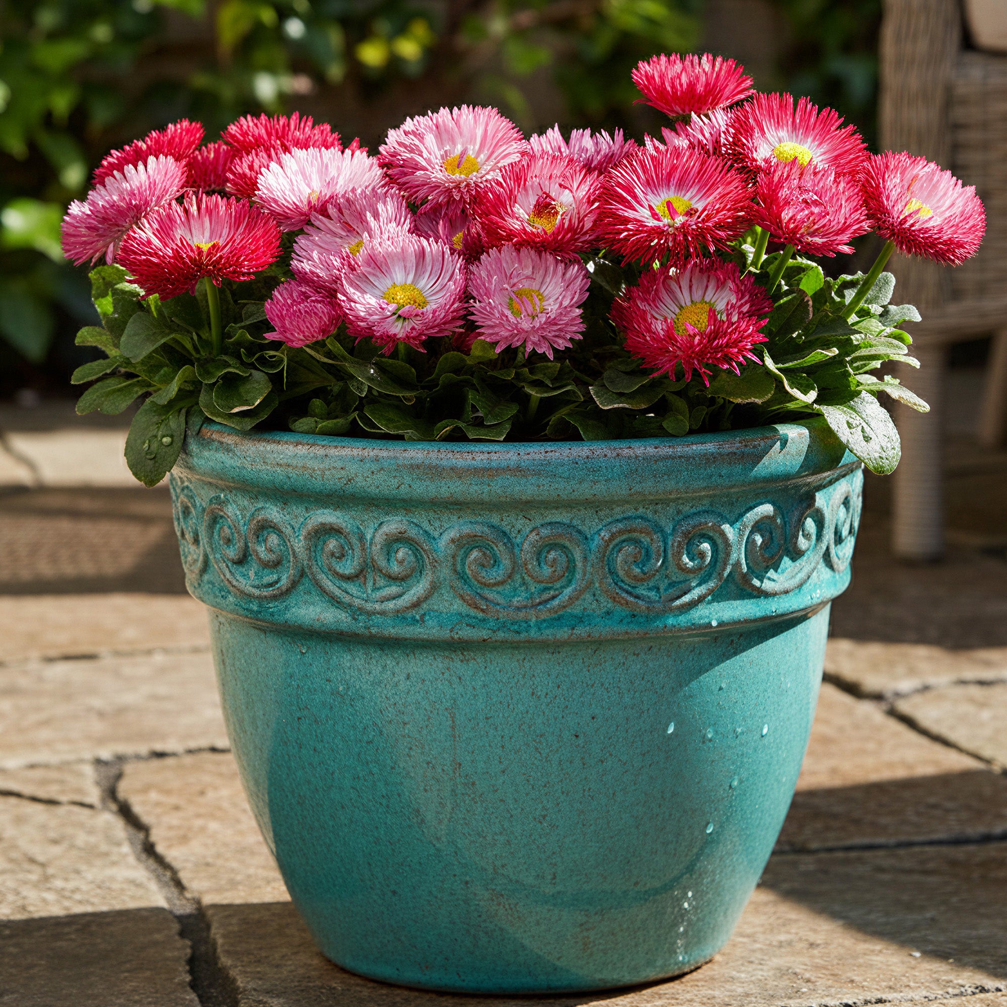 Choose a spot in sun or partial shade with well-drained soil, adding compost for nutrients and grit if your soil is heavy. Space the Bellis about 15-20cm apart for a dense display, ensuring you plant them at the same depth they were in their pots to prevent rot. Firm the soil around each plant and finish by giving them a thorough watering to settle the roots.