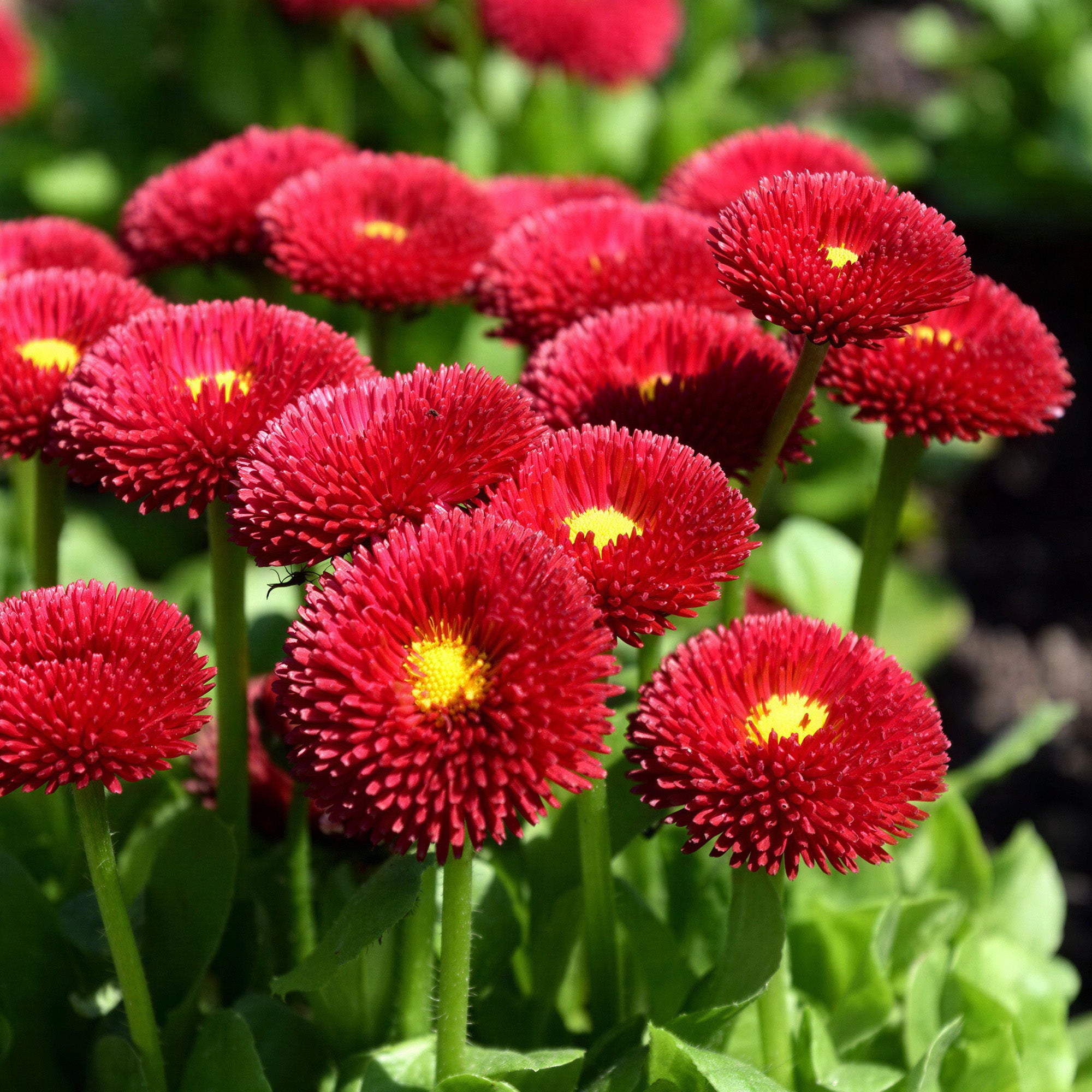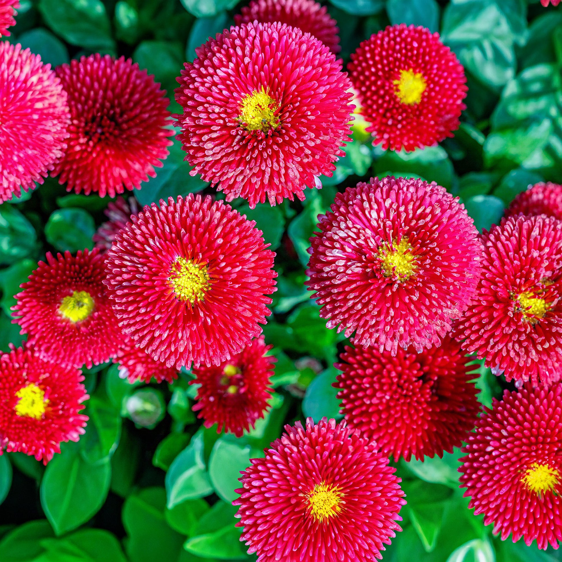This six-pack of Bellis red bedding plants brings a splash of rich, vibrant colour to the garden. Each plant produces masses of beautiful, tightly-quilled, pom-pom like flowers in a shade of rich red, each with a cheerful yellow centre. Known for their hardiness, they have an exceptionally long flowering season, providing a continuous and spectacular display for many months. They have a fantastic impact at the front of beds, along path edges, and in containers, where their low-growing habit creates a dense and impressive carpet of colour.