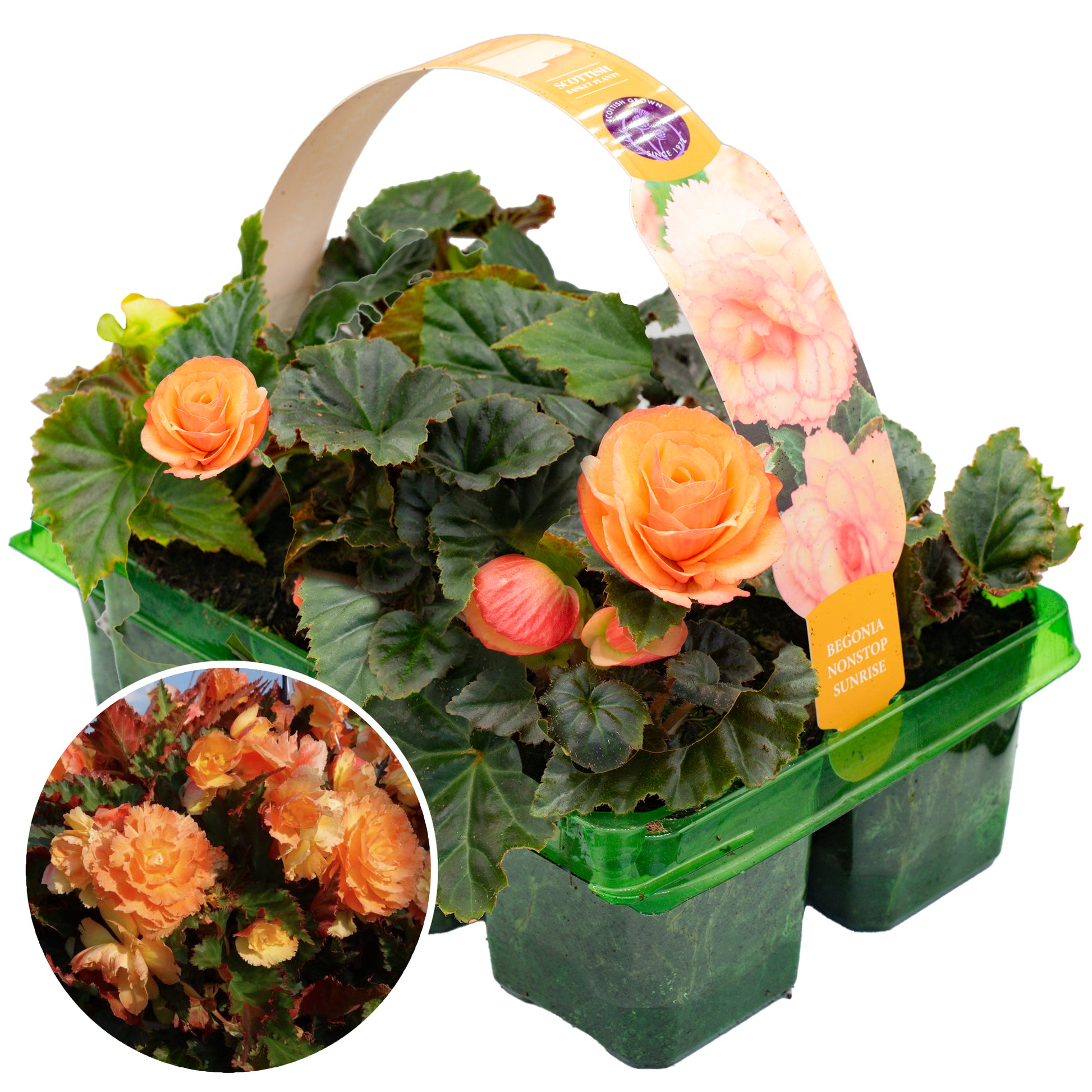 Begonia Non-Stop Sunrise basket plants will illuminate your garden throughout Summer like never before! Its gorgeous mix of sunset coloured flowers are fully double, allowing them to easily make a noticeable impact in your garden. Each flowerhead contrasts against the lush, green foliage of these plants, making a gorgeous display of colour no matter where you place them. All of these brilliant features makes them the perfect selection to show off in any hanging baskets, flower beds, borders, pots or containers.