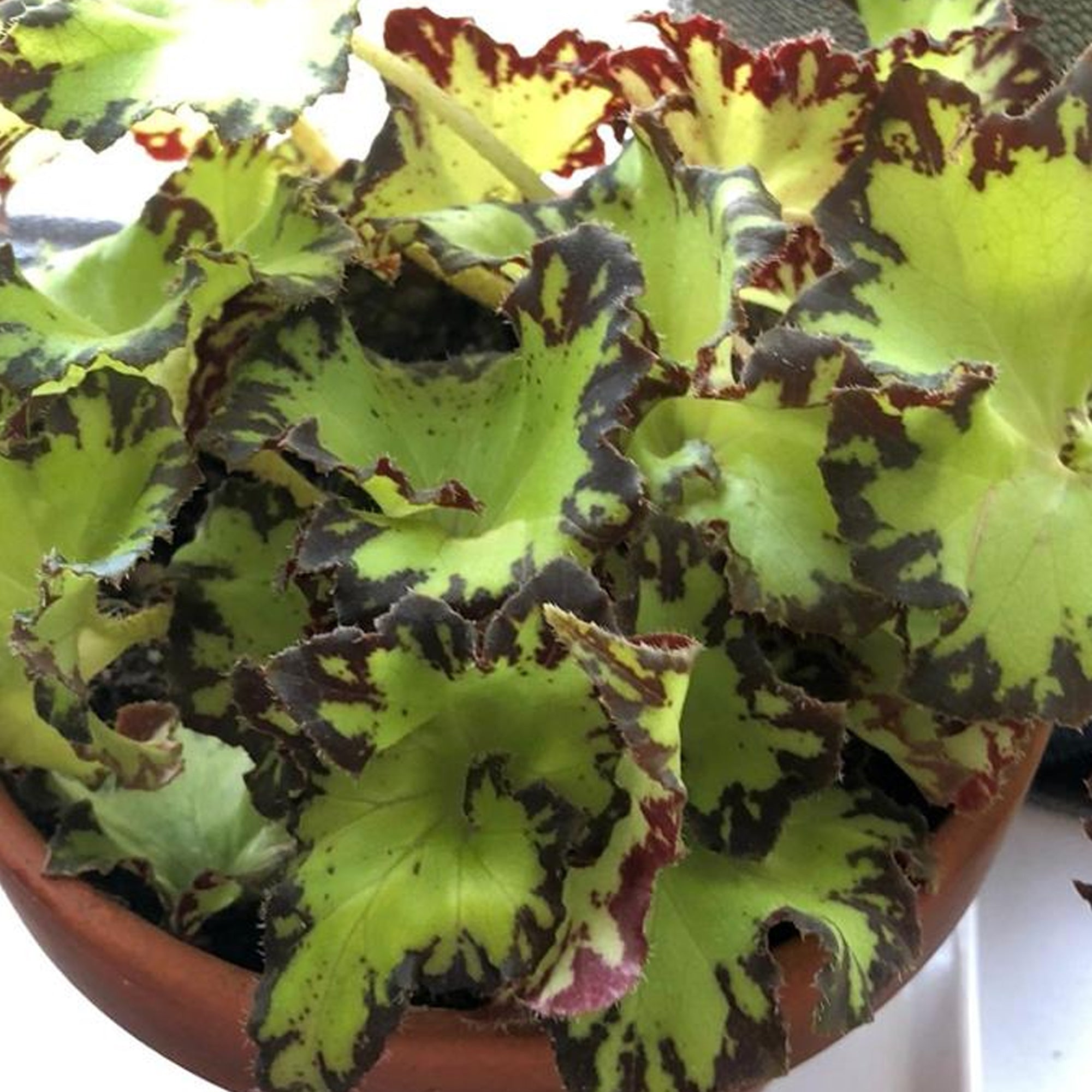 Rex Begonias, commonly known as King Begonia, are best known for their striking foliage. This Jive variety has a main colour on its leaves that allows it to standout from the crowd within any indoor setting. The bright green colour fills the leaves, with a deeply coloured border outlining it round the edges. The clustered form of evergreen leaves brings that vibrant colour out once more, with the great amount of leaves making it hard to ignore. King Begonia will use its air-purifying qualities to ensure that the removal of harmful pollutants and unwanted toxins is carried out, creating a fresh and revitalised area to live in. Place the plant in partially shaded areas, with next-to-no contact with direct sunlight, whilst ensuring you water it once a week when the soil is dry to touch. Then, when the plants dormant period of Winter comes around, you should lower this amount to once every two weeks.