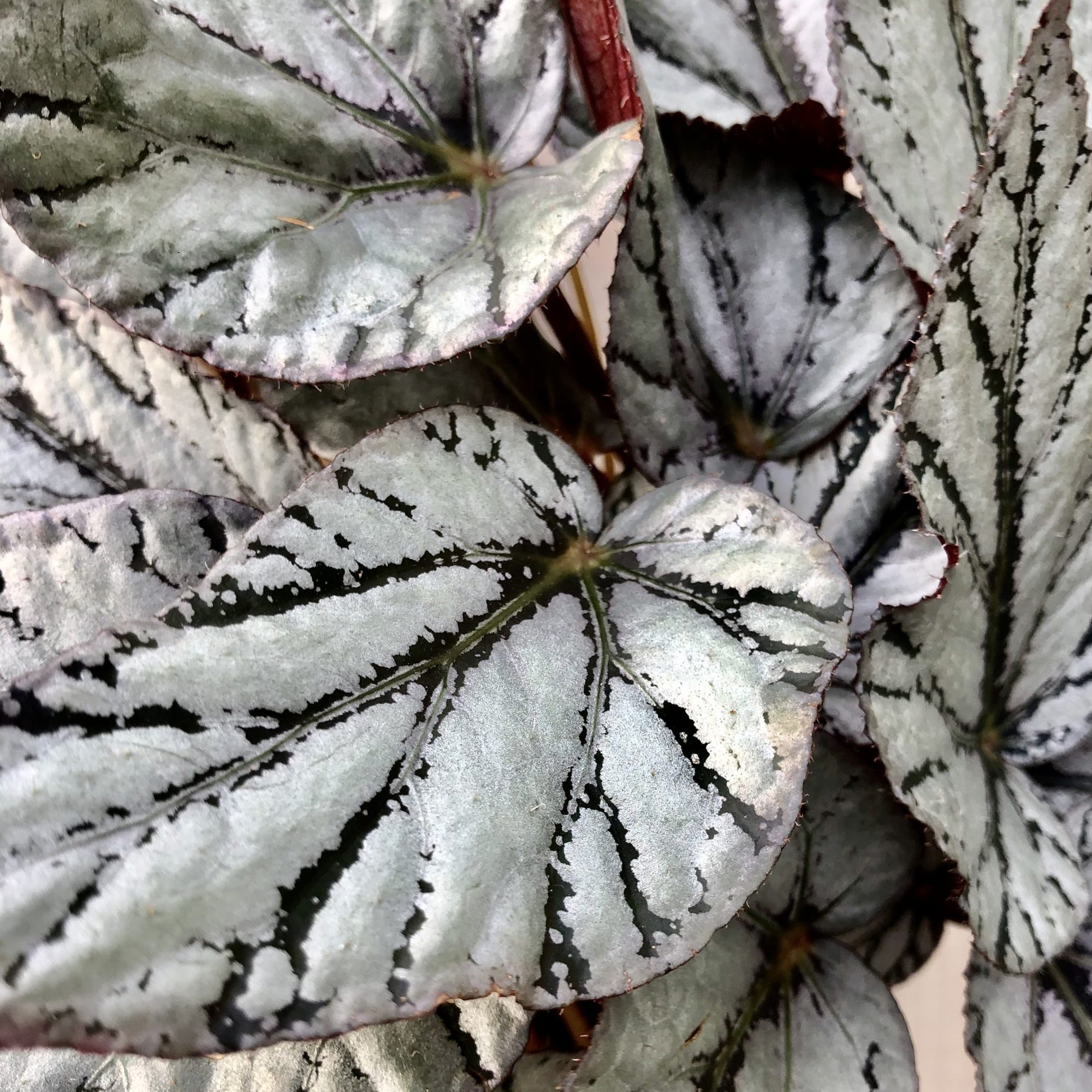 Rex Begonias, commonly known as King Begonia, are best known for their striking foliage. This Jolly Silver variety has long and narrow leaves filled with a dark green base colour, silver additions throughout and a deep red hue on the underside of each leaf. King Begonia will use its air-purifying qualities to disperse of any harmful pollutants and unwanted toxins, replacing them with a fresh and revitalised atmosphere for all to live in. Placing it in partial shade is recommended, along with avoiding consistent contact with direct sunlight as that will cause damage to this unique evergreen. You should water the plant when the soil is dry to touch, making the process a once-a-week fixture. However, during its dormant period of Winter, you can lower this to once every two weeks.
