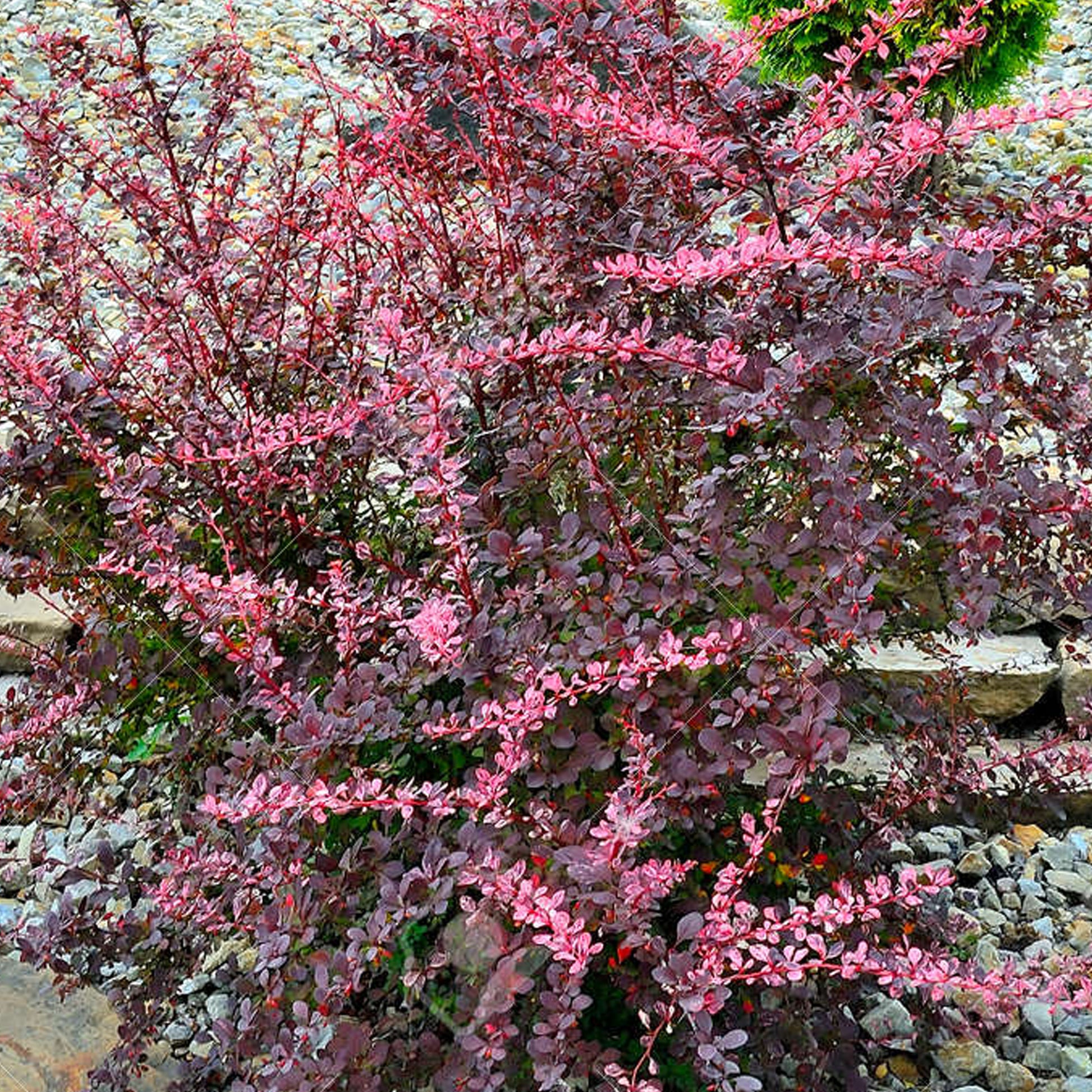 A very hardy and low maintenance deciduous shrub with lovely foliage colour from Spring through to the Autumn. The Berberis thunbergii 'Pink Queen' is a variety of Japanese Barberry with a somewhat compact nature and dense thickets of small, rounded purple leaves with marbled pink and white variegation which changes slightly with the seasons. In Spring, small panicles of pale-yellow flowers appear throughout the foliage and are sometimes followed by small red berries in the Autumn.
