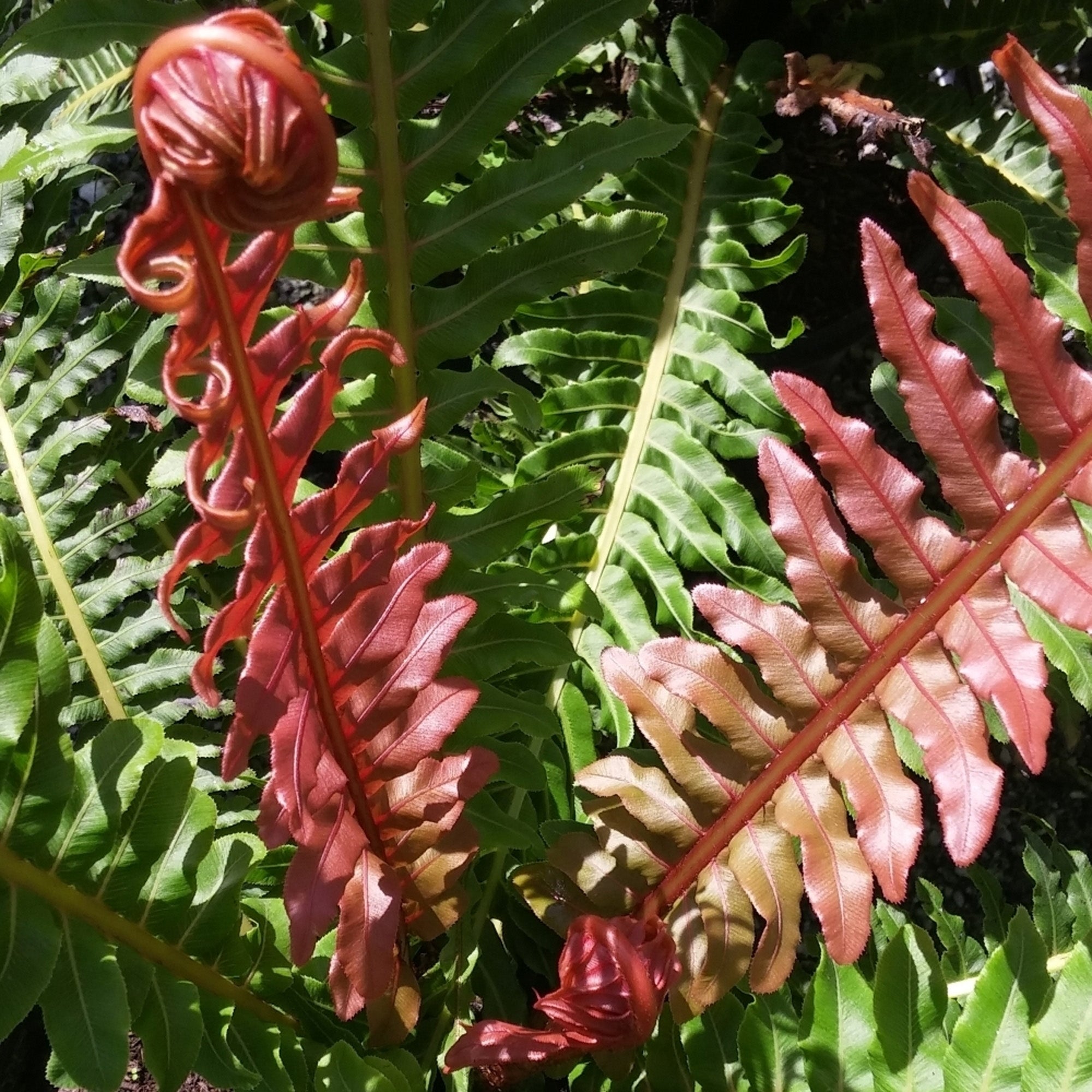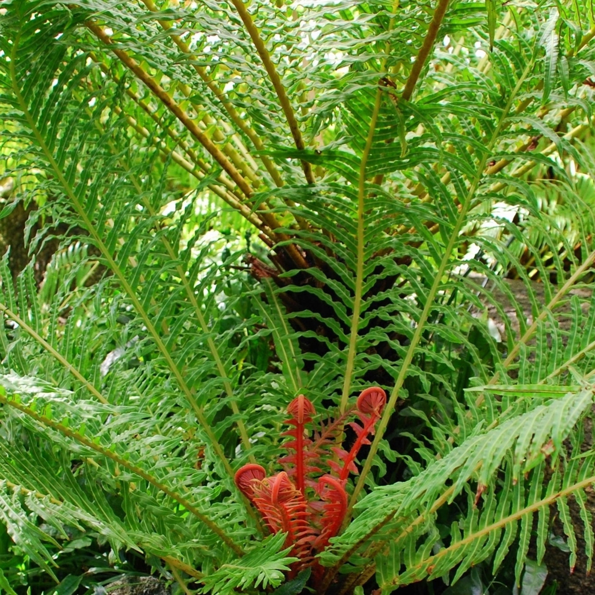 Blechnum brasiliense Volcano, also commonly known as the Dwarf Brazilian Tree Fern, is an evergreen, outdoor fern plant. Slightly crinkled leaves grow on arching stems, emerging in shades of fiery red, before fading to rustic bronze and then green.
