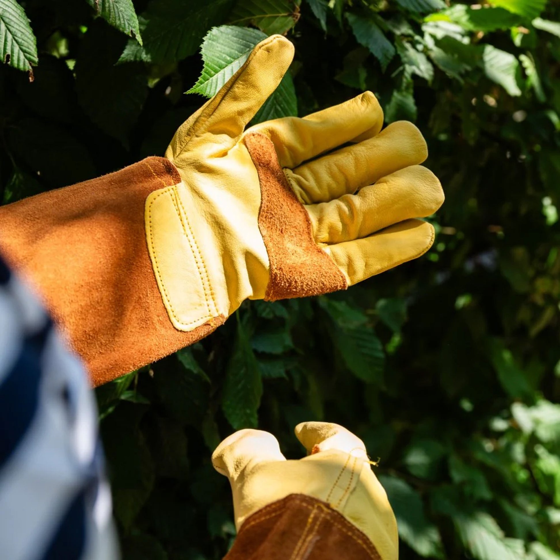 These gauntlets are best understood as personal armour for the gardener, crafted from materials chosen for maximum defence. The body of the glove is constructed from a thick leather, a natural material revered for its ability to resist punctures from thorns and branches. This primary shield is complemented by the extended gauntlet cuff, which provides a protective sleeve for the forearm. Strong stitching and an articulated design ensure that this toughness does not completely sacrifice the dexterity needed to operate pruning tools effectively.