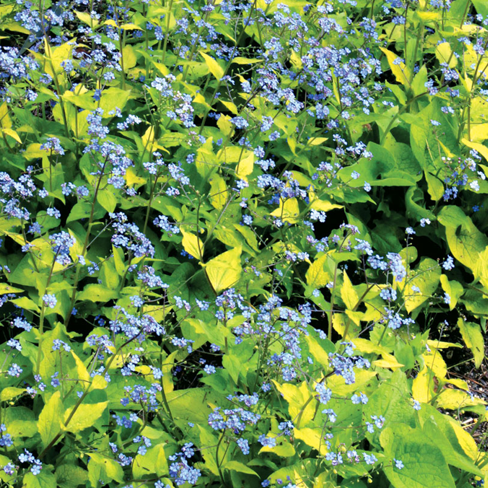 Unlike its cousins that display yellow leaves, Diane’s Gold produces heart-shaped leaves of golden chartreuse colour. These hairy leaves are perfect for brightening up any dull corners in a garden. In April and May, it blooms tiny but showy sky-blue Forget-Me-Not flowers that look dazzling over the bright foliage. Its creeping habit allows it to spread and form a thick ground cover.