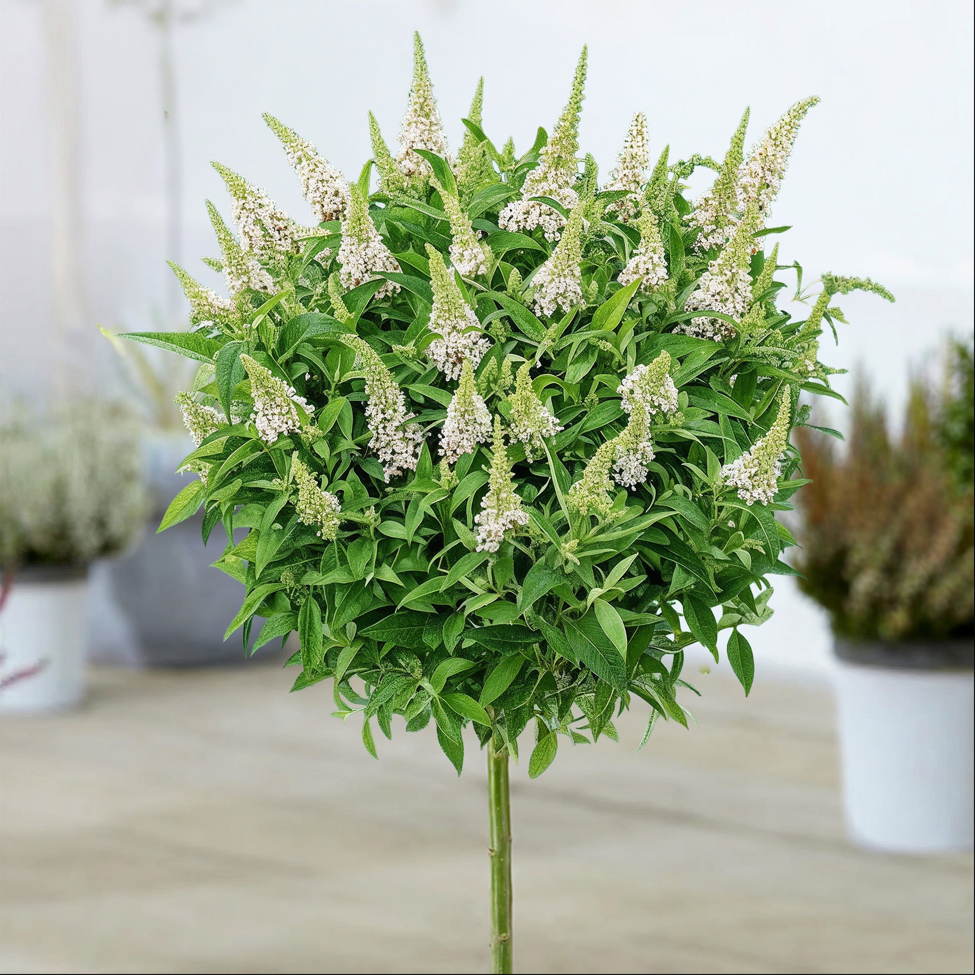 The 'Little White' Buddleja is a compact variety that, when trained as a standard tree, offers a sophisticated presence in any garden design. For months, from summer right through to autumn, it is adorned with a wealth of tapered flower spikes in a crisp, clean white. These honey-scented blooms are highly attractive to pollinators, making the tree a hive of activity for bees and a favourite landing spot for butterflies throughout its flowering season. Being a sun-worshipper, its flowering potential is maximised in the brightest part of the garden, so choose a spot that receives plenty of direct sunlight for the best results. While it needs consistent watering to fuel its summer growth, the most vital aspect of its long-term care is its winter treatment: it is essential to shield the roots from cold, wet conditions by letting the compost dry out significantly during its dormant period.