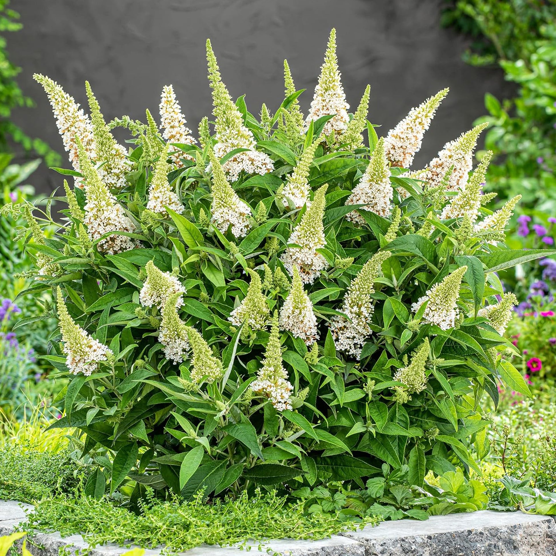 To elevate your 'Little White' patio tree from a single specimen to a complete display, underplanting it with a well-chosen companion is an excellent strategy. For a classic, bee-friendly combination that offers a striking colour contrast, consider planting English Lavender (Lavandula angustifolia 'Hidcote') at its base; its fragrant, deep purple flower spikes will stand out beautifully against the Buddleja's crisp, pure white blooms. This ground-level planting not only adds another layer of beauty but also helps to visually anchor the tree in its pot, complementing its graceful, standard form.