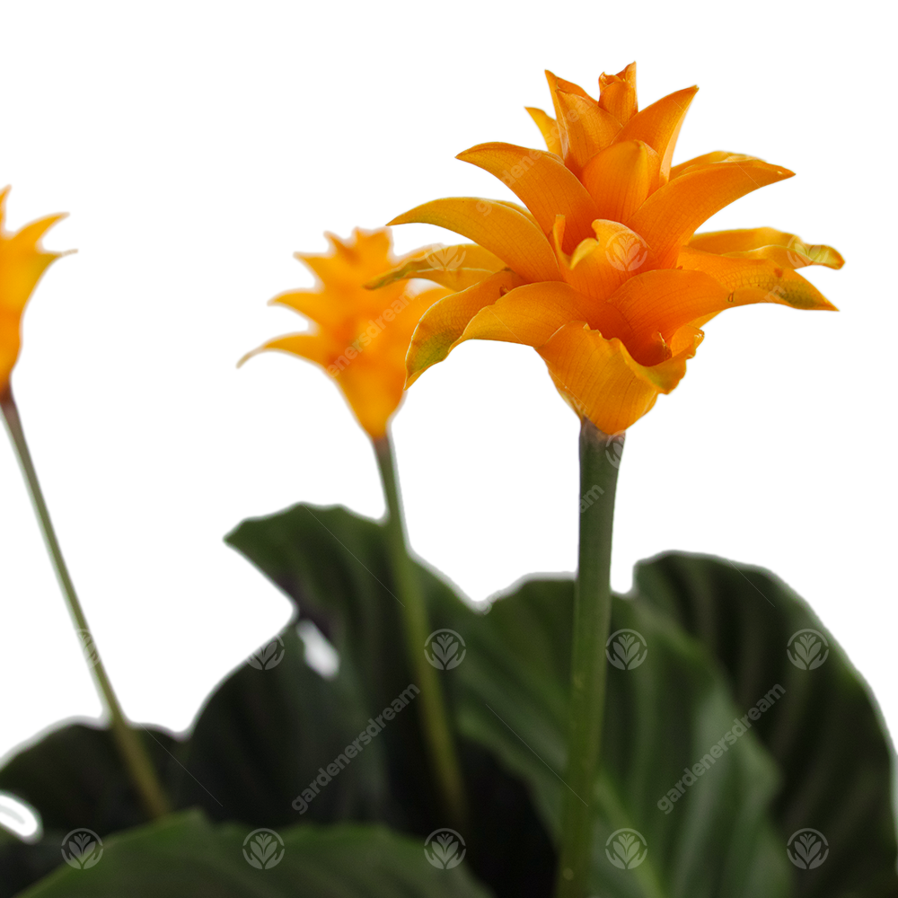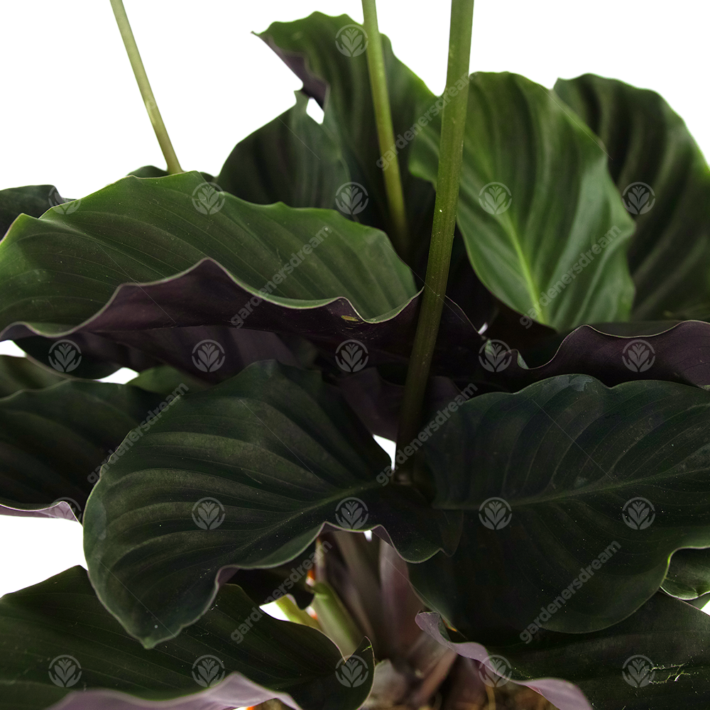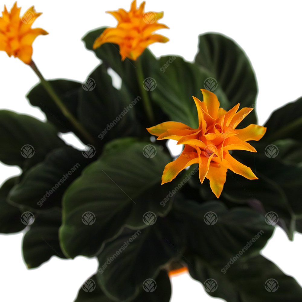 The Calathea Crocata is a heat loving attractive tropical indoor houseplant. This variety sports metallic green foliage with purple hues and brown undersides, the stems that tower above the bush bloom to reveal yellow and orange flowers resembling a flame, hence it's name 'Eternal Flame', these flowers last roughly 2-3 months and add a colourful and exotic feel to your home. They will also let you know when it's time for bed, as the leaves of this plant curl up at night before unfurling at the start of a new day. These plants hate direct sunlight so it's best to place in partially lit locations with some humidity.