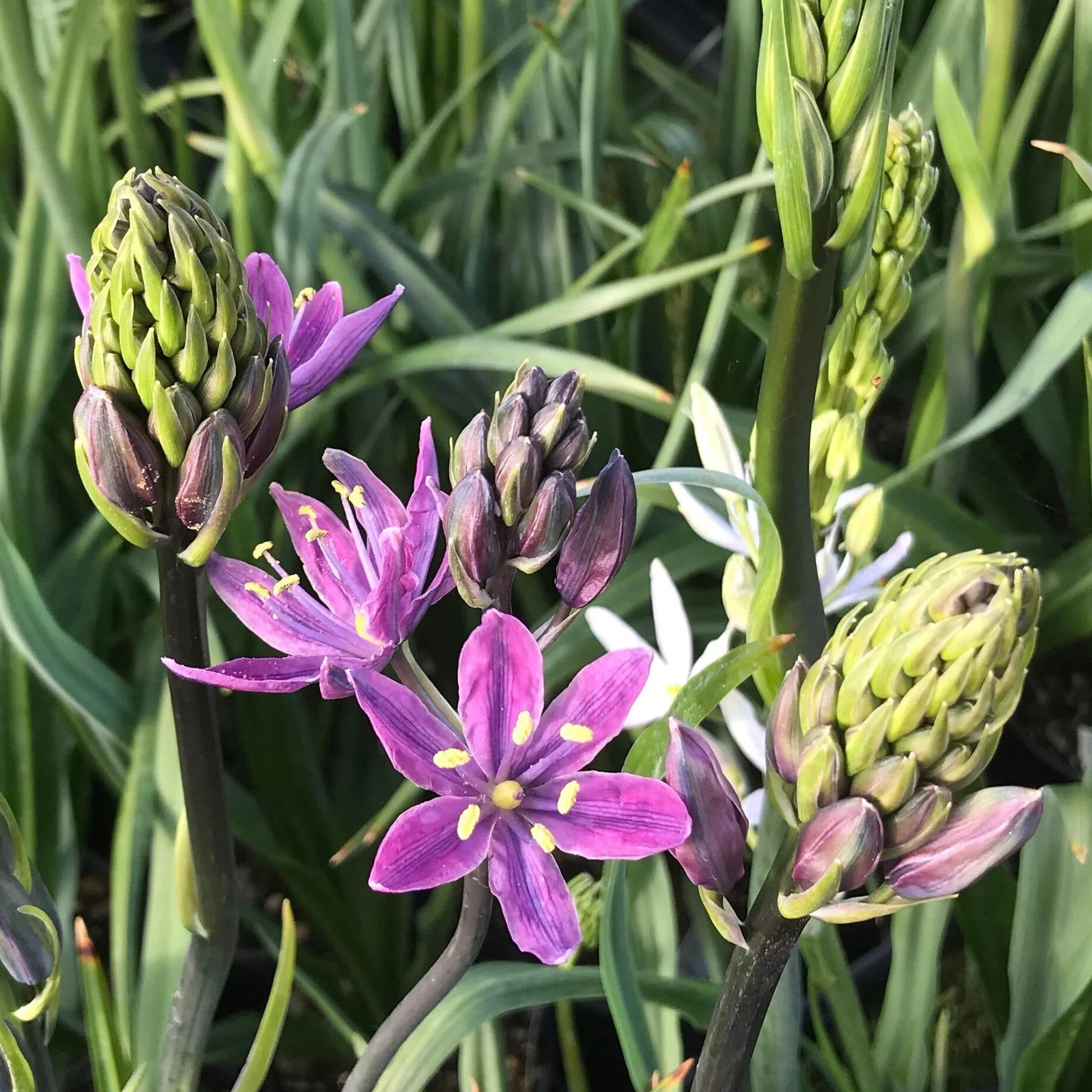 Camassia Aurora thrives in full sun or partial shade in moist but well-draining soil. Dig a hole around 3 times as deep as the height of the bulb and position the bulb with the pointed side facing the sky. Backfill the hole with soil, firming down gently before watering well. Allow 10-15cm between bulbs. Camassia Aurora is fully hardy in the UK, which means the bulbs don’t need to be dug up and stored before planting again the following year. Simply leave them in place and they’ll emerge with fresh new foliage in spring.