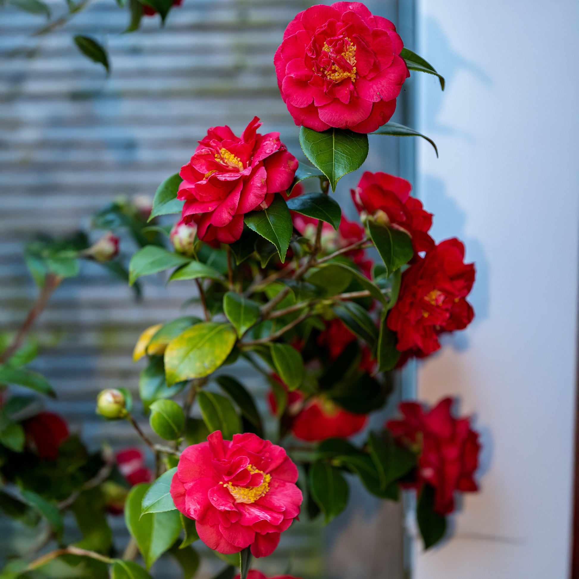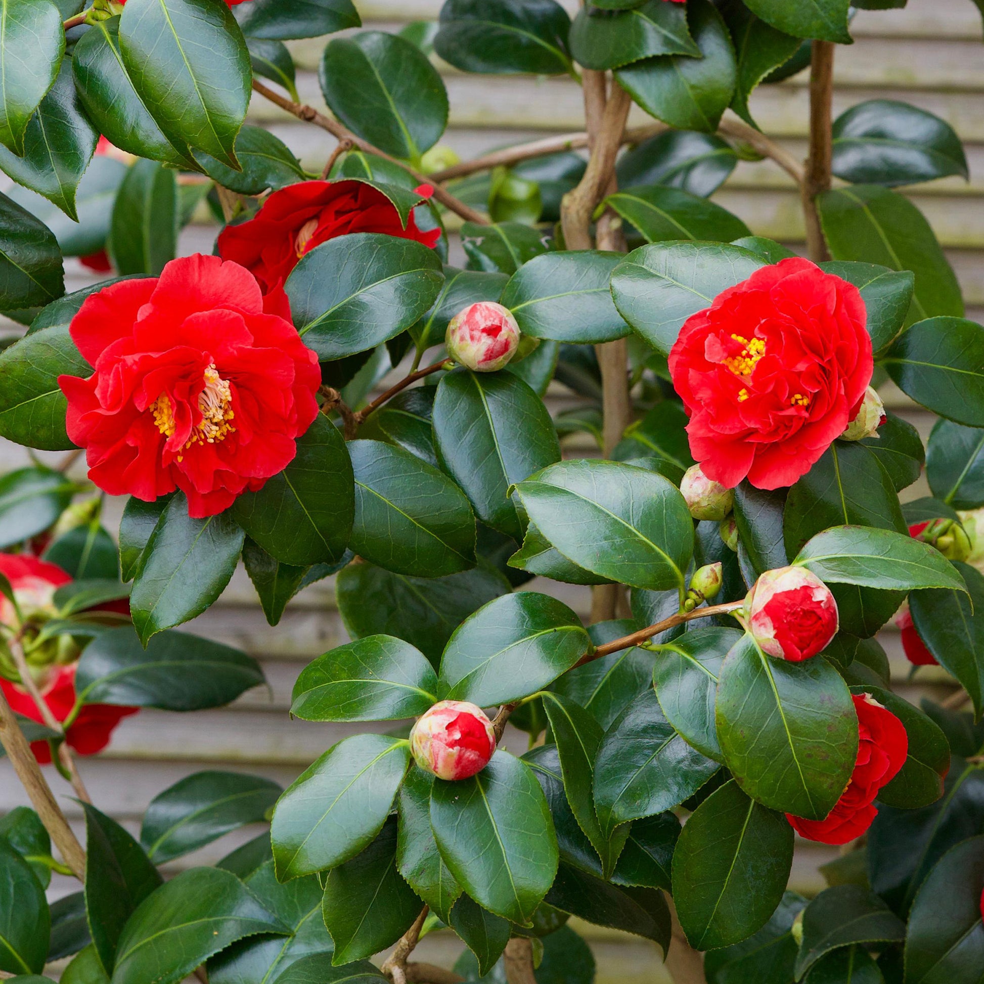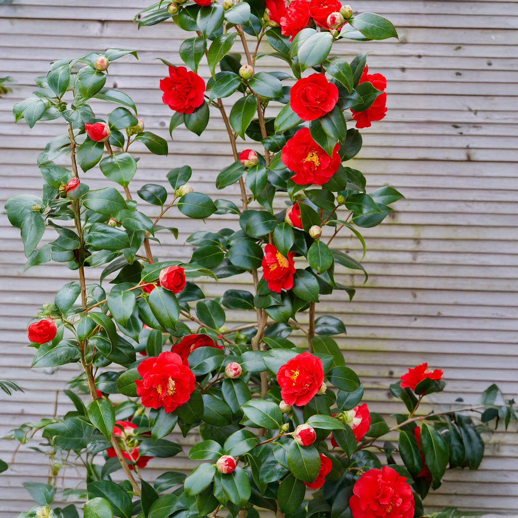 Camellia 'Blood of China' is a spectacular evergreen shrub, prized for bringing a burst of exotic and vibrant colour to the garden. Its main display comes from the large, semi-double, rich crimson-red flowers that erupt against its deep, glossy green leaves. Perfect for a sheltered, partially shaded spot with acid soil, this plant will provide a truly breathtaking show when few other shrubs are in bloom.