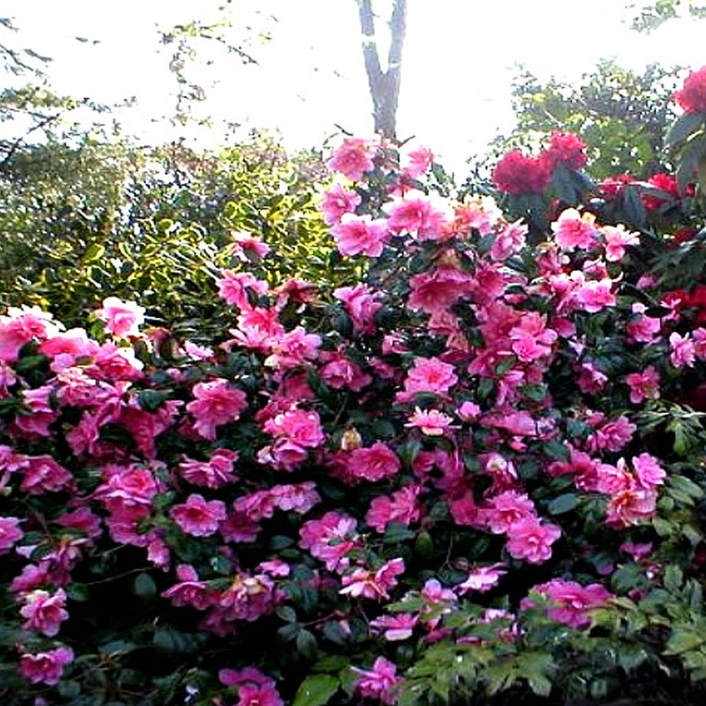 The “Donation” is a bushy, evergreen shrub which has leathery, ovate and glossy-green leaves. It produces vibrant pink, semi-double flowers. The deep-green foliage is prevalent throughout the year.