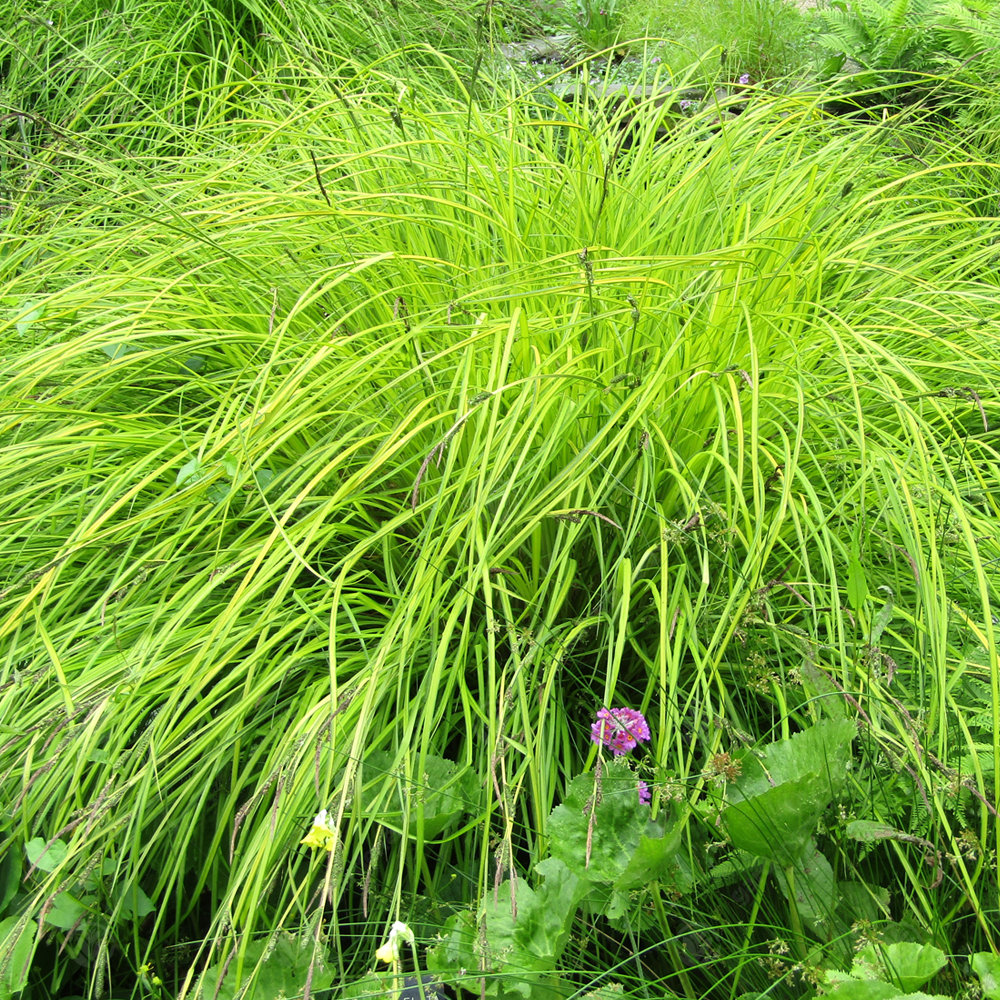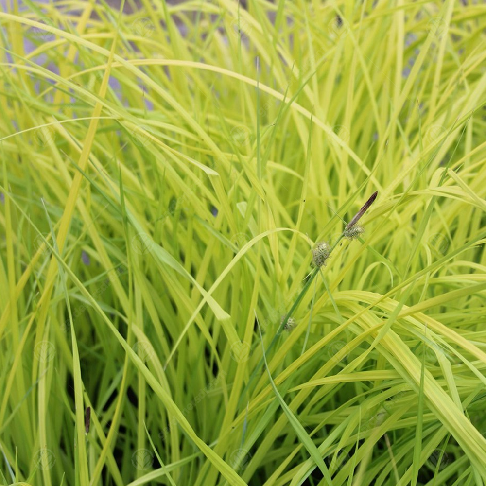 Carex ‘Aurea’ also known as ‘Bowle’s Golden’ is an evergreen perennial sedge that works perfectly as part of an ornamental layout or to brighten and add some colour to the more shaded areas of the garden. This grass grows well in areas and conditions where other plants may not fare as well, giving it great utility to fill out the lesser used areas in your outdoor spaces. It is also ideal for waterside planting for pond or water features. In the Summer it blooms long, erect spikes of small brown flowers.