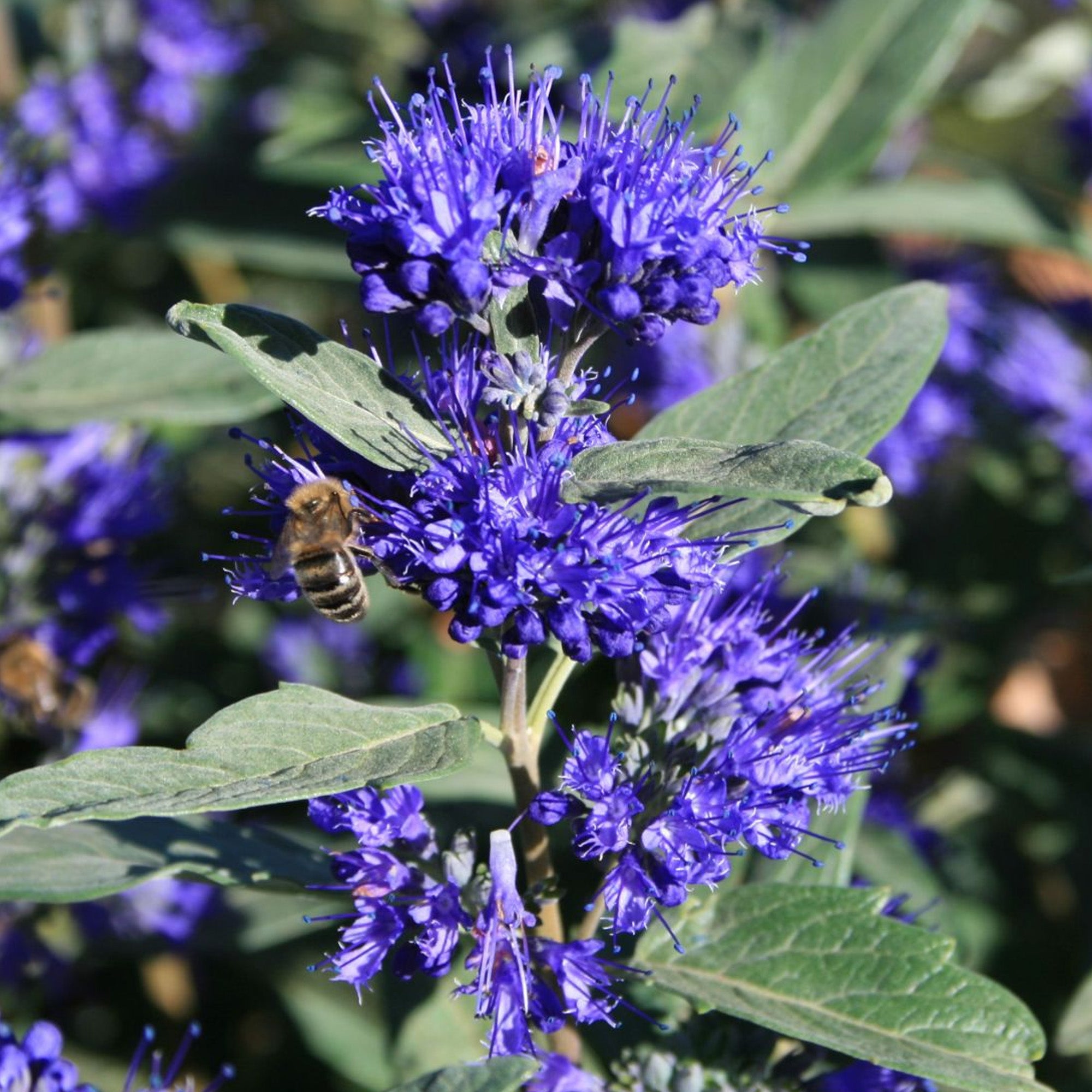 Caryopteris × clandonensis 'Grand Bleu', commonly known as Bluebeard 'Grand Bleu', is a compact deciduous shrub prized for its late summer to autumn display of deep blue flowers. The aromatic, dark green leaves provide a lush backdrop to the vibrant blooms, making it an excellent addition to mixed borders and wildlife gardens. Its dense, rounded habit ensures it remains neat and manageable, even in smaller garden spaces.