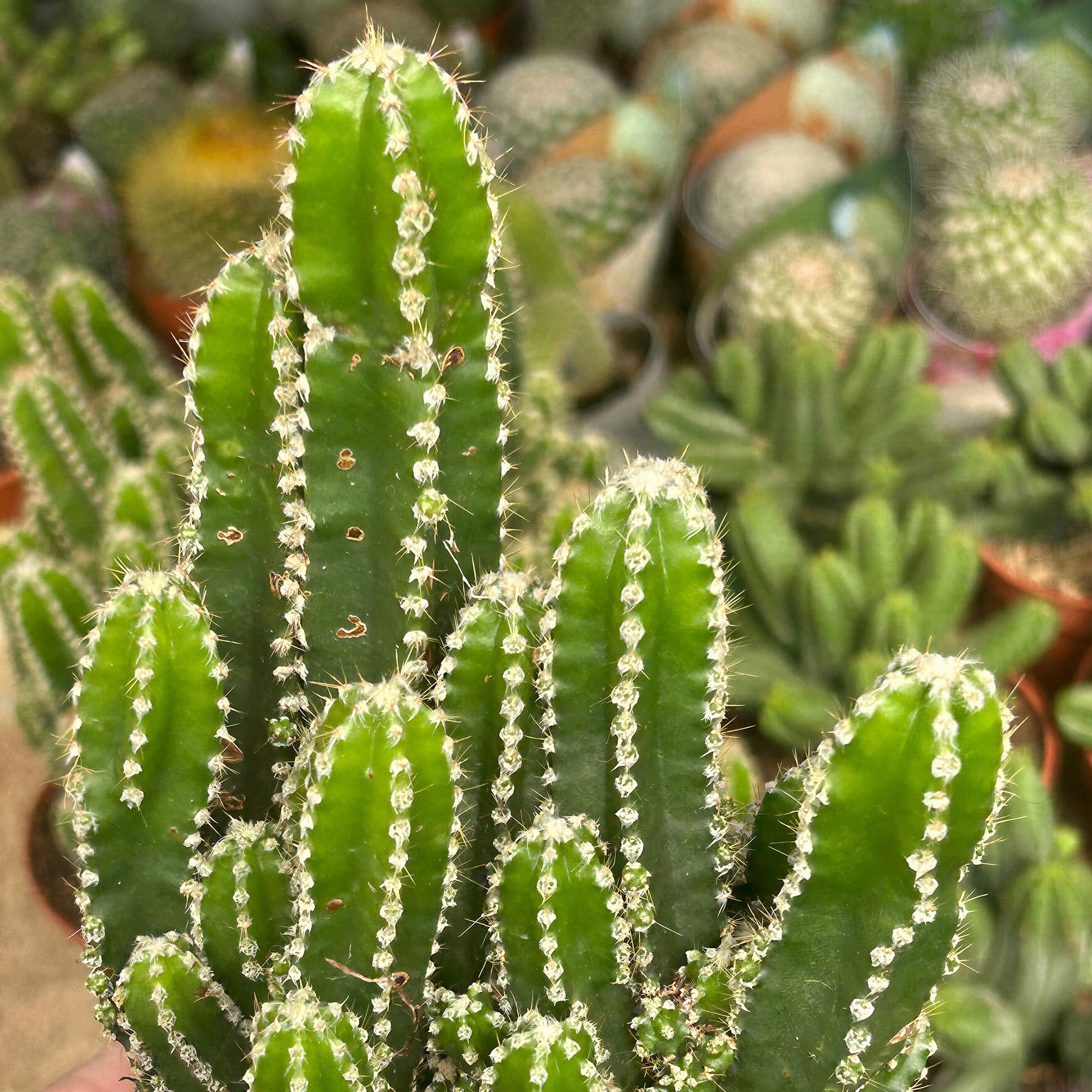Cereus peruvianus 'Florida' is a distinct strain of the Peruvian Apple Cactus, selected for its robust, columnar growth and attractive blue-green skin. It naturally branches as it matures, creating a tree-like silhouette that serves as a fantastic architectural feature in a bright room or conservatory. While young plants are purely structural, mature specimens are capable of producing large, spectacular white flowers that bloom at night, followed by thornless red fruits.