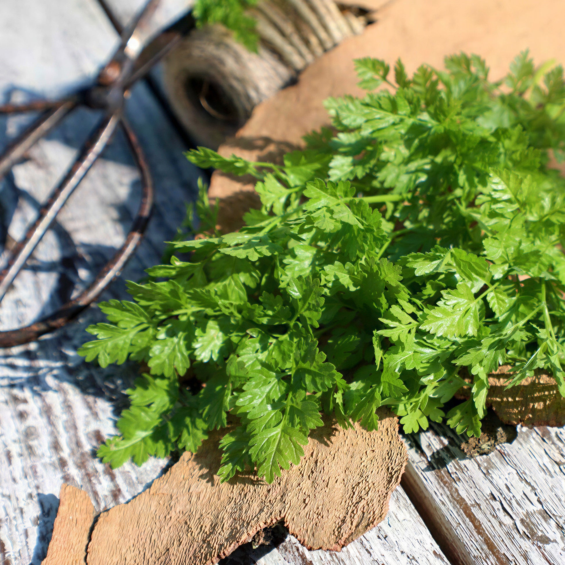 Possessing a mild aniseed flavour, chervil is a biennial herb grown for its leaves that are a key ingredient of fines herbes, or used to perk up salads, egg, potato and fish dishes. The flavour is lost if the herb is dried or cooked for too long, so add leaves just before the end of the cooking time. A useful herb for growing in a cool shady position outdoors.