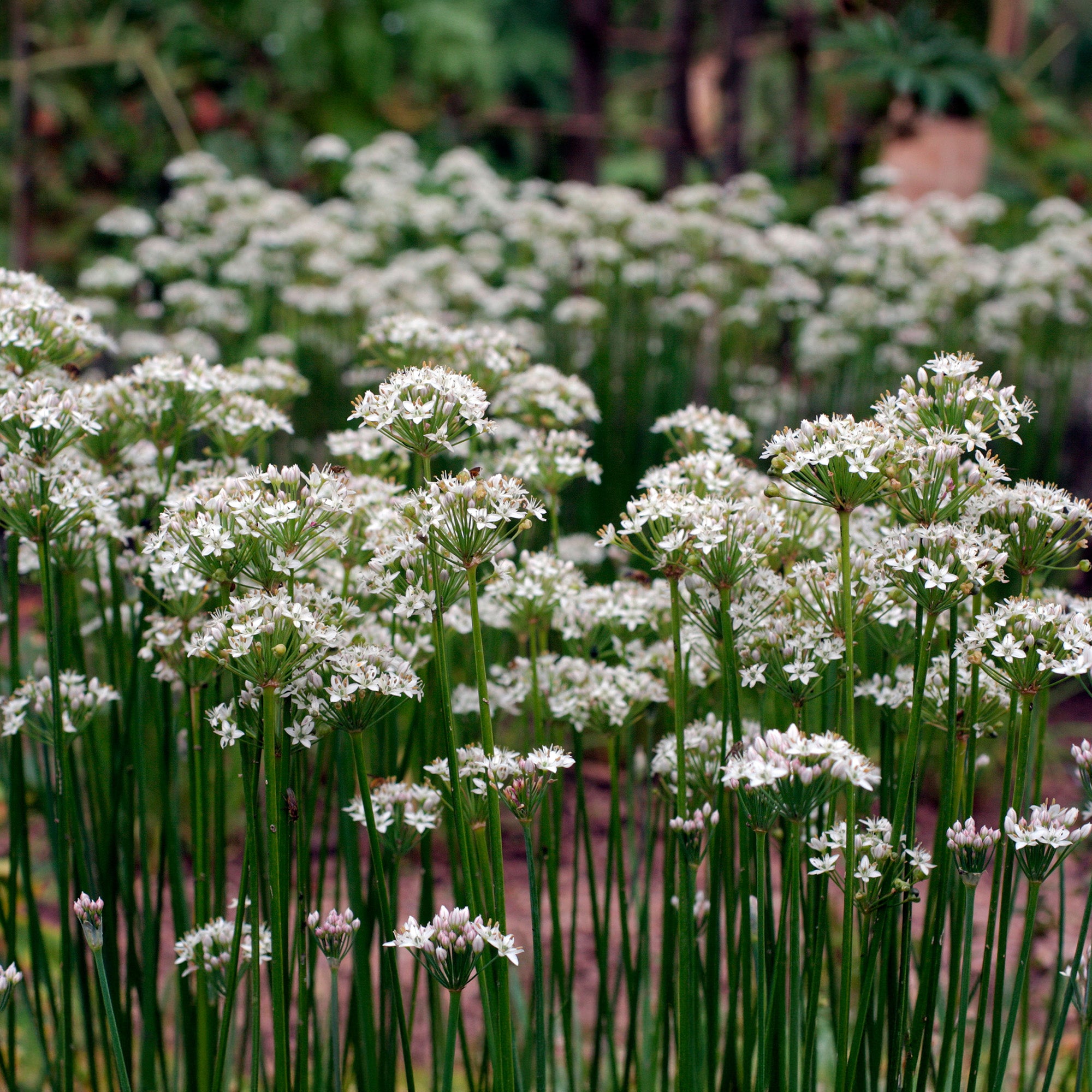 Before planting chives, water the ground thoroughly and dig in some well-rotted organic matter. Position the plants in full sun or partial shade in moist but well-draining soil, leaving 15-30cm between plants. Chives also grow well in containers that are at least 20cm wide.