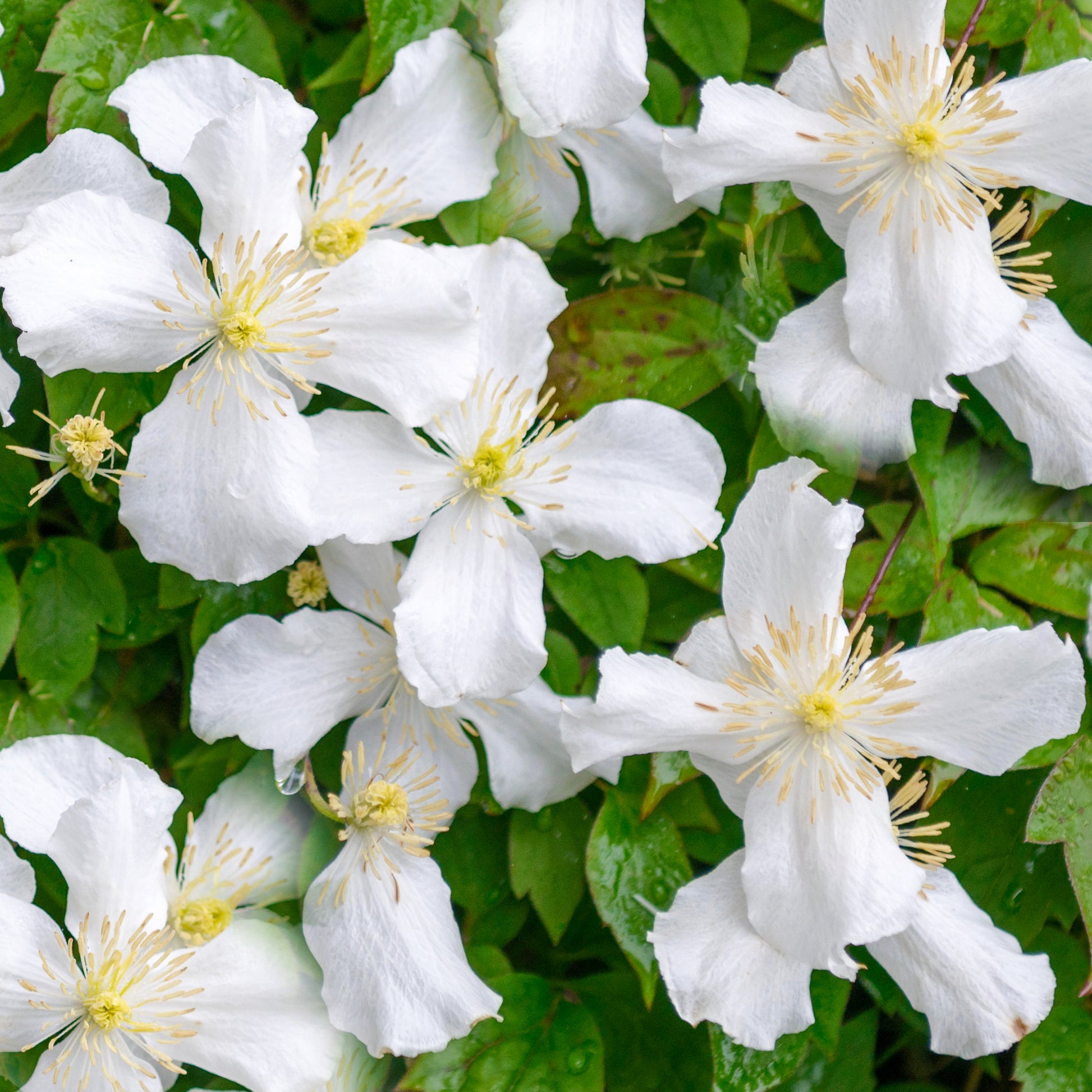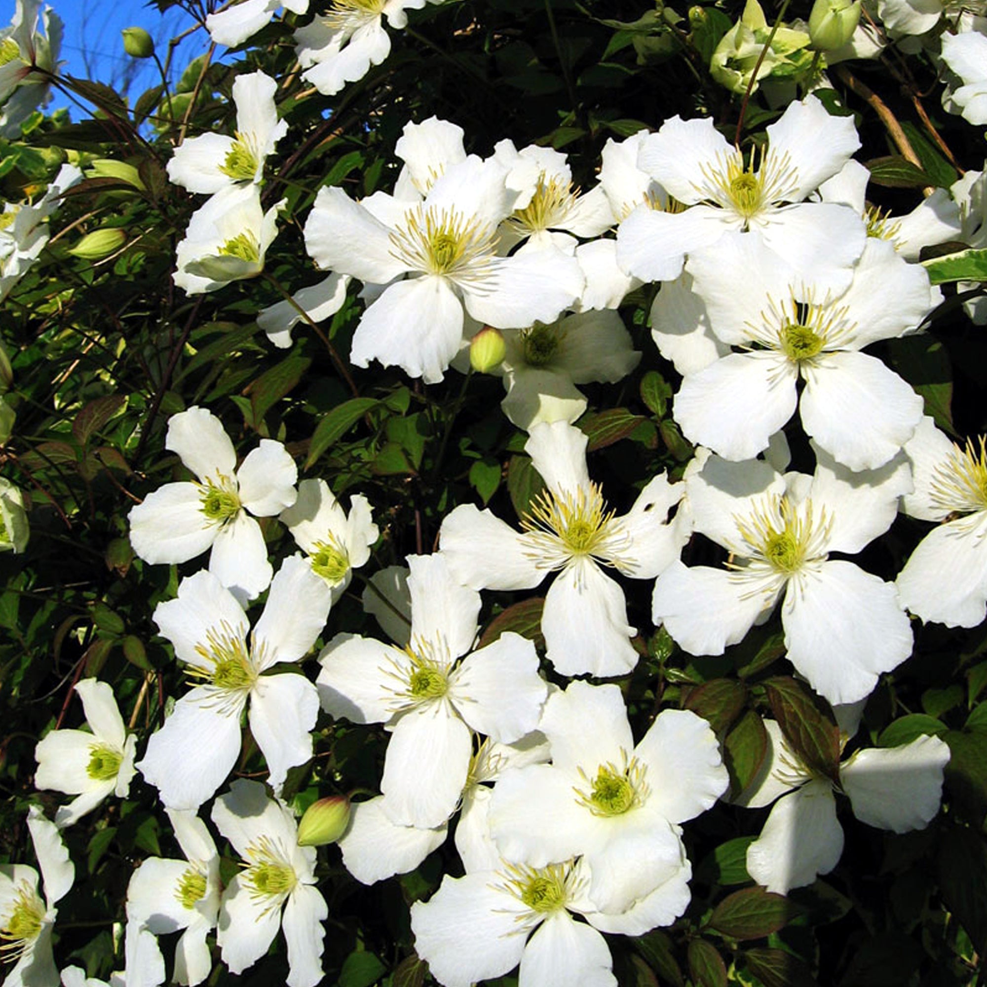 An especially fast growing variety of clematis, the Grandiflora will quickly establish itself in the garden with its vigorous growth and its beautifully contrasting dark green foliage as a backdrop to the profusion of small, pure white flowers which bloom all over the spreading vines from the early Spring and through to the Summer. A great option for trellis, fencing or wall training in a north-facing site.