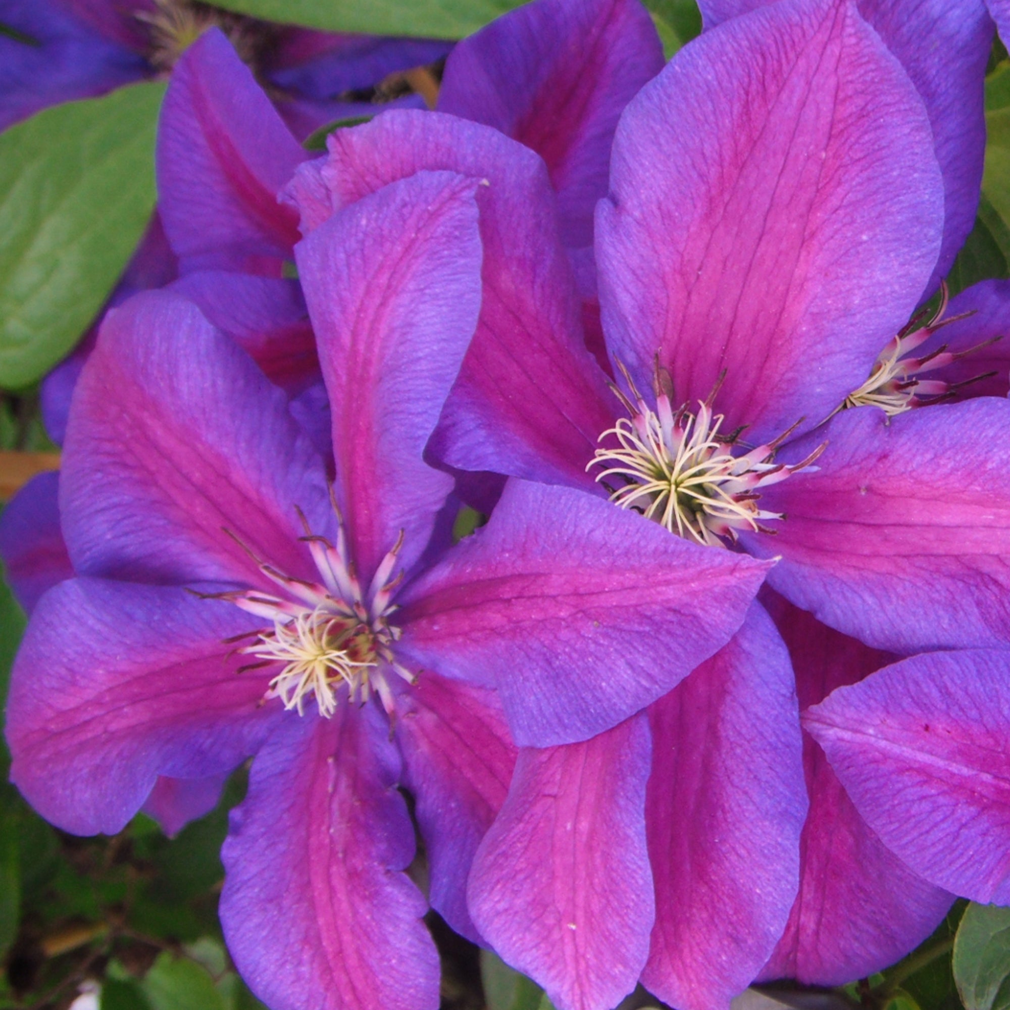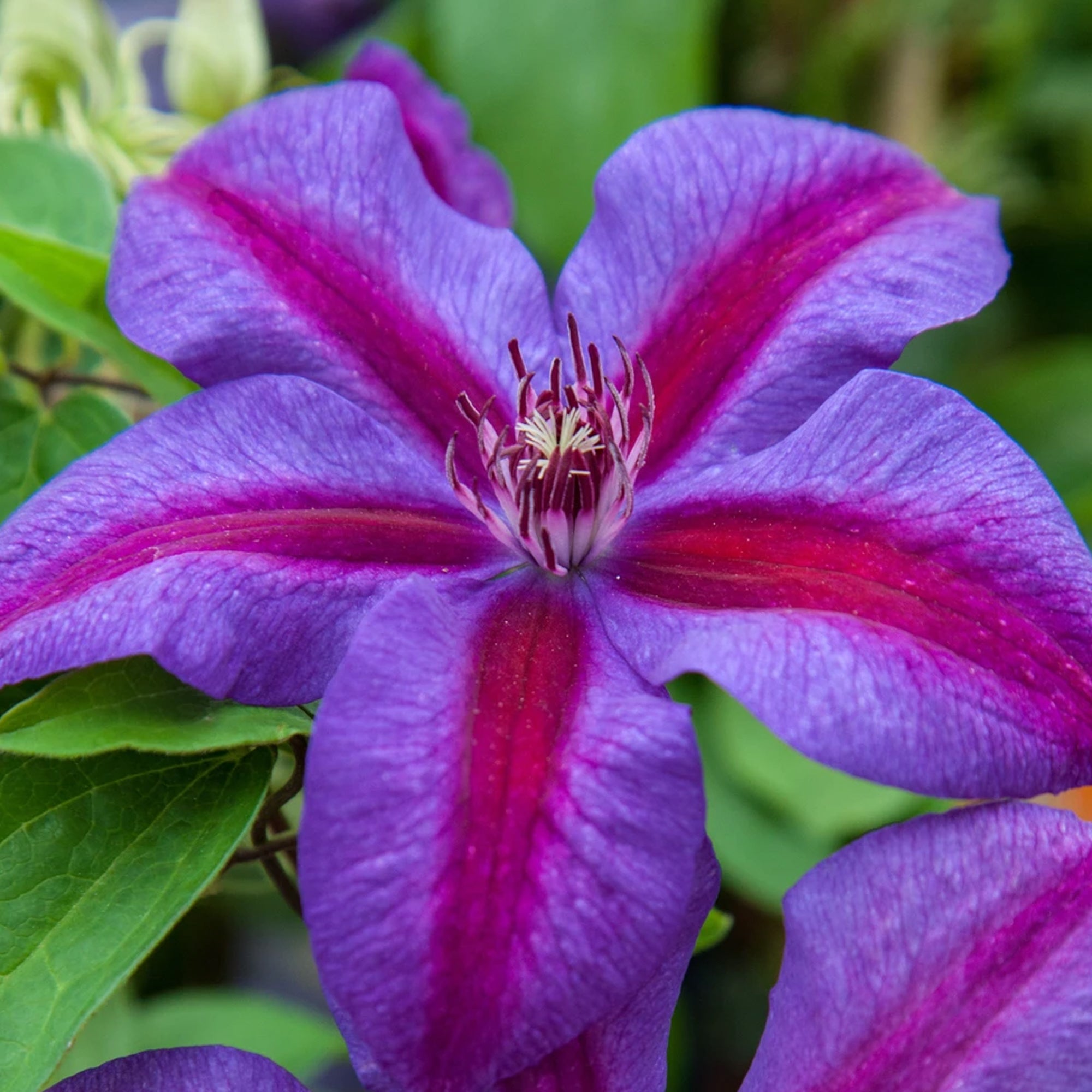 This beautiful Clematis Climber, originally founded by Nelly Thompson stands out for its large, purple flowers with deep red stripes. The flowers appear twice a year, usually between spring and autumn. The flowers grow exceptionally tall and enjoy like all clematis, covering a trellis or climbing through a neighbouring tree. This clematis likes sun but with its roots in the shade.
