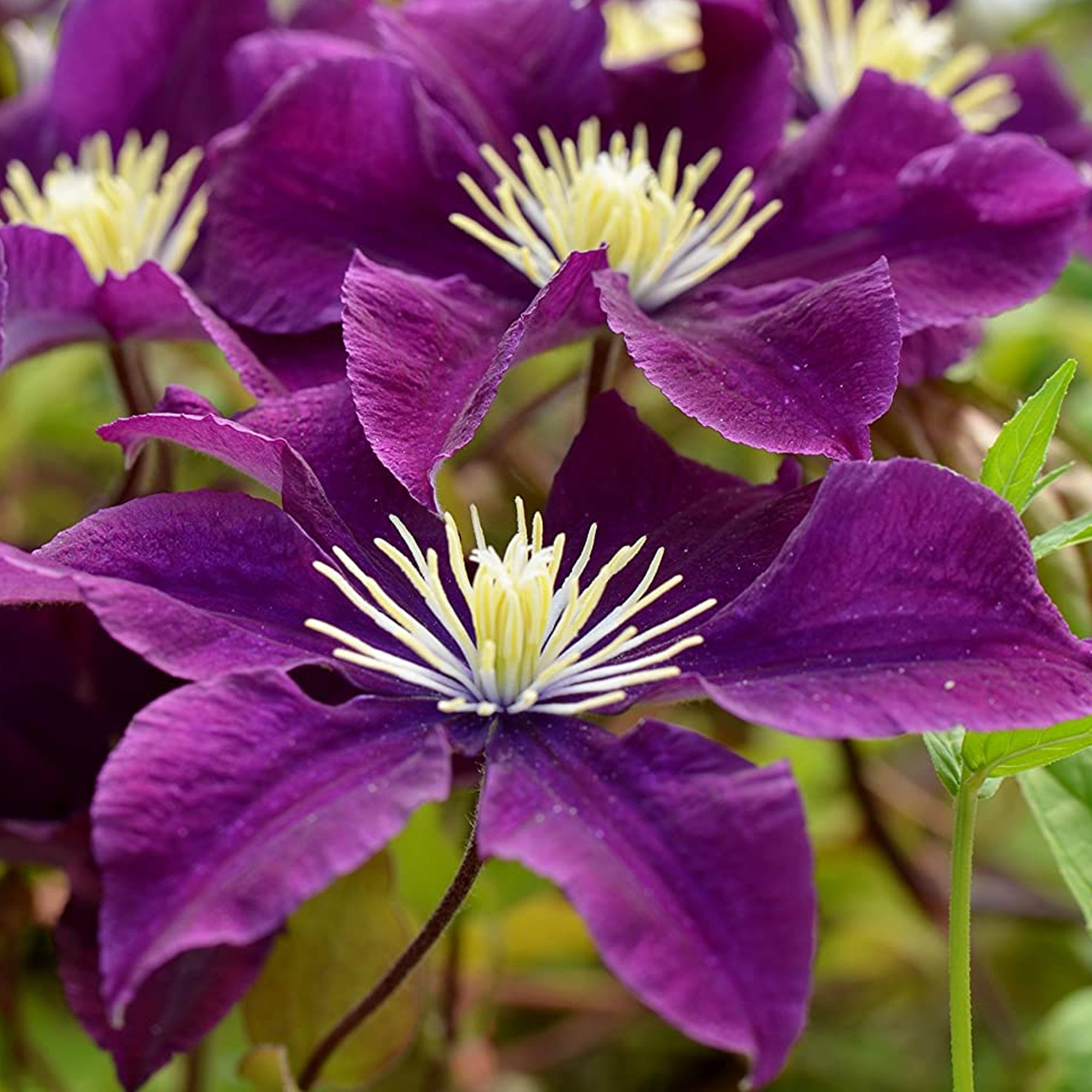Clematis patens Warszawska is a deciduous, climbing vine plant that bears gorgeous, large flowers when they bloom in Spring and last until late Summer. The deep purple colour, the lush, green foliage and the bright white, spike-like feature in the centre of each flower will bring an attractiveness to any walls or fence this plant climbs up. It should be planted in moist, well drained soil, with watering being less of an issue due to the low maintenance nature of this Clematis. Finally, placing the plant in full sunlight will ensure the blooms retain their great colour in their growing season.