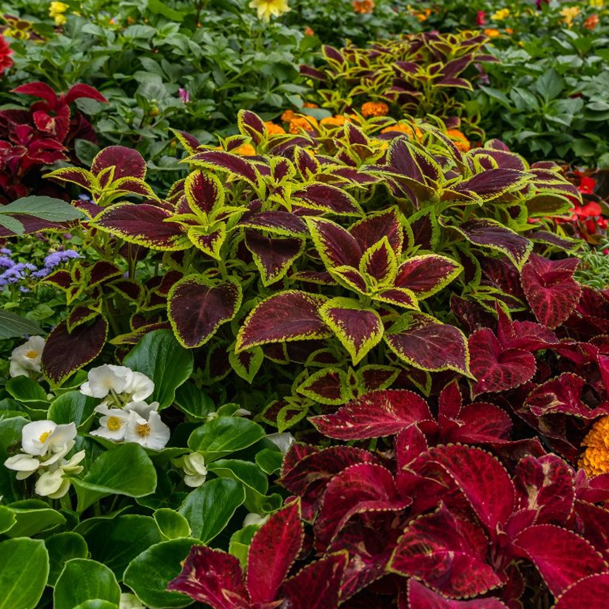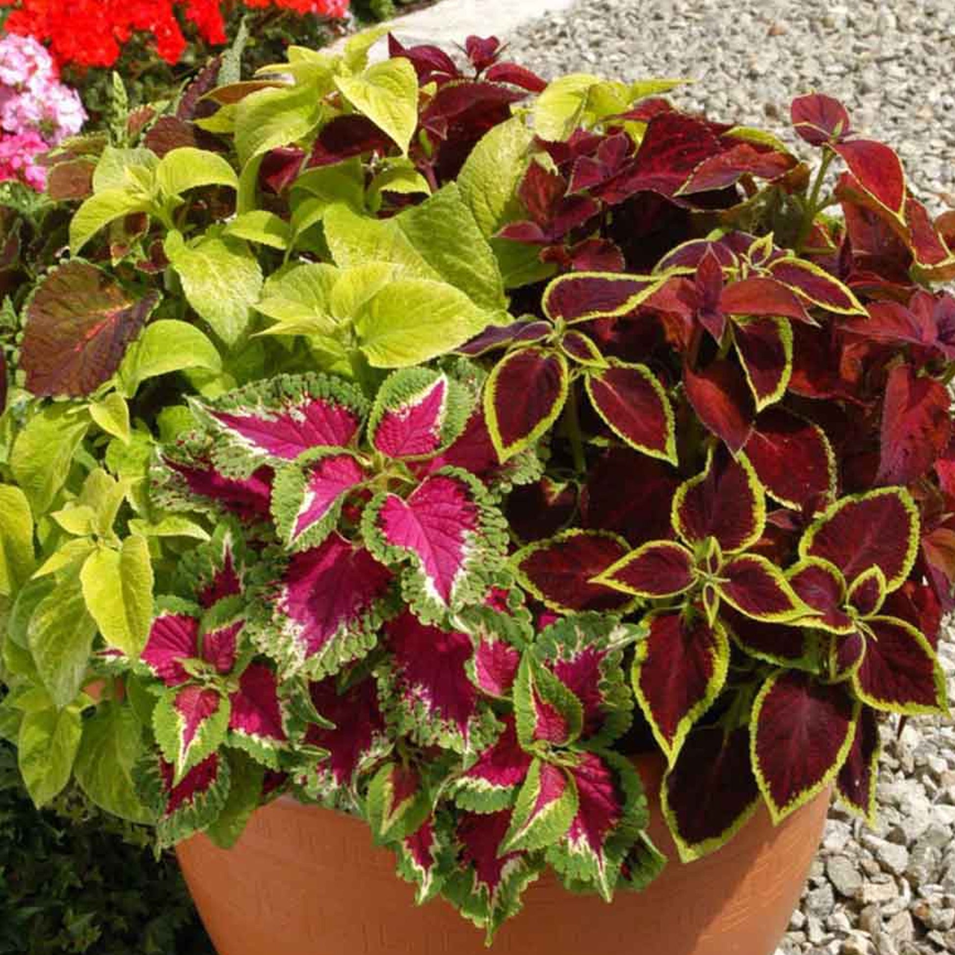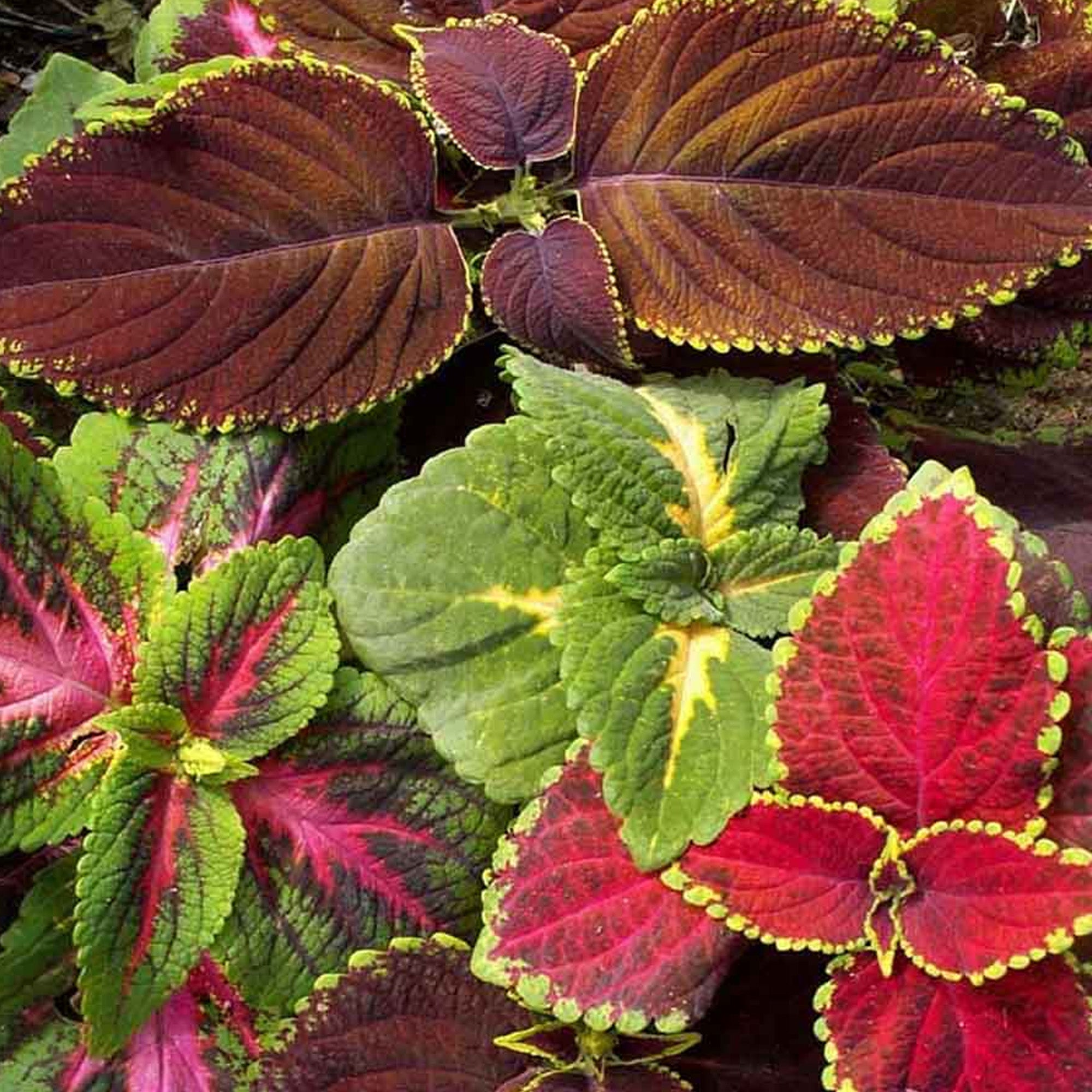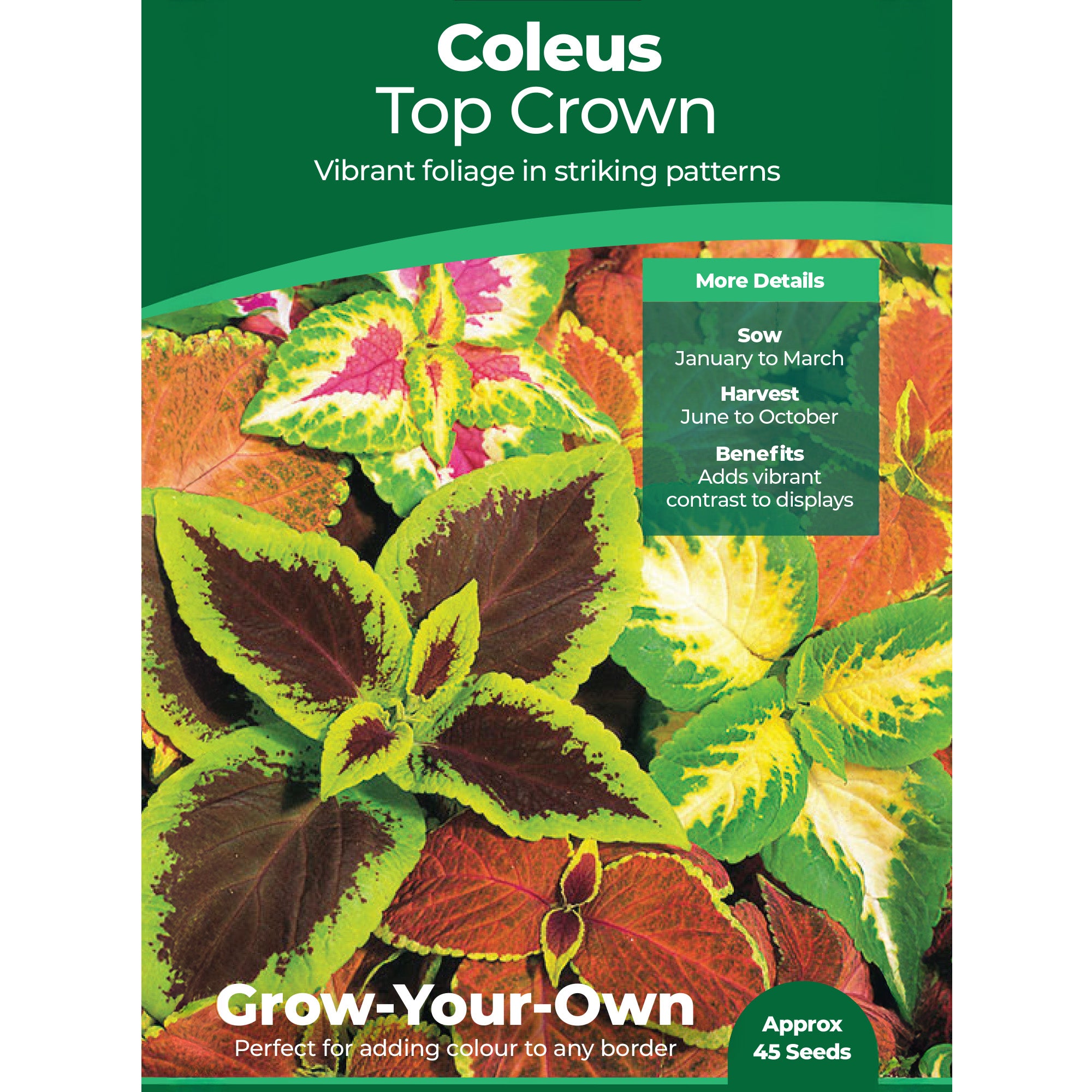 Coleus Top Crown is ideal for bringing colour and texture interest to beds, borders, and pots, filling any gaps between flowers with vividly coloured foliage. For this reason, Coleus is also known by the common name, Painted Nettle. Top Crown is a unique blend of different leaf types and hues, including shades of green, yellow, bronze, burgundy, and copper.