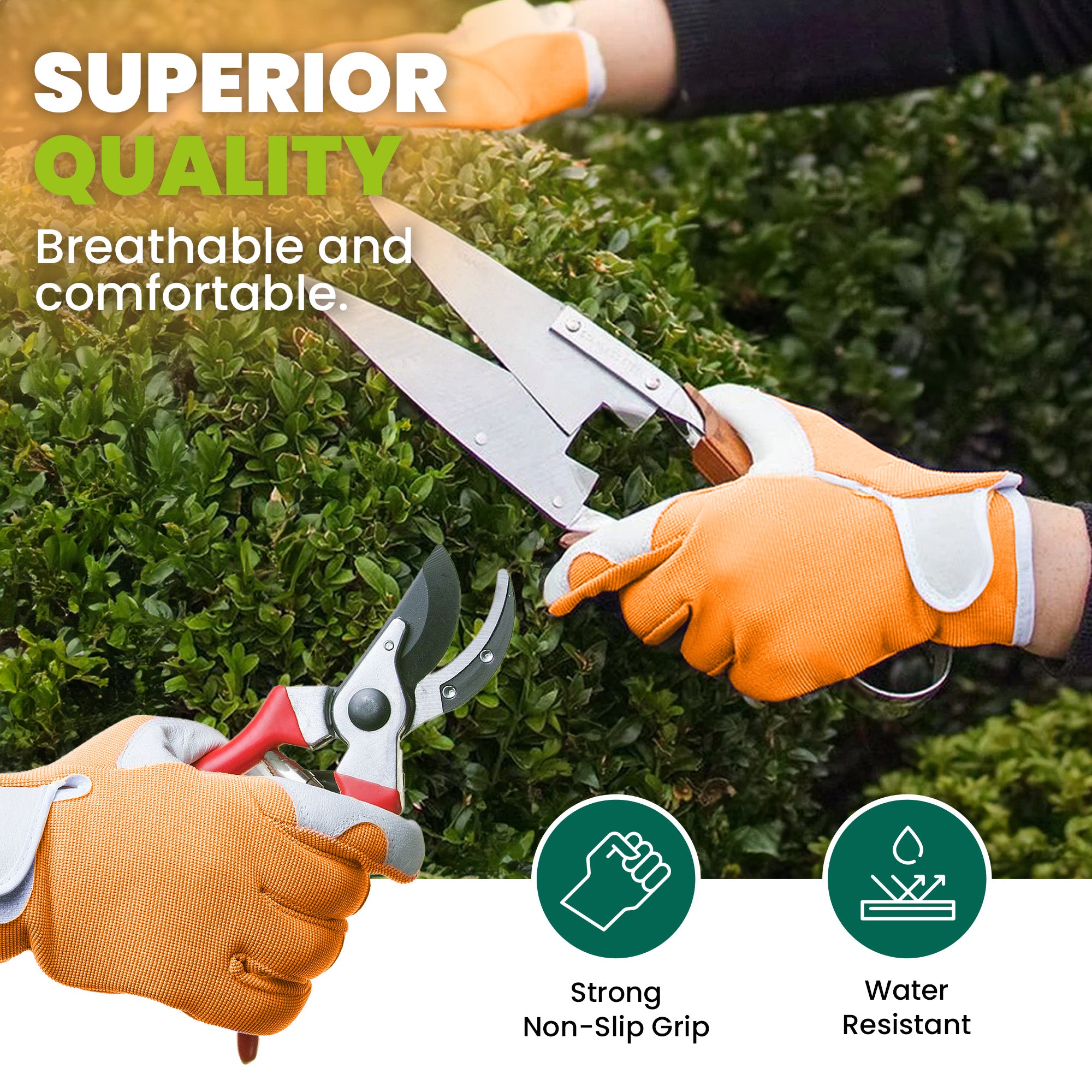Gardeners Dream ® Gardening gloves have been designed to incorporate fashion, comfort and quality. The stylish design fits fantastically snug to your hands, allowing for extra finger sensitivty. Premium leather for durability, resiliance, grip and abrasion resistance. Nylon back for breathability and comfort.