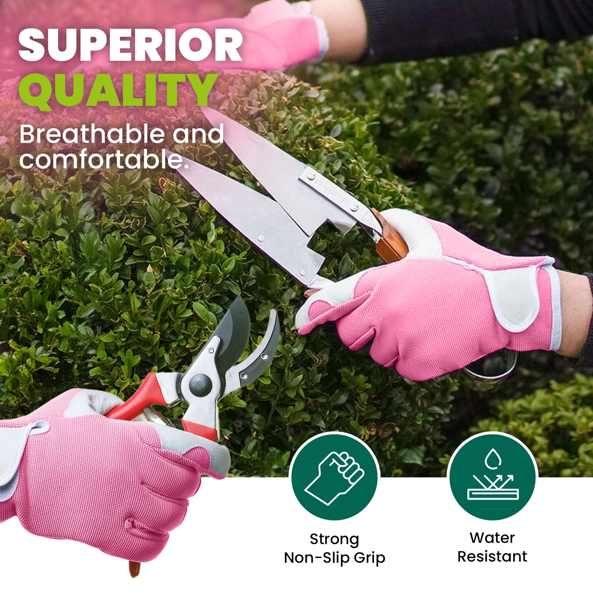 Gardeners Dream ® Gardening gloves have been designed to incorporate fashion, comfort and quality. The stylish design fits fantastically snug to your hands, allowing for extra finger sensitivty. Premium leather for durability, resiliance, grip and abrasion resistance. Nylon back for breathability and comfort.