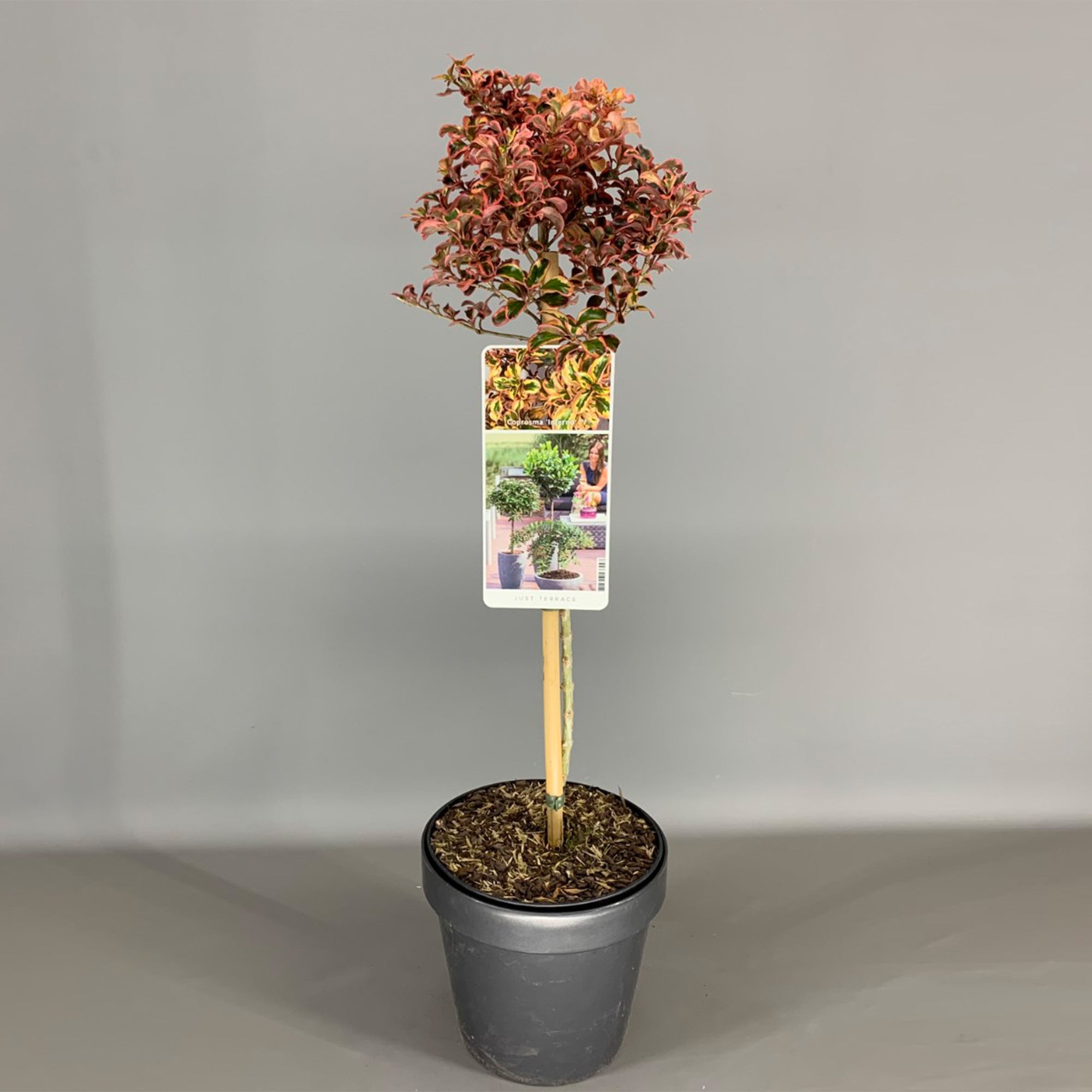 Also known as mirror plant, coprosma inferno is often grown as a shrub. However, trained into a patio tree shape, it makes an excellent year-round plant for garden design. Patio trees provide height and structure to an outdoor space and the evergreen nature of coprosma inferno provides plenty of colour interest throughout the year.