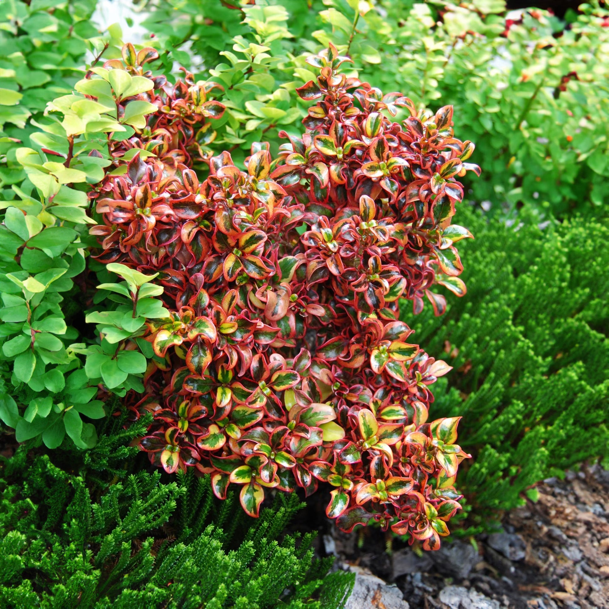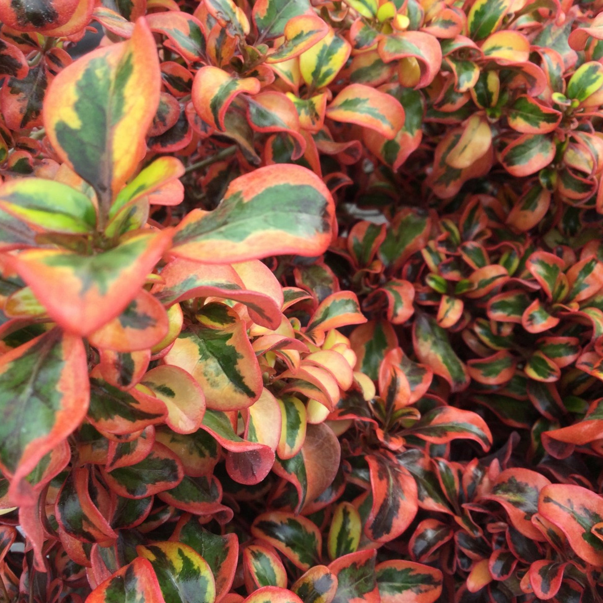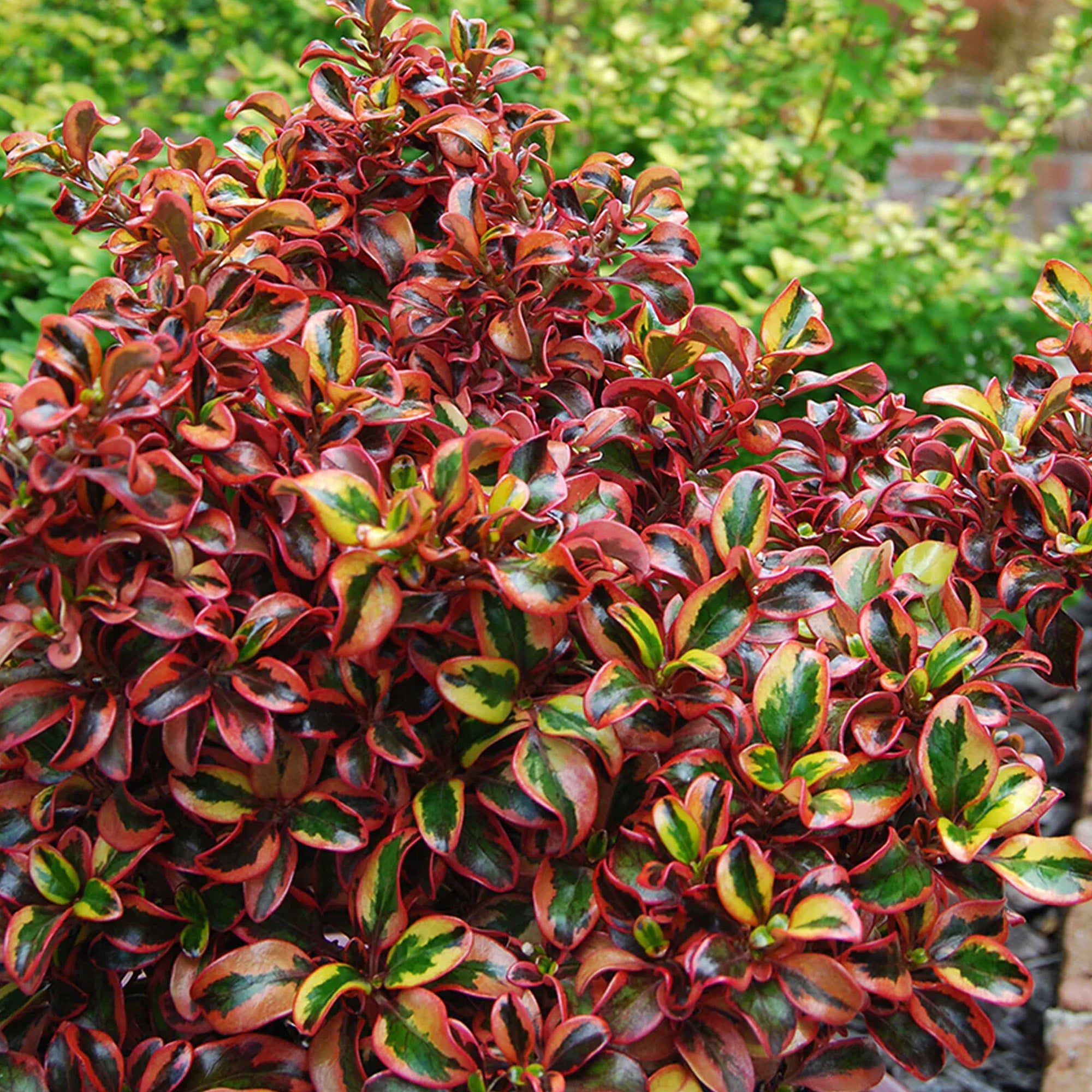 This patio tree has an exceptionally interesting colour scheme. In spring and summer, its glossy green leaves are edged in yellow-orange tones. The green is flushed with deep purple in autumn and winter when the edging turns a dramatic shade of red. Insignificant flowers and berries may appear on mature plants.