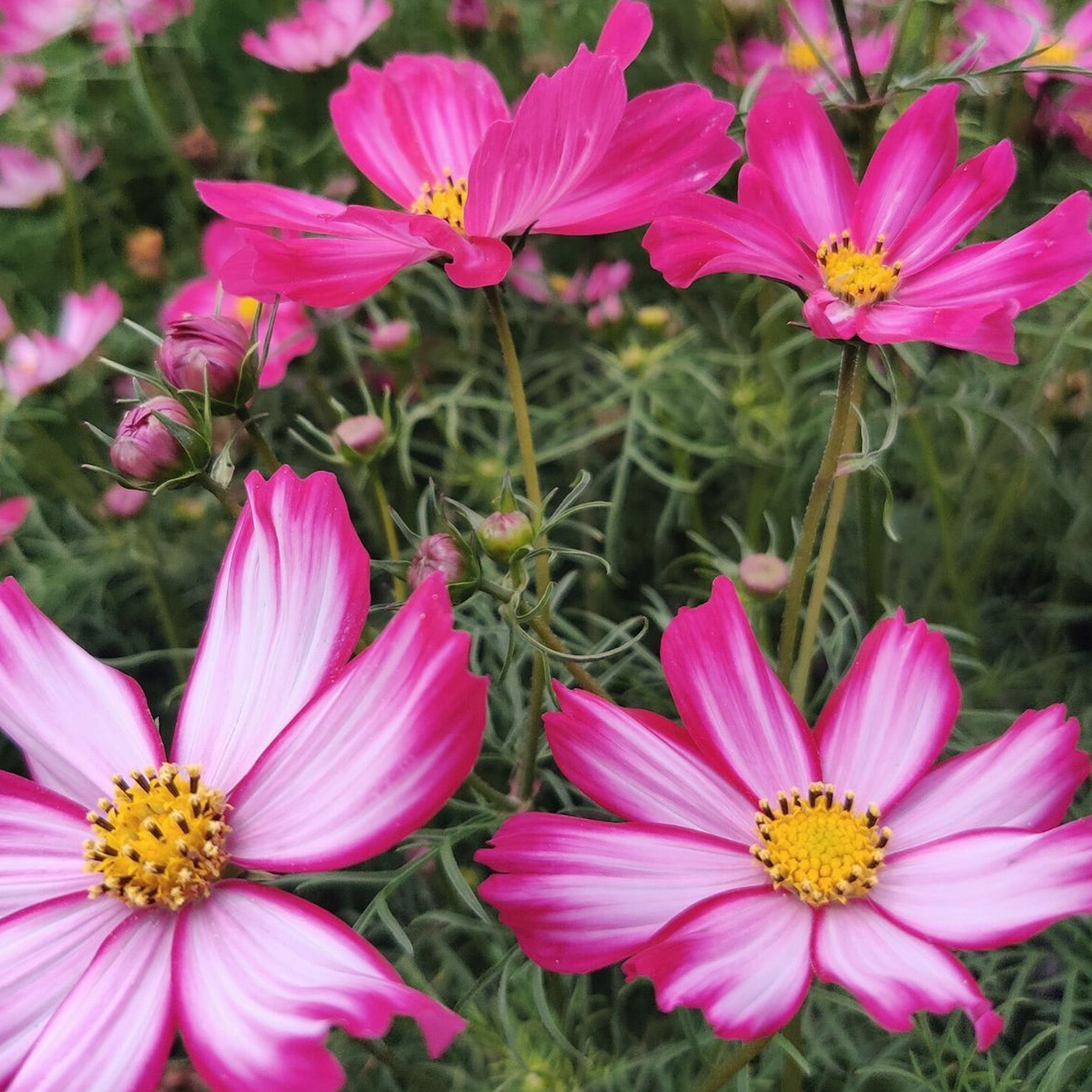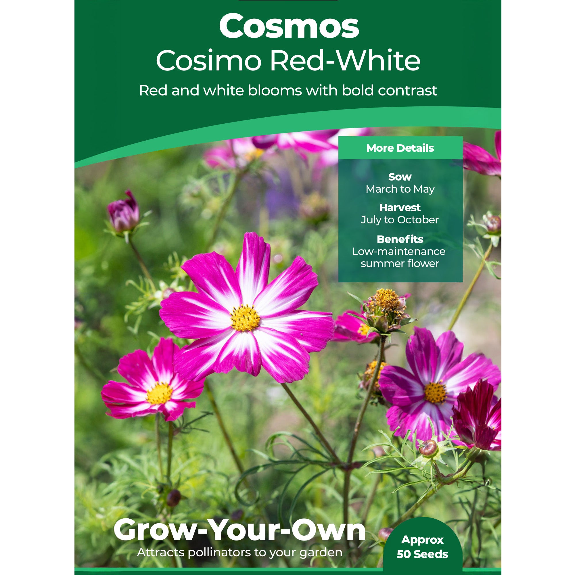 Cosmos Cosimo Red-White creates an eye-catching display in beds and borders and will be the envy of your neighbours. It is also well-suited to container gardening and looks stunning in pots, window boxes, and hanging baskets.