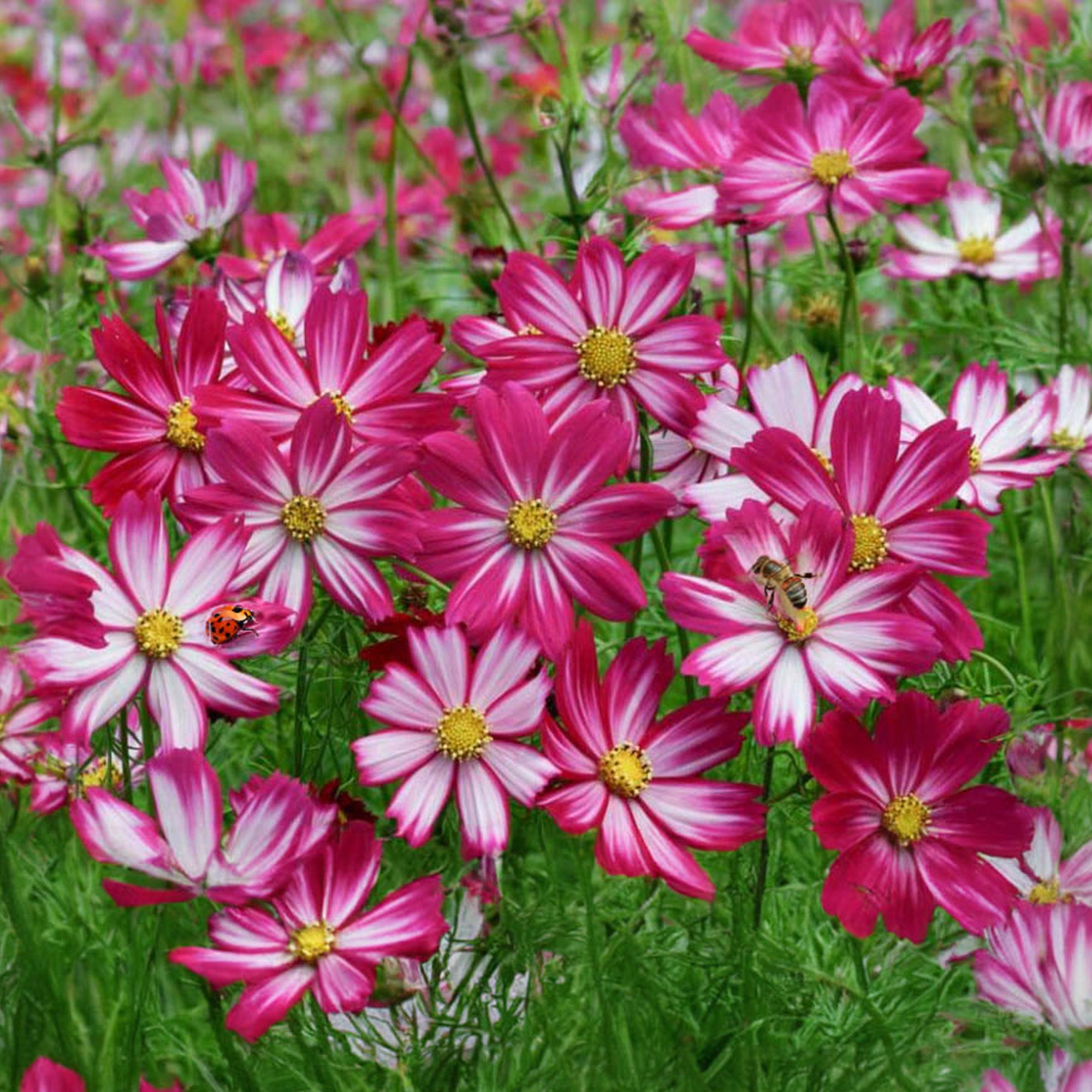 Brimming with cheerfulness, this striking Cosmos variety has a compact, bushy shape with deeply divided, fern-like foliage. From July all the way to October, it is covered with masses of daisy-like bi-colour red flowers striped with white. These blooms are a magnet for pollinators, enticing bees and butterflies into the garden all summer long.